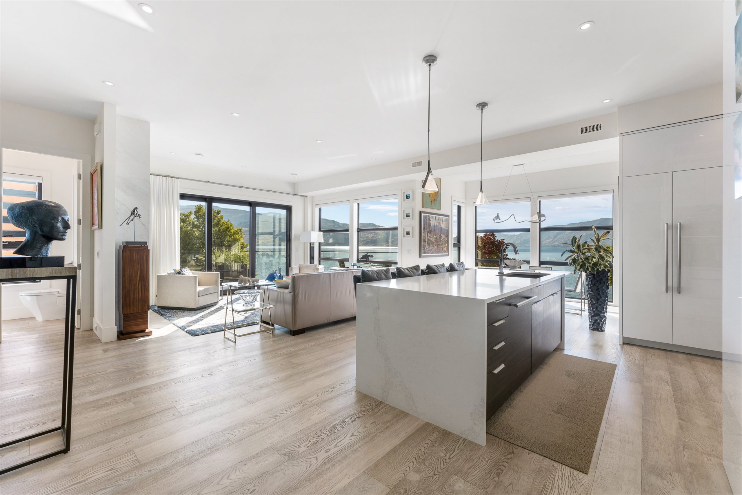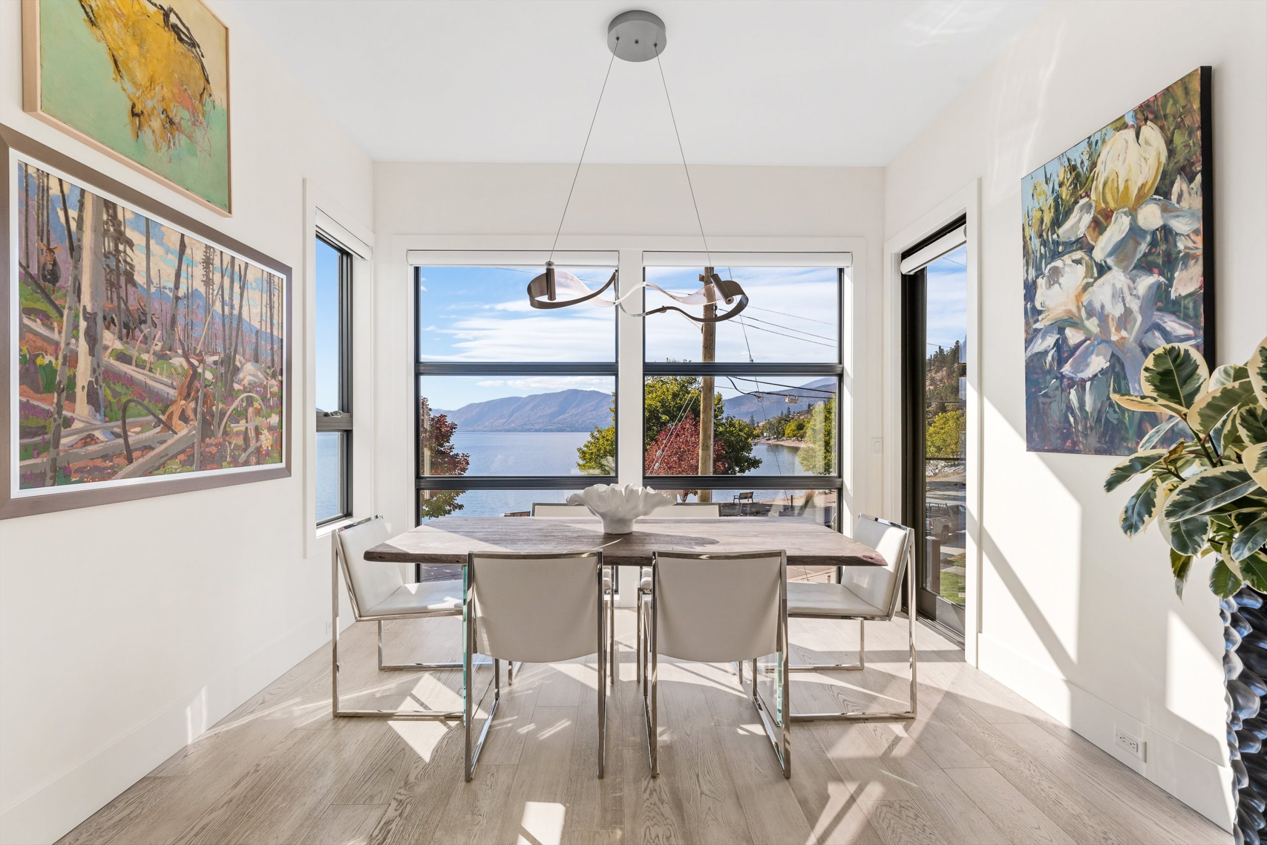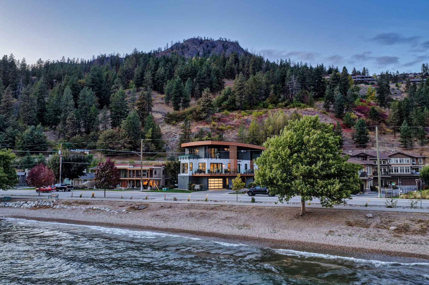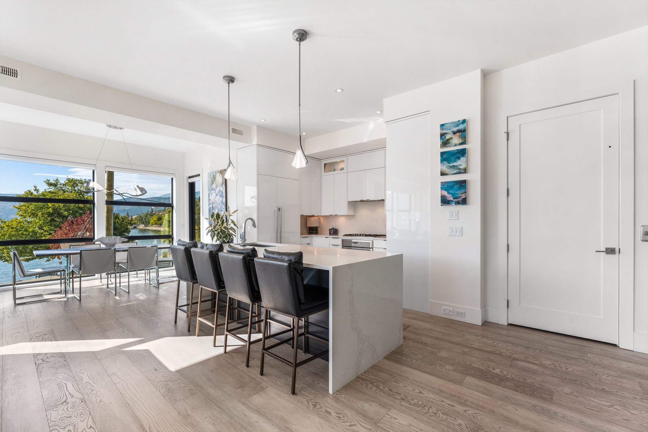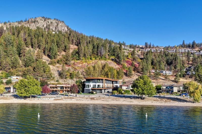 Set in the heart of Peachland’s vibrant waterfront, this architecturally striking residence by Lakepoint Homes offers refined design and a seamless connection to the Okanagan lifestyle. One of only seven exclusive homes, this end unit sits closest to the water, just steps from the beach, cafe’s, and boutique shops along Beach Avenue. Soaring 10-ft ceilings and floor-to-ceiling Marvin windows flood the interior with natural light, while wide-plank white oak floors and a floating glass staircase add a sense of understated sophistication. The open-concept main level is ideal for entertaining, featuring a chef’s kitchen with Thermador appliances, quartz surfaces, and a statement island that flows into the dining and living areas, framed by panoramic lake and mountain views.