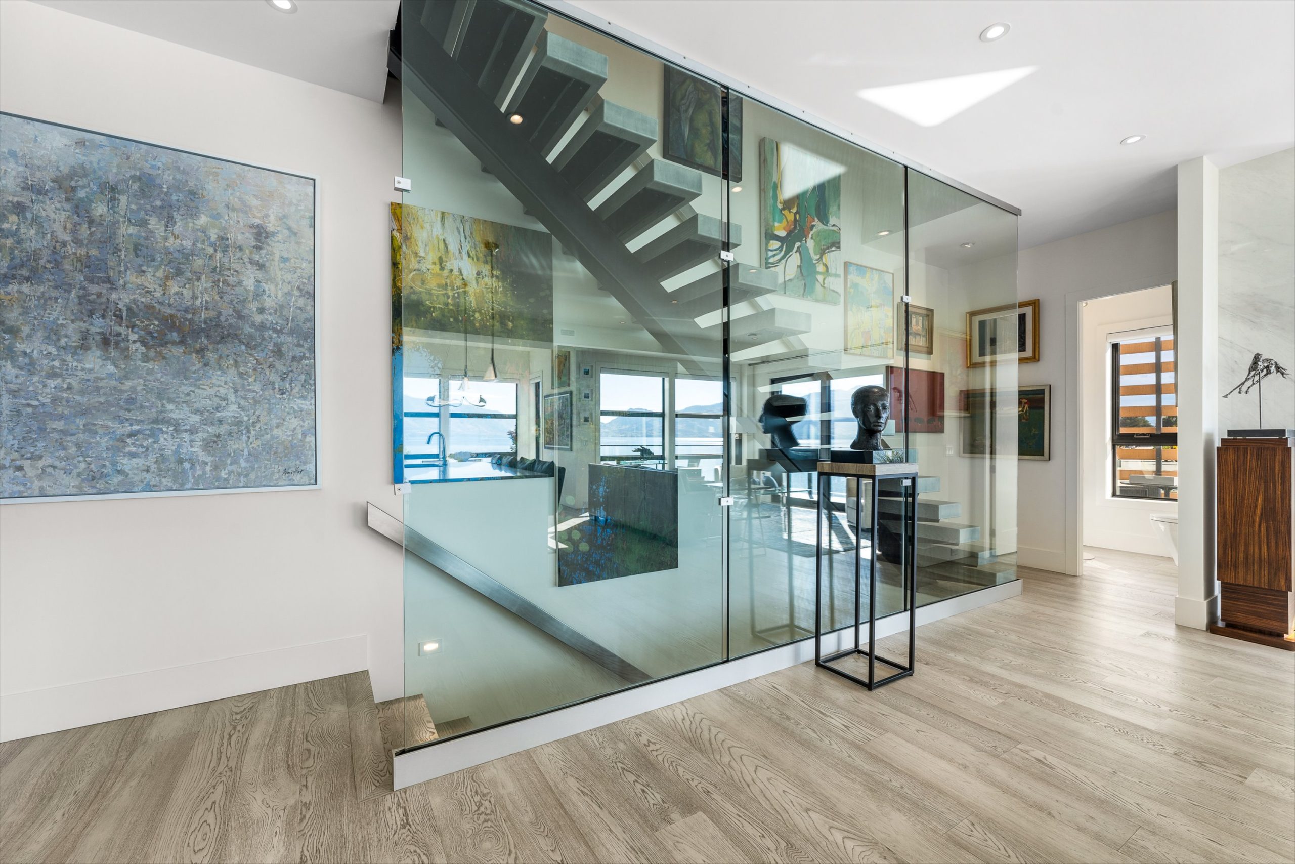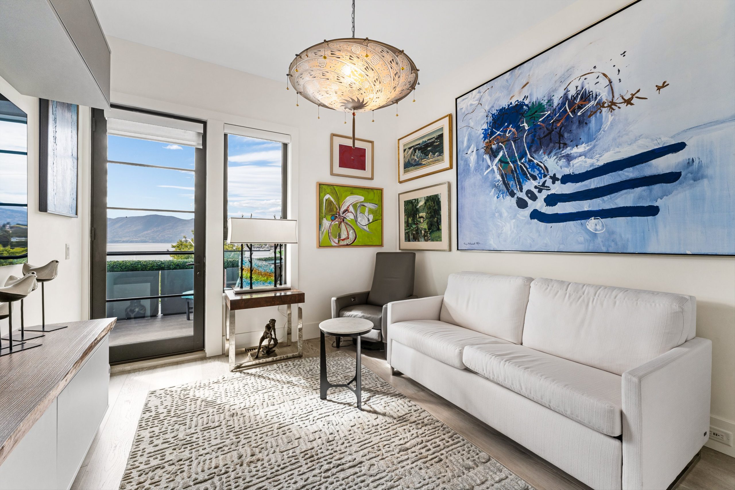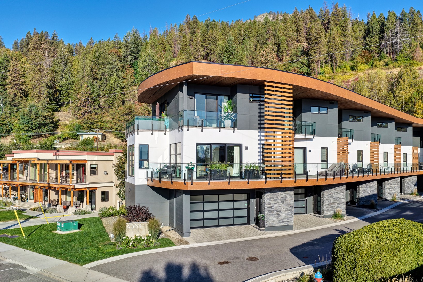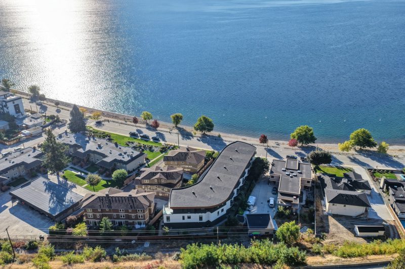 Set in the heart of Peachland’s vibrant waterfront, this architecturally striking residence by Lakepoint Homes offers refined design and a seamless connection to the Okanagan lifestyle. One of only seven exclusive homes, this end unit sits closest to the water, just steps from the beach, cafe’s, and boutique shops along Beach Avenue. Soaring 10-ft ceilings and floor-to-ceiling Marvin windows flood the interior with natural light, while wide-plank white oak floors and a floating glass staircase add a sense of understated sophistication. The open-concept main level is ideal for entertaining, featuring a chef’s kitchen with Thermador appliances, quartz surfaces, and a statement island that flows into the dining and living areas, framed by panoramic lake and mountain views.