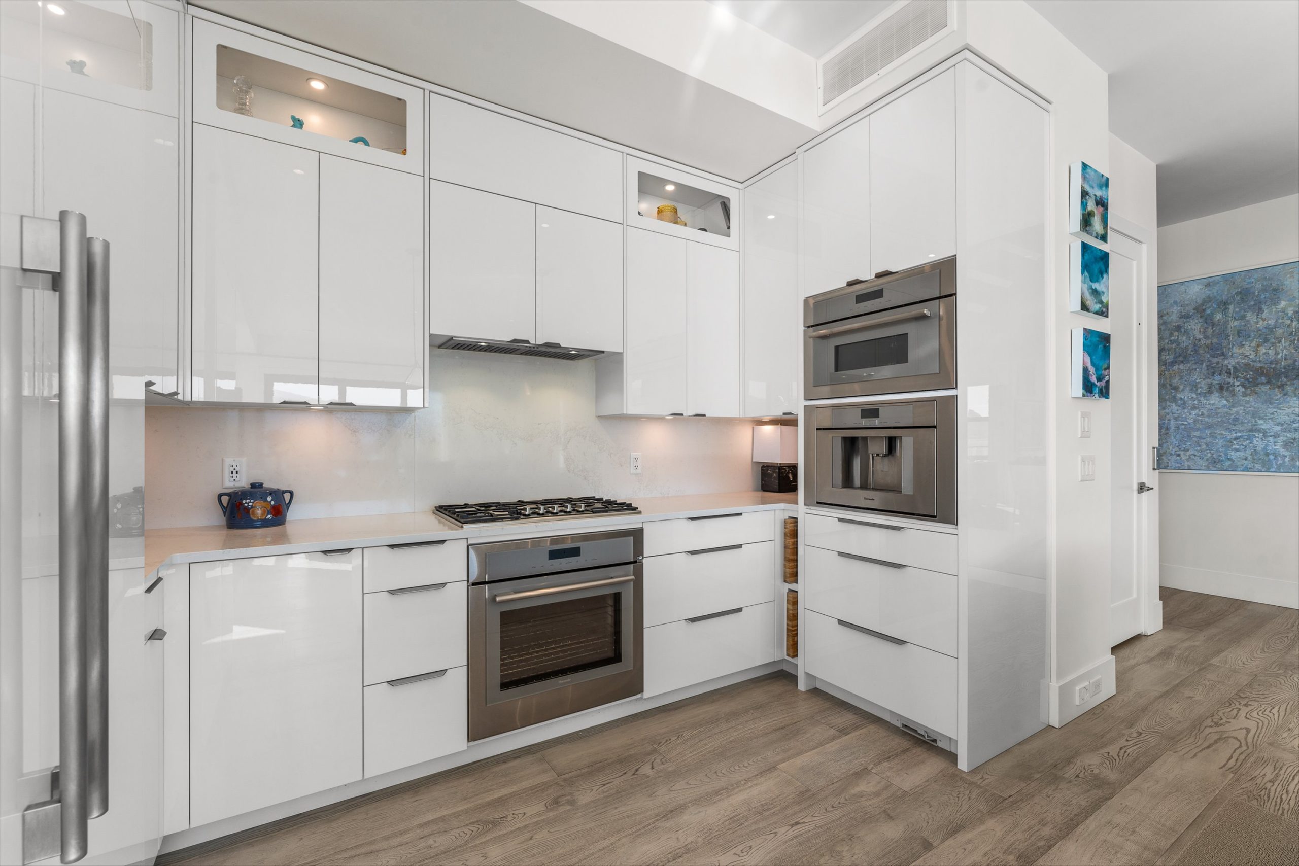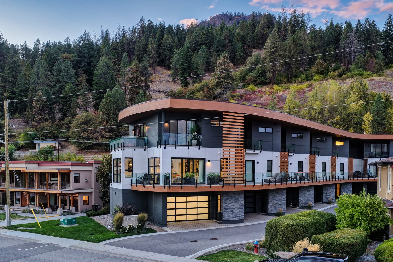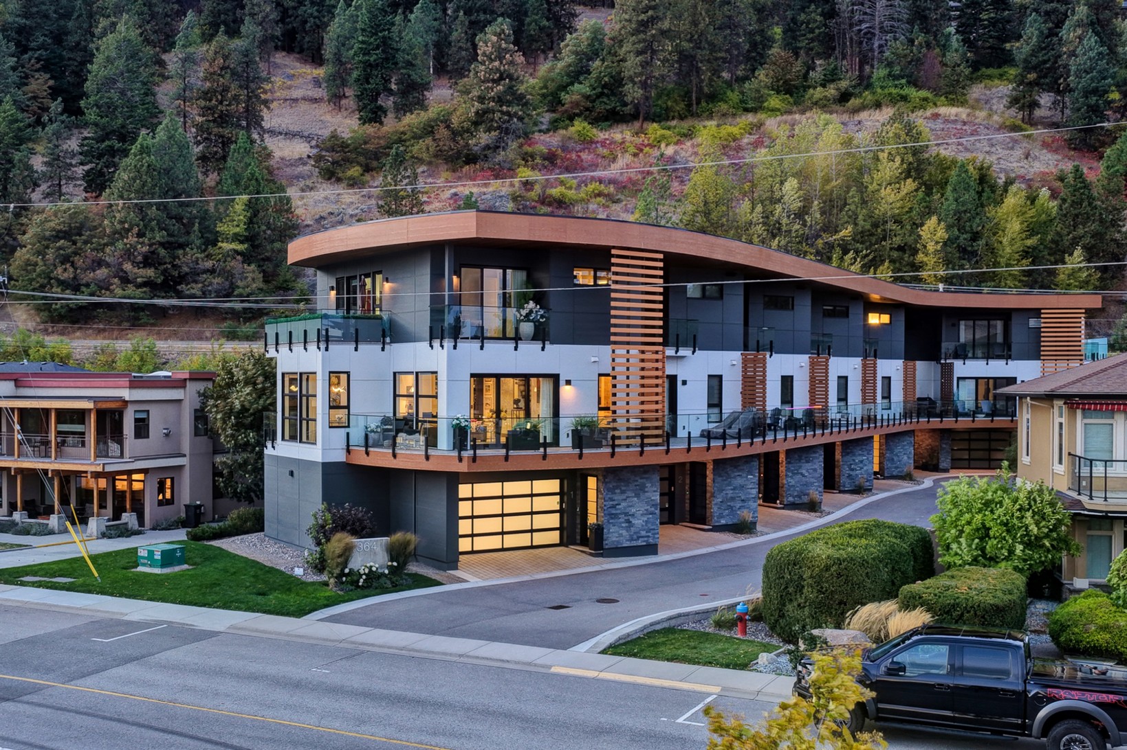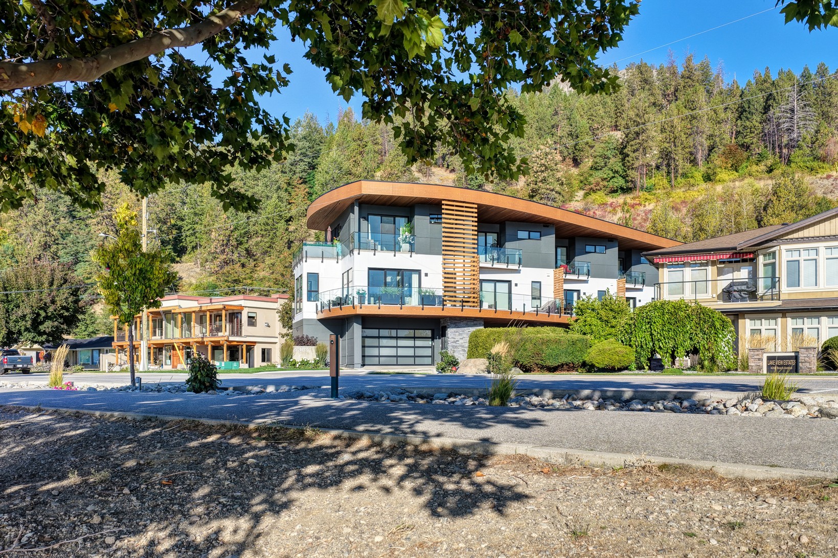 Set in the heart of Peachland’s vibrant waterfront, this architecturally striking residence by Lakepoint Homes offers refined design and a seamless connection to the Okanagan lifestyle. One of only seven exclusive homes, this end unit sits closest to the water, just steps from the beach, cafe’s, and boutique shops along Beach Avenue. Soaring 10-ft ceilings and floor-to-ceiling Marvin windows flood the interior with natural light, while wide-plank white oak floors and a floating glass staircase add a sense of understated sophistication. The open-concept main level is ideal for entertaining, featuring a chef’s kitchen with Thermador appliances, quartz surfaces, and a statement island that flows into the dining and living areas, framed by panoramic lake and mountain views.