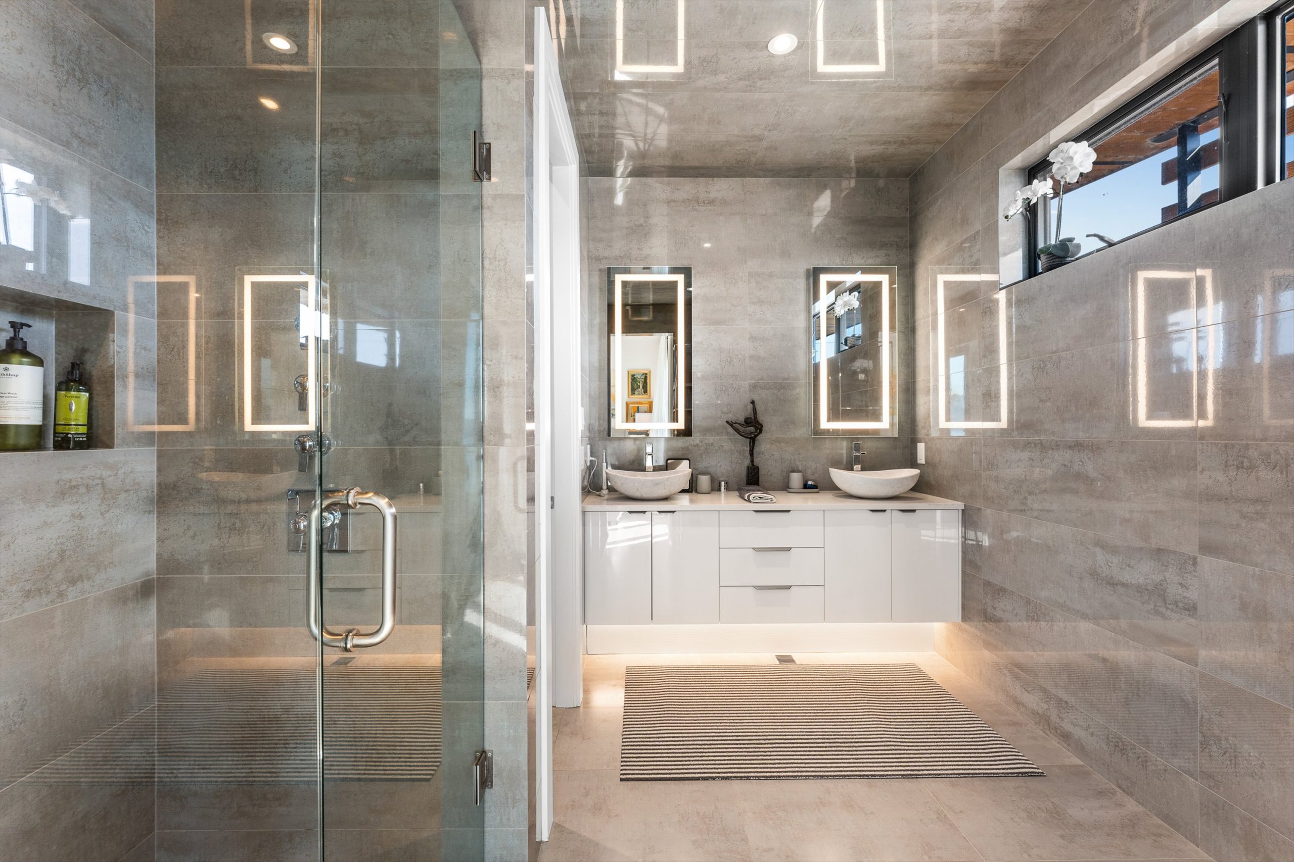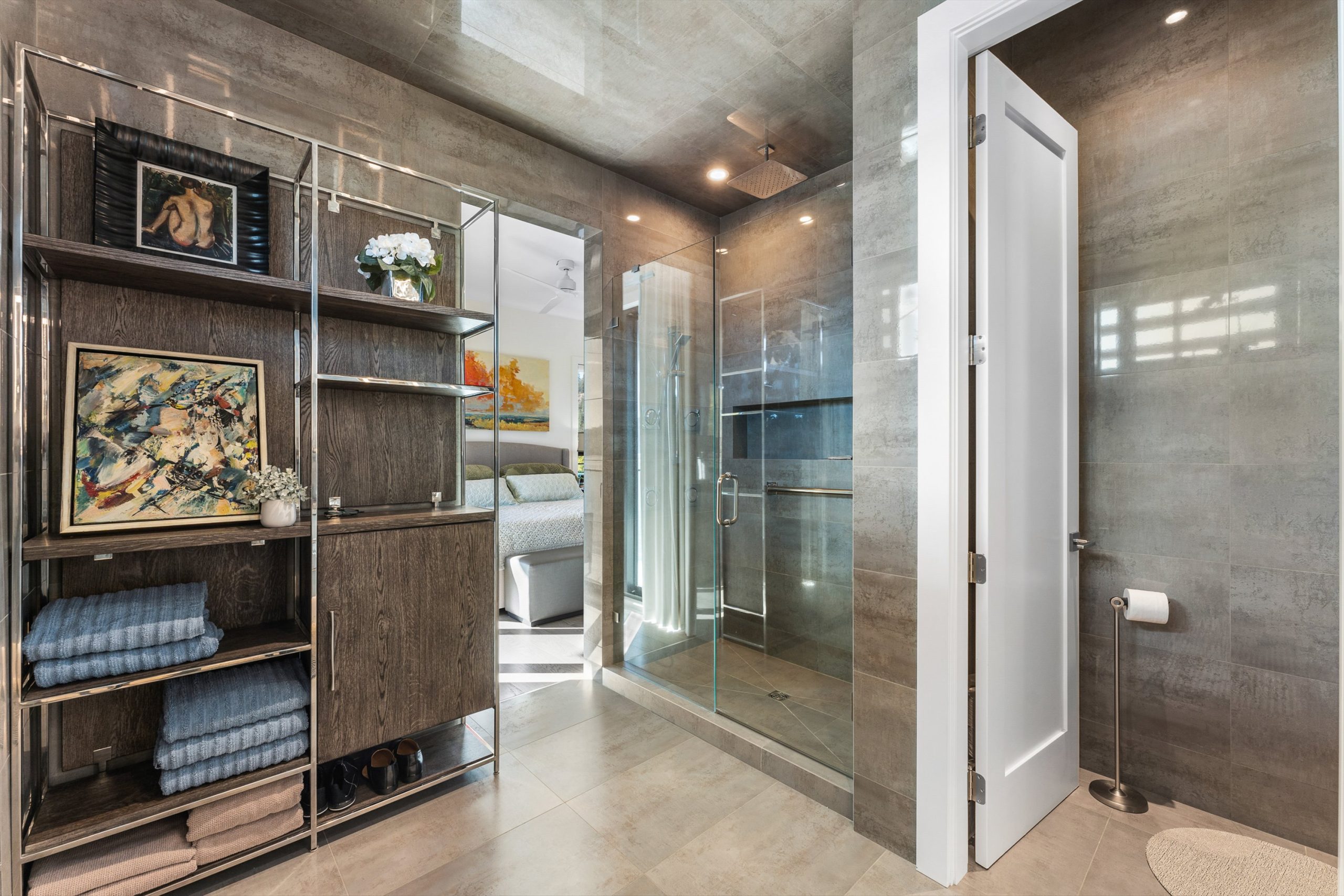 Expansive sliding doors open to a wraparound deck with glass railings, extending your living space outdoors. A private elevator connects all three levels, including the tranquil upper floor where the primary suite offers dual walk-in closets, a spa-inspired ensuite, and access to two serene view decks. An additional bedroom with an adjacent bath, office, and laundry complete the layout.