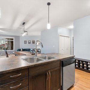 The spacious kitchen features a U-shaped layout with island seating, oak cabinetry with under-cabinet lighting, and a newer appliance package. The dining area accommodates a full table and flows into the bright living room, complete with an electric fireplace and access to the covered patio—perfect for outdoor dining or morning coffee.