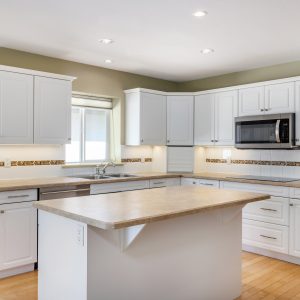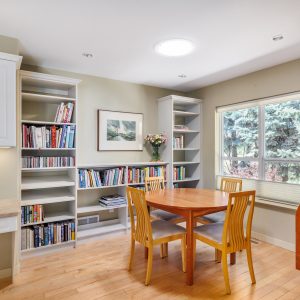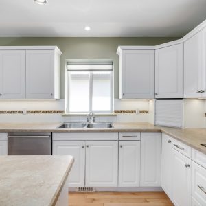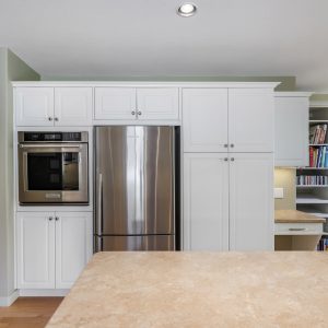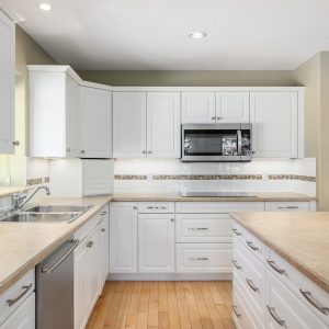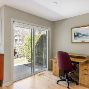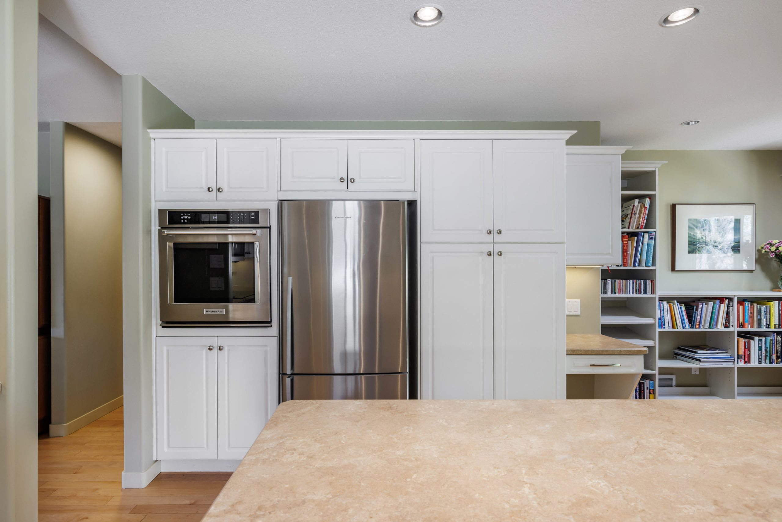 The spacious kitchen offers a central island with seating, white shaker cabinets, under-cabinet lighting, built-in desk and pantry, plus induction cooktop and KitchenAid wall oven. Sliding doors lead to a private patio surrounded by mature shrubs, with walking-path access just steps away.
