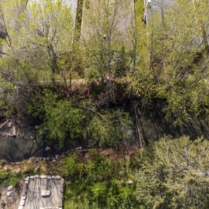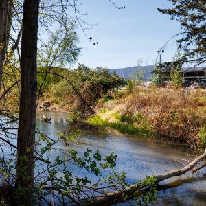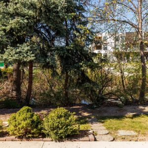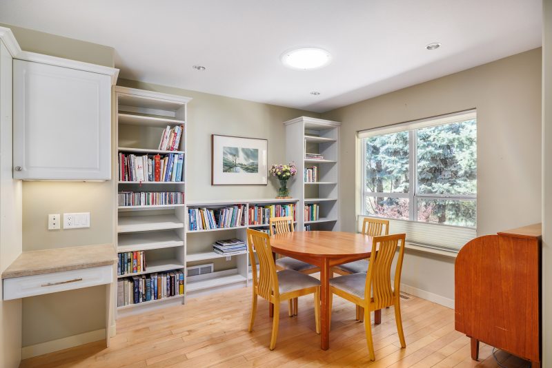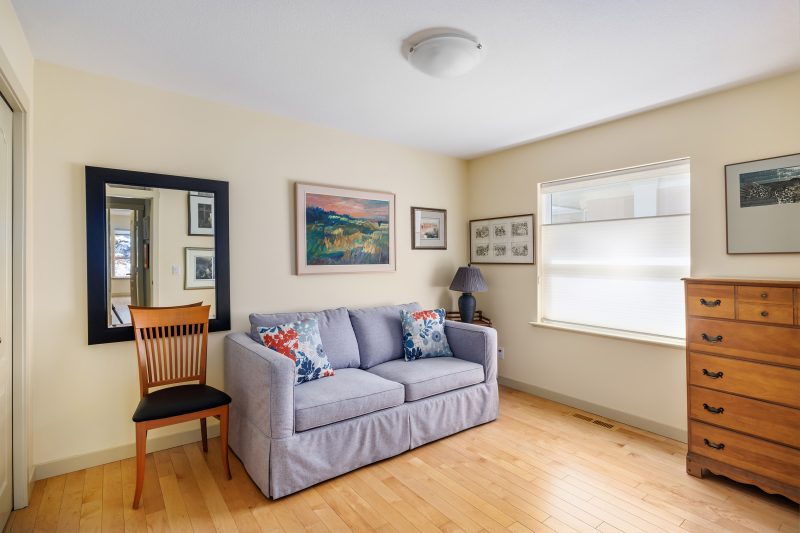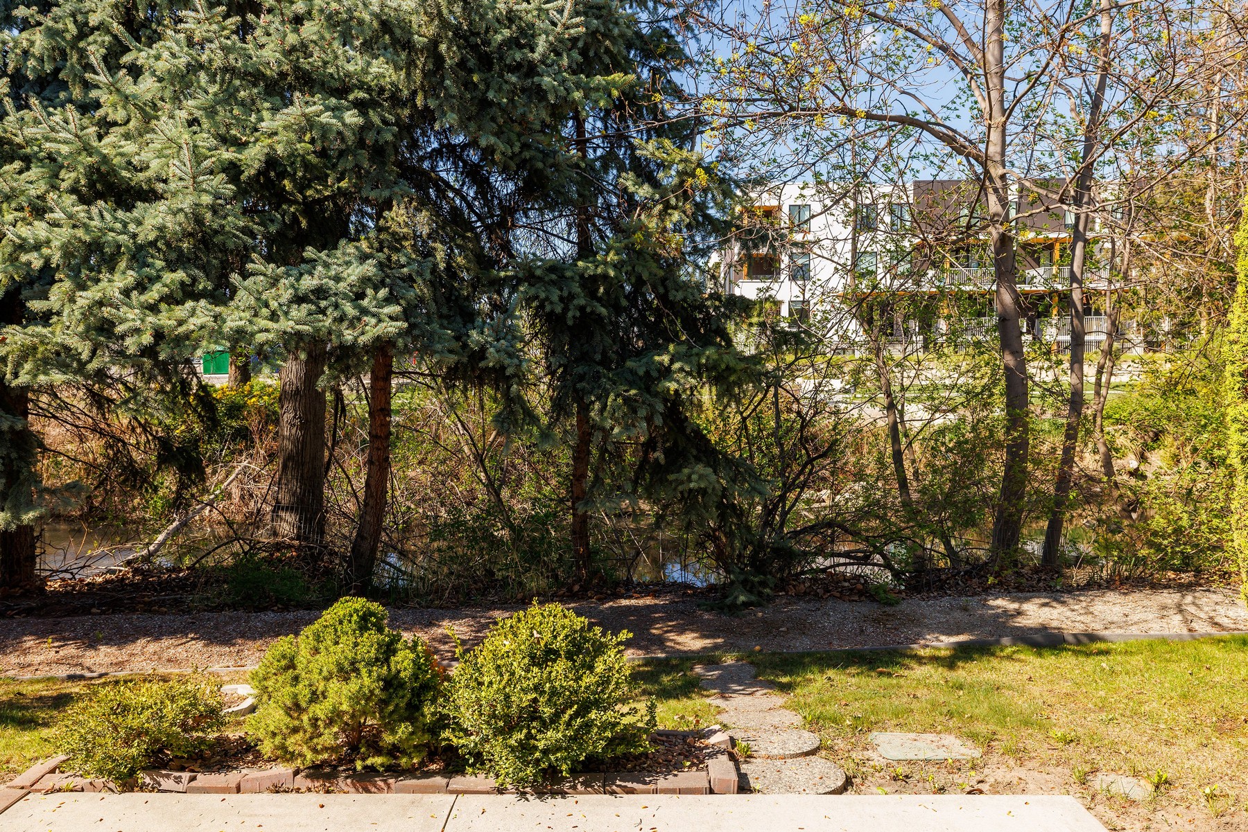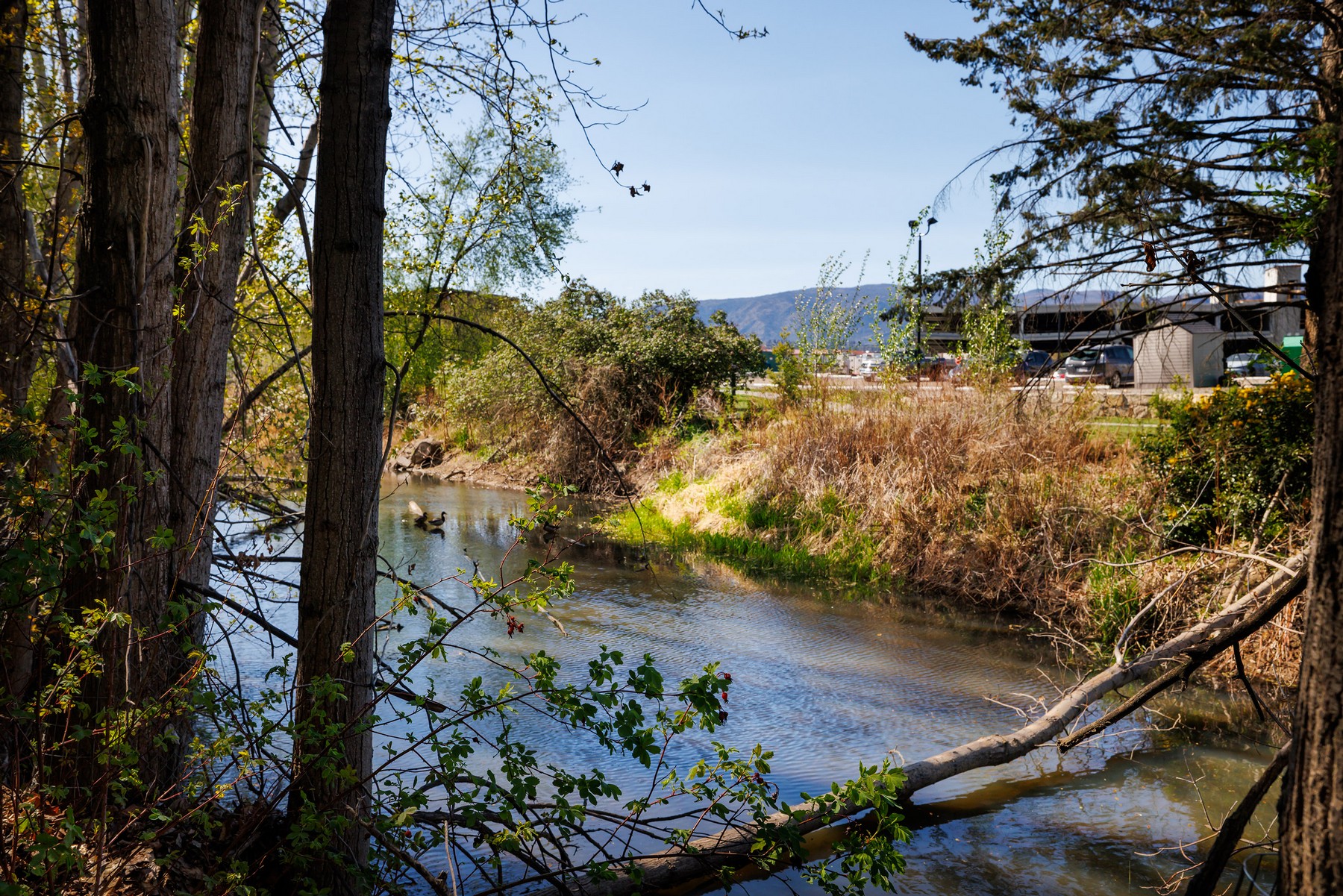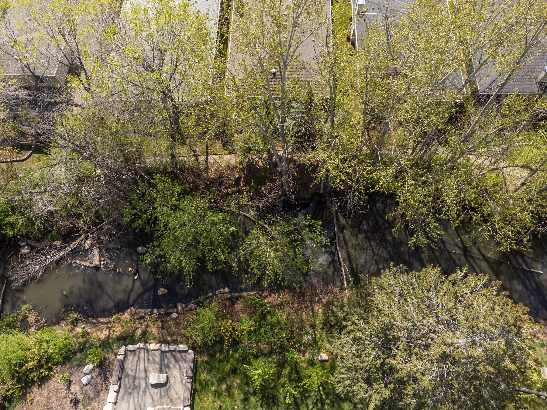 The generous primary bedroom overlooks the creek and includes two closets and a 3-piece ensuite with walk-in shower, while the second bedroom, updated main bathroom and custom built-ins make excellent guest or hobby space.