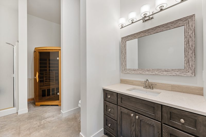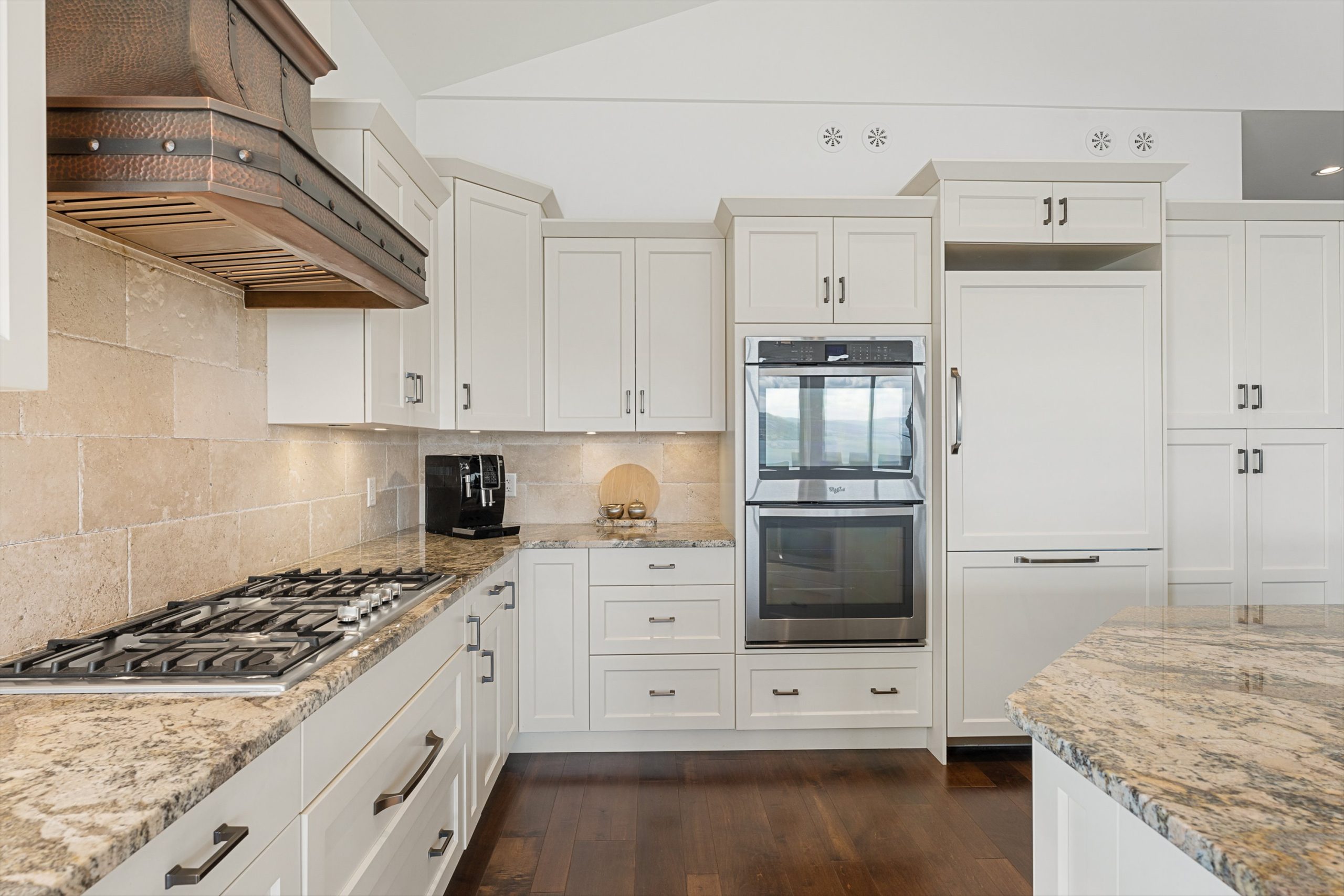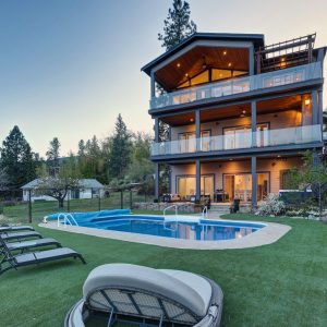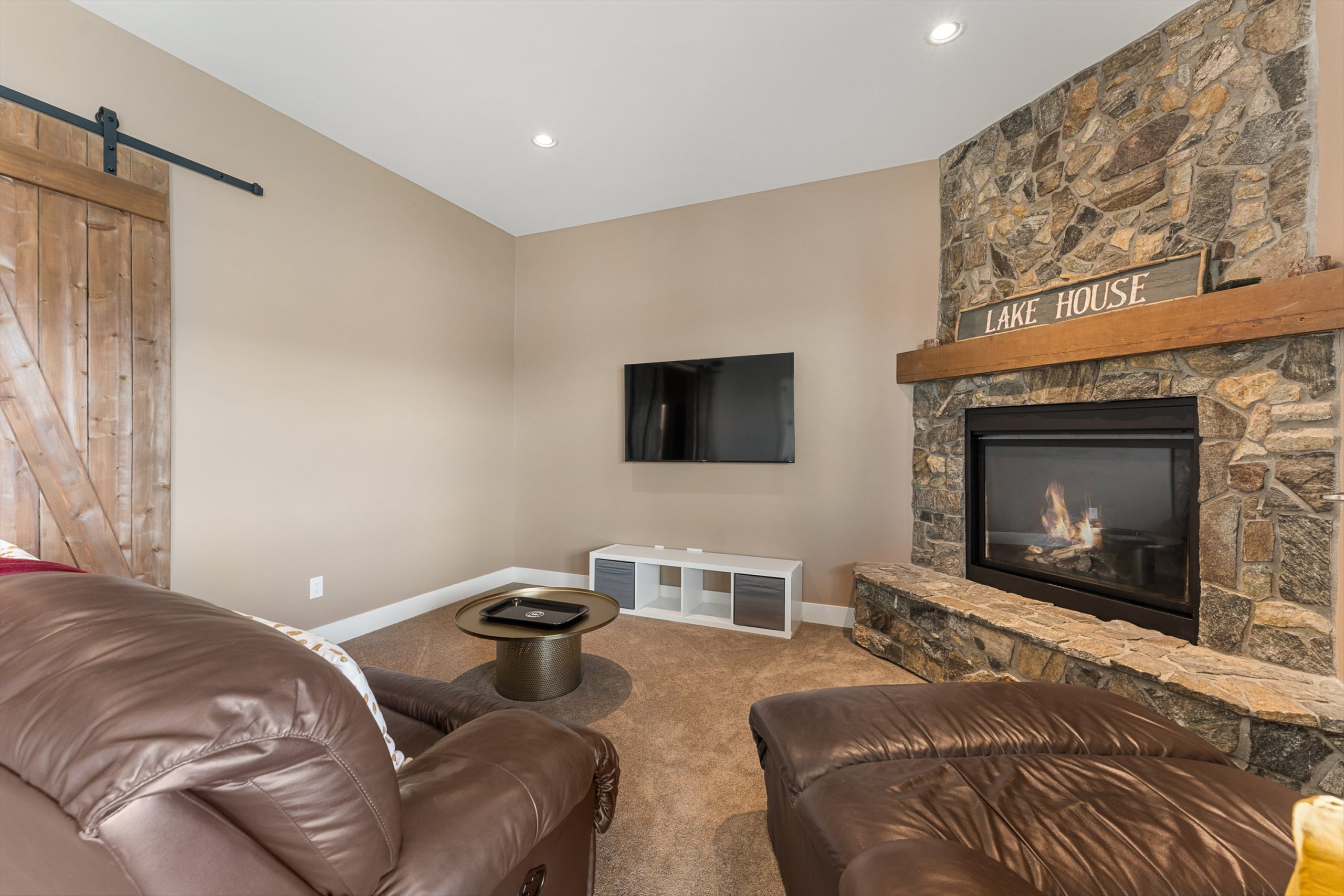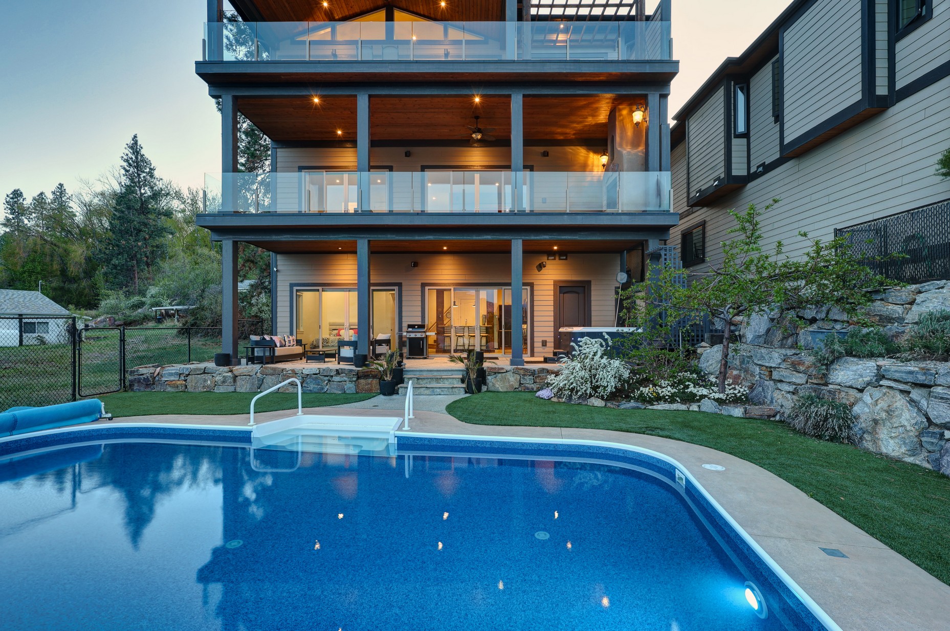 The lower pool level (renovated in 2024) is made for entertaining, featuring a full rec room, summer kitchen, bedroom, den, bonus room, and a bathroom/laundry setup for pool use. Outside, enjoy a fully fenced, low-maintenance backyard with an in-ground heated pool (new liner 2025), hot tub, turf, and a concrete pool deck, all set against sweeping lake and mountain views.