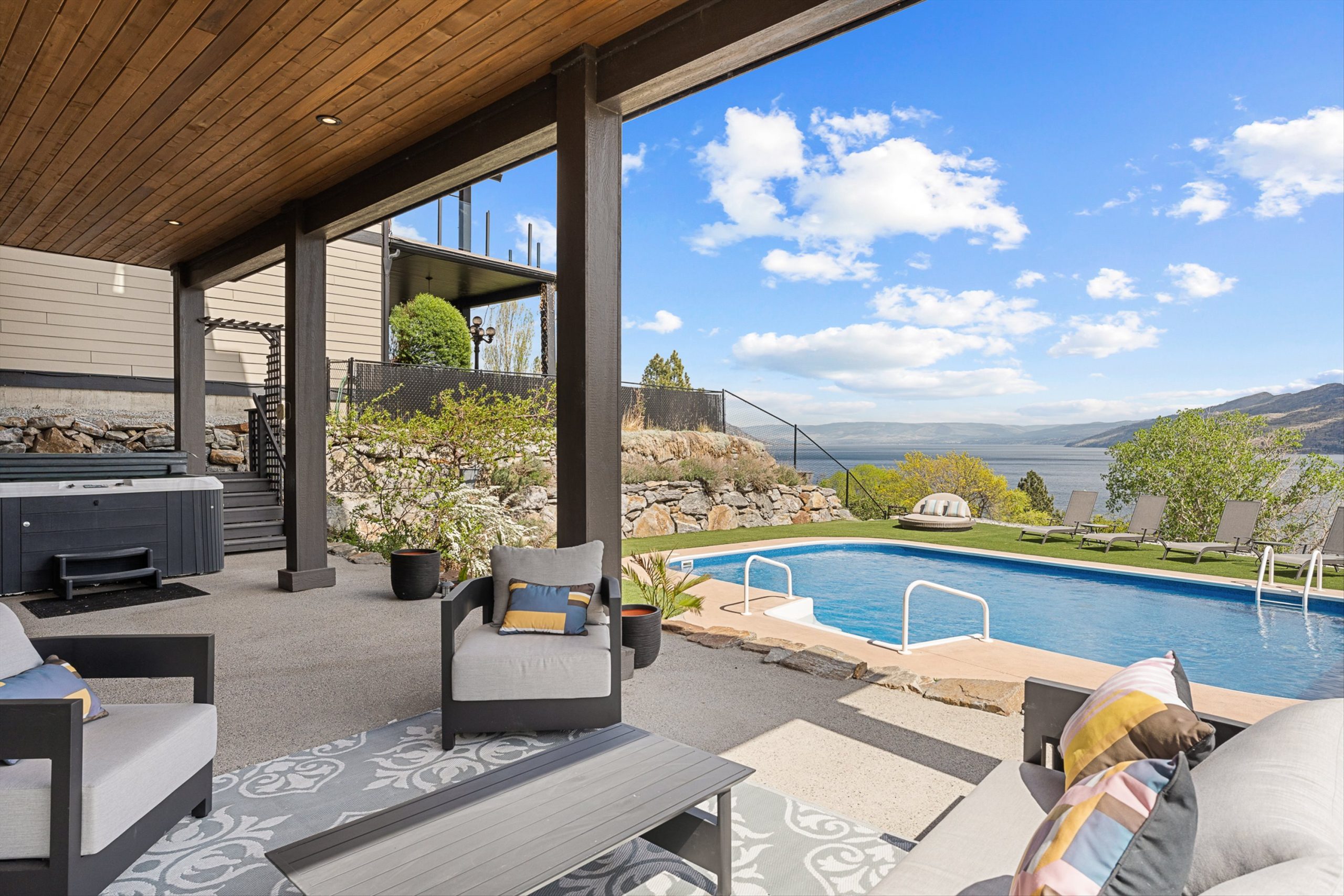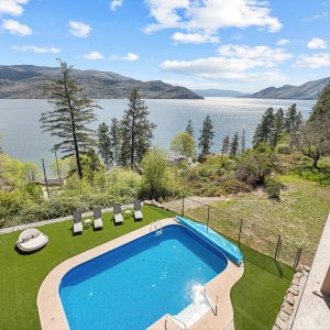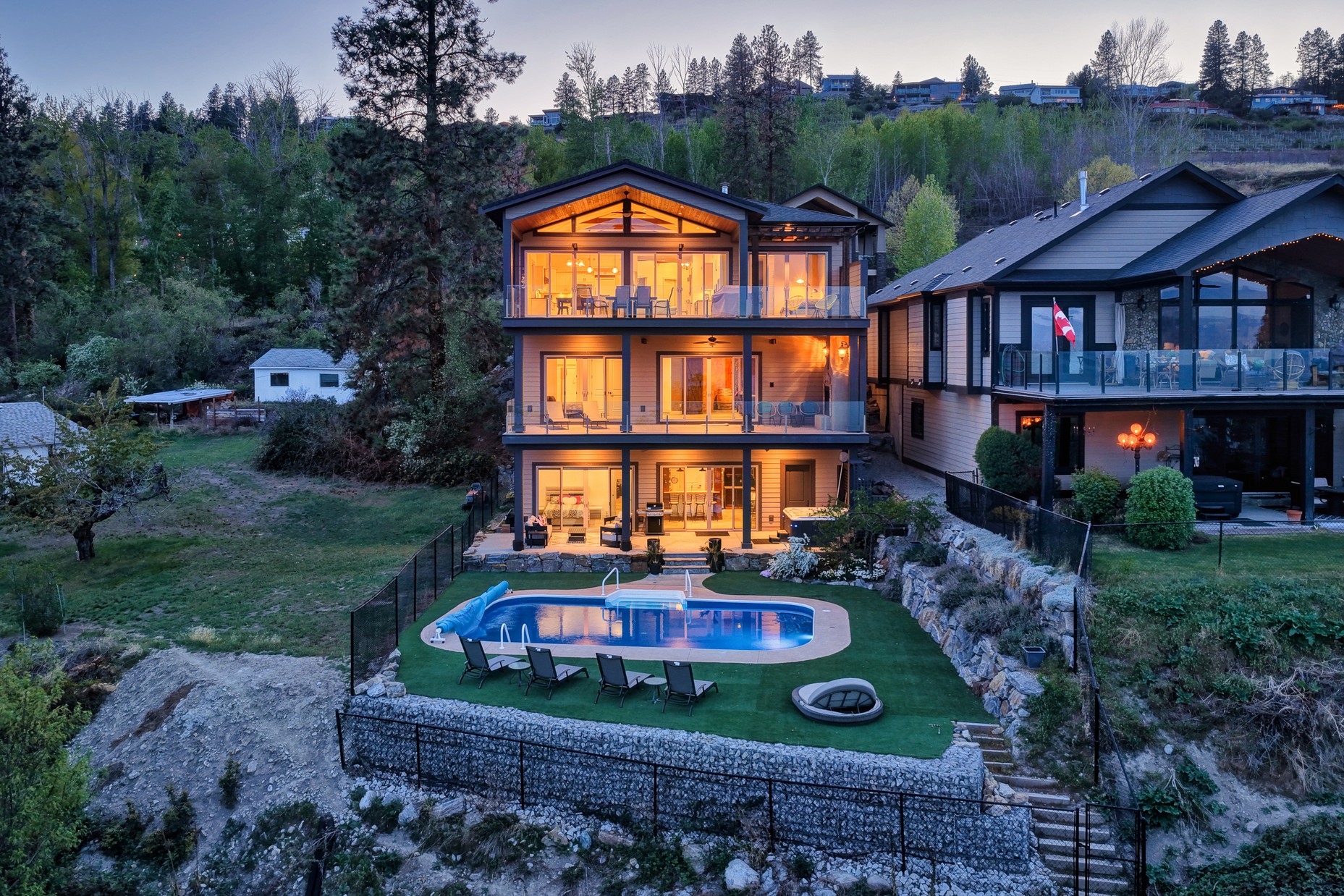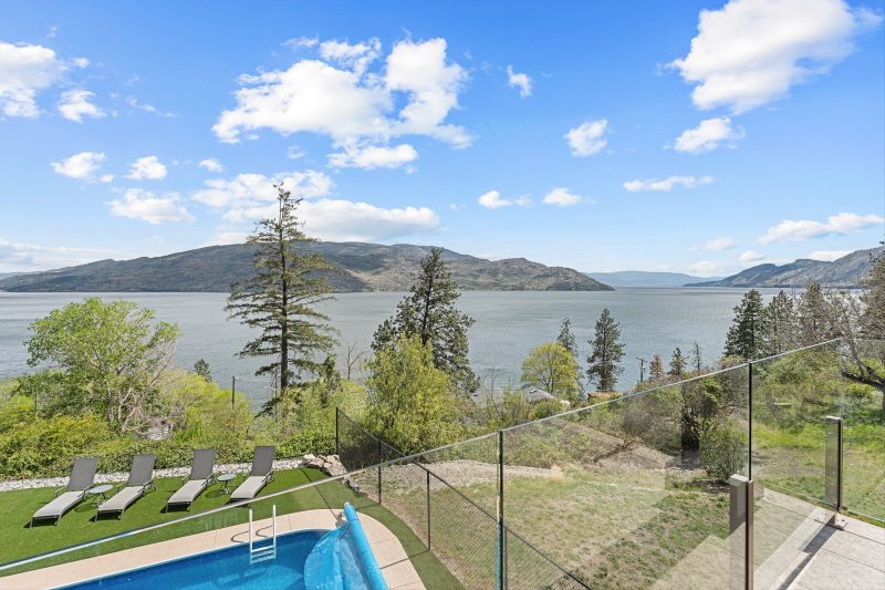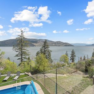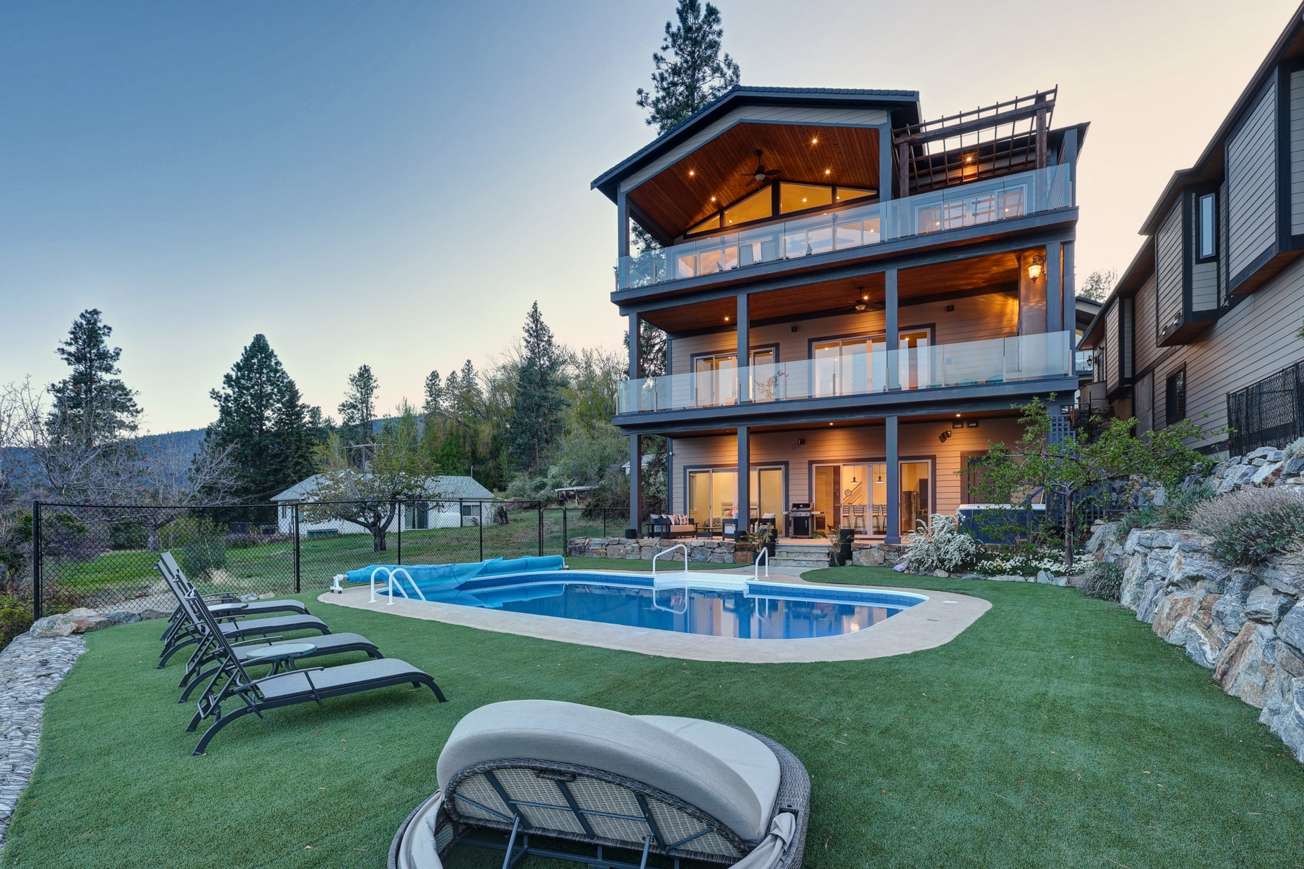 Set in the quiet, no-through enclave of Sundstrom Court, this Peachland home pairs panoramic Okanagan Lake views with a pool, hot tub, and a 1 bedroom, 1 bath self-contained suite. Offering approximately 4,900+ sq. ft. on 0.31 acres, it features 5 bedrooms and 5 bathrooms across three levels, with wide-plank hardwood, high ceilings, exposed beams, custom window coverings, and a striking central staircase with glass railings.