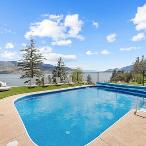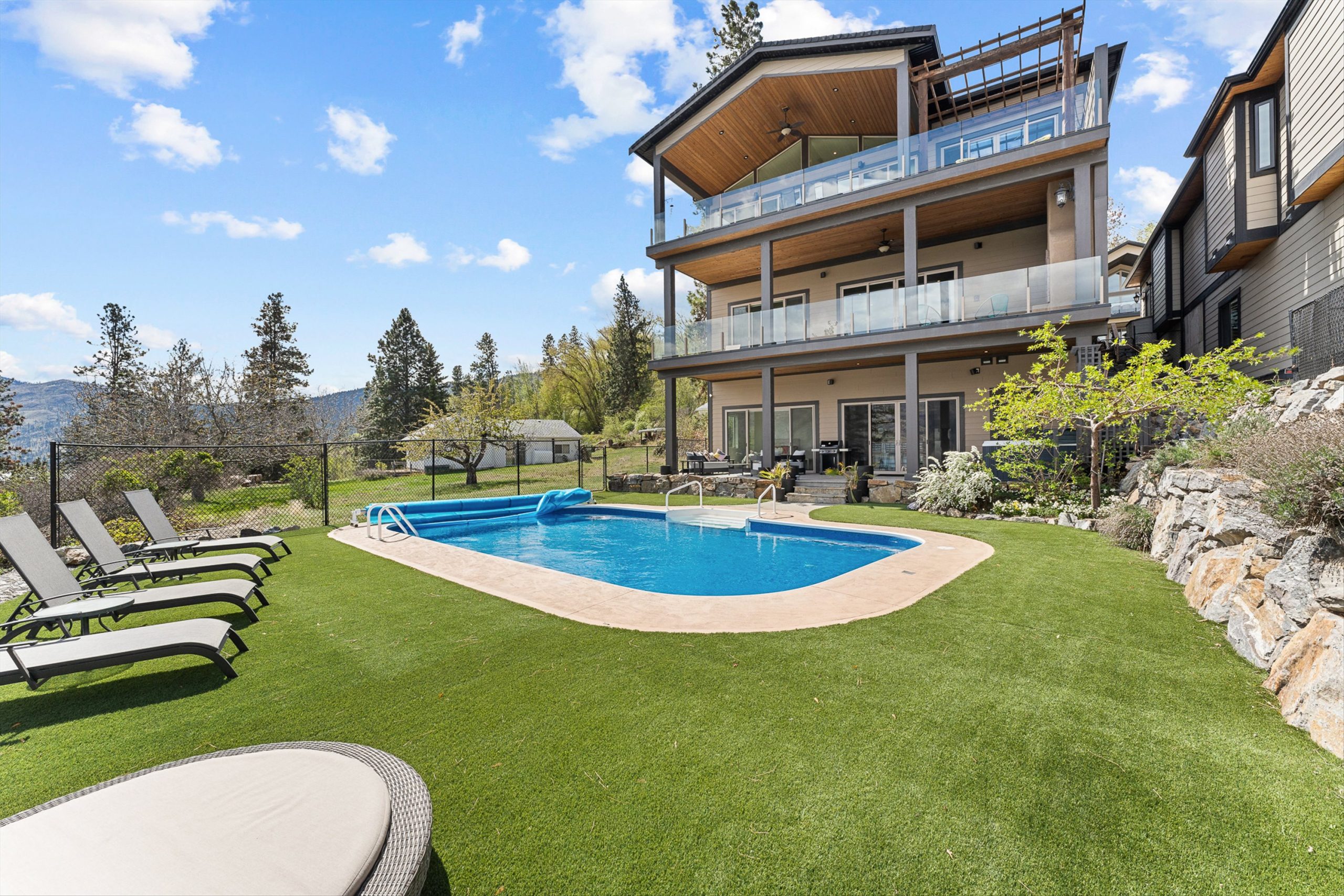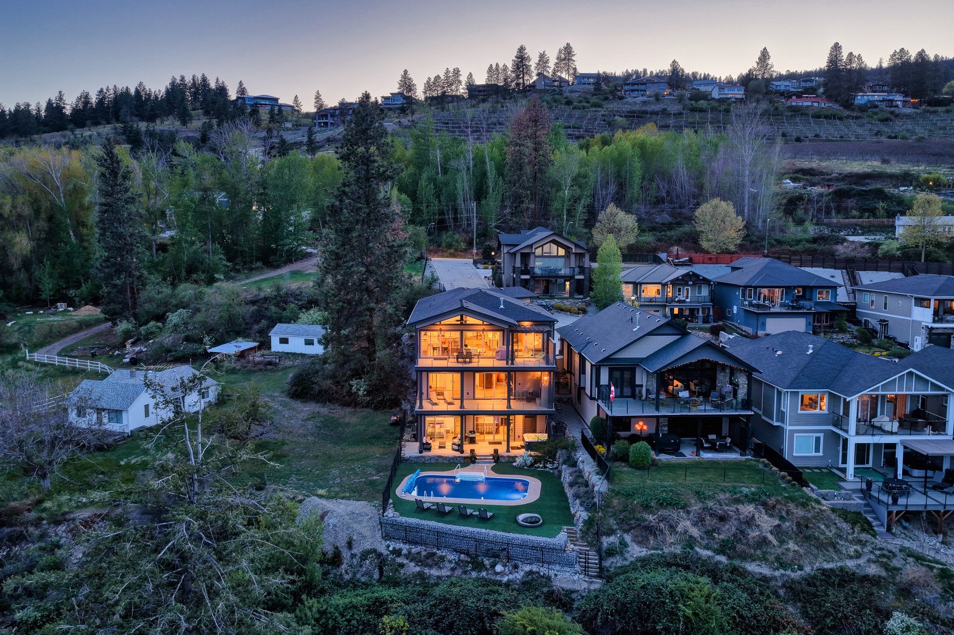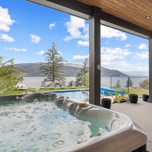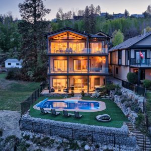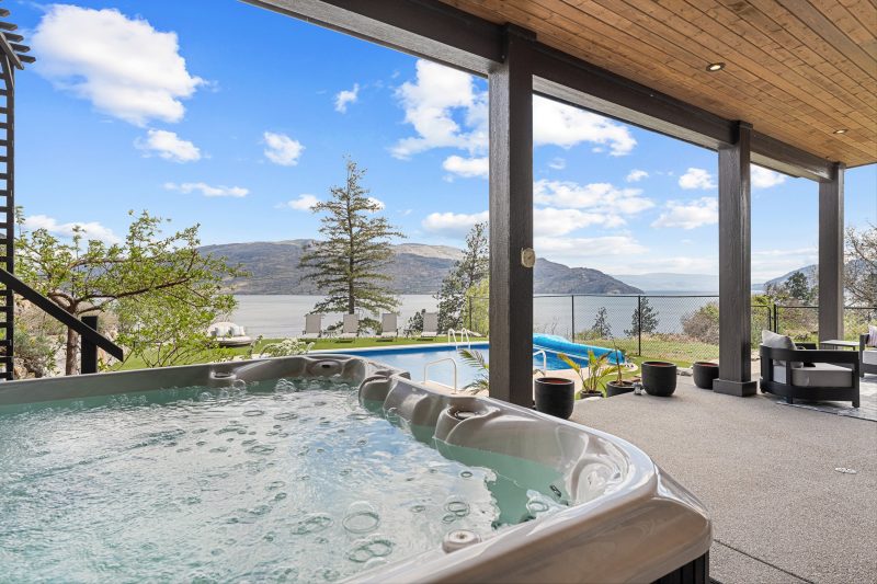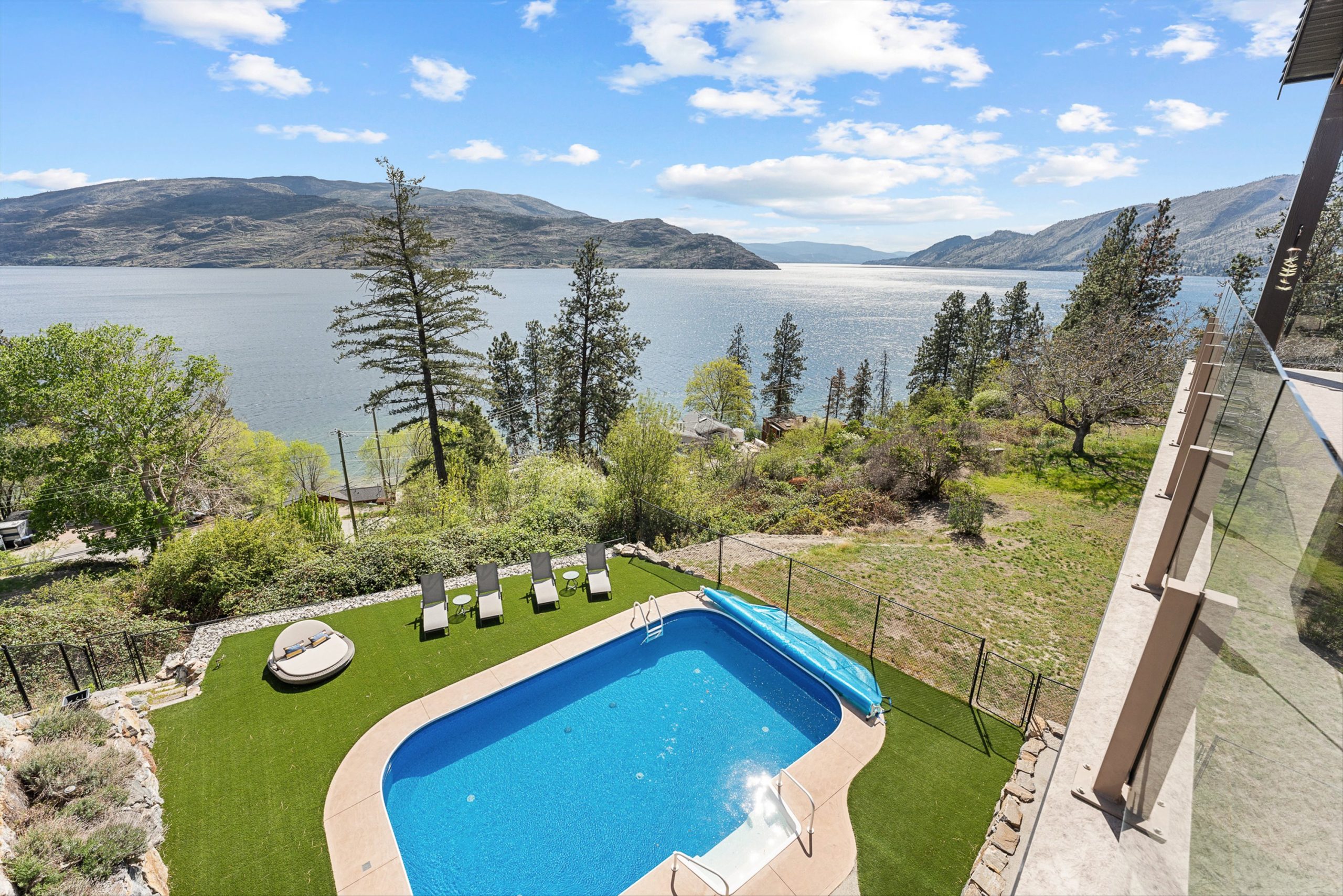 Set in the quiet, no-through enclave of Sundstrom Court, this Peachland home pairs panoramic Okanagan Lake views with a pool, hot tub, and a 1 bedroom, 1 bath self-contained suite. Offering approximately 4,900+ sq. ft. on 0.31 acres, it features 5 bedrooms and 5 bathrooms across three levels, with wide-plank hardwood, high ceilings, exposed beams, custom window coverings, and a striking central staircase with glass railings.