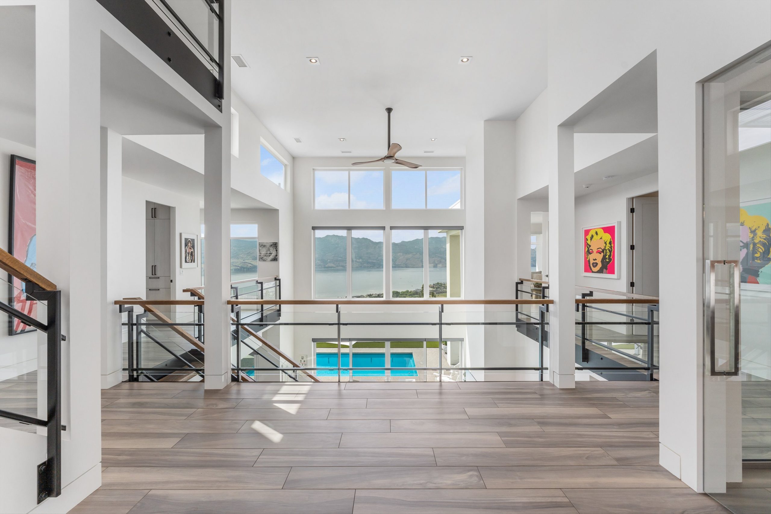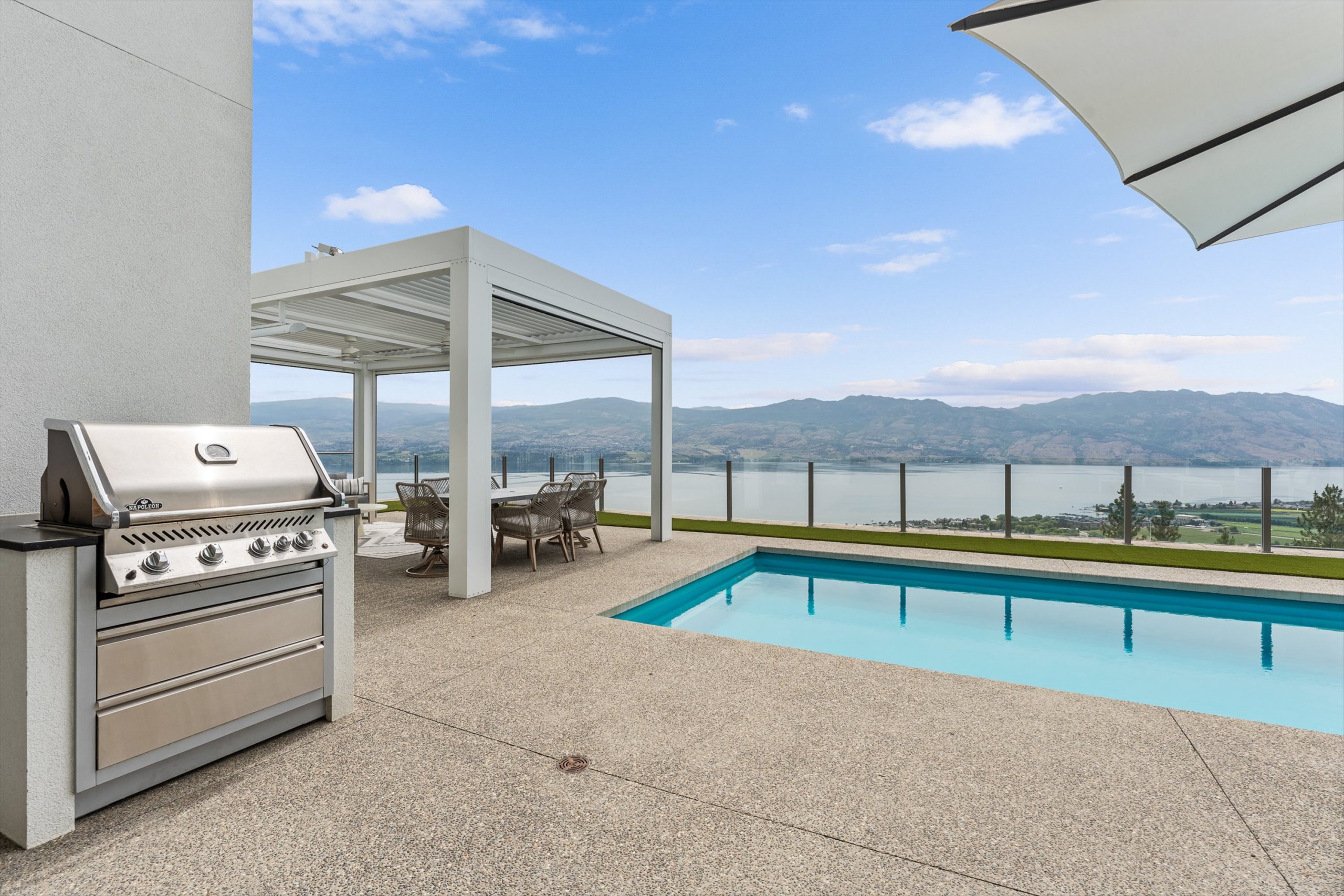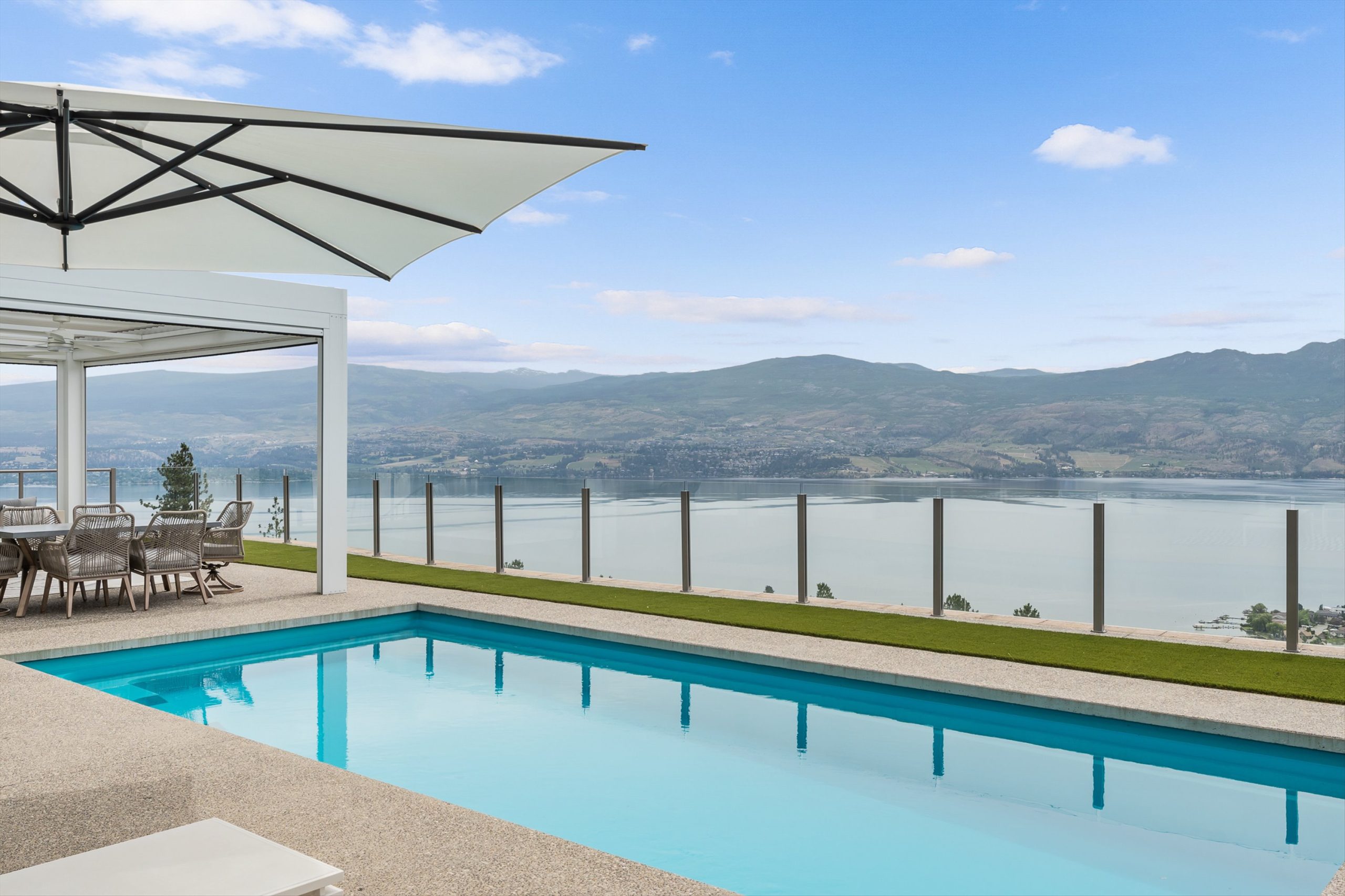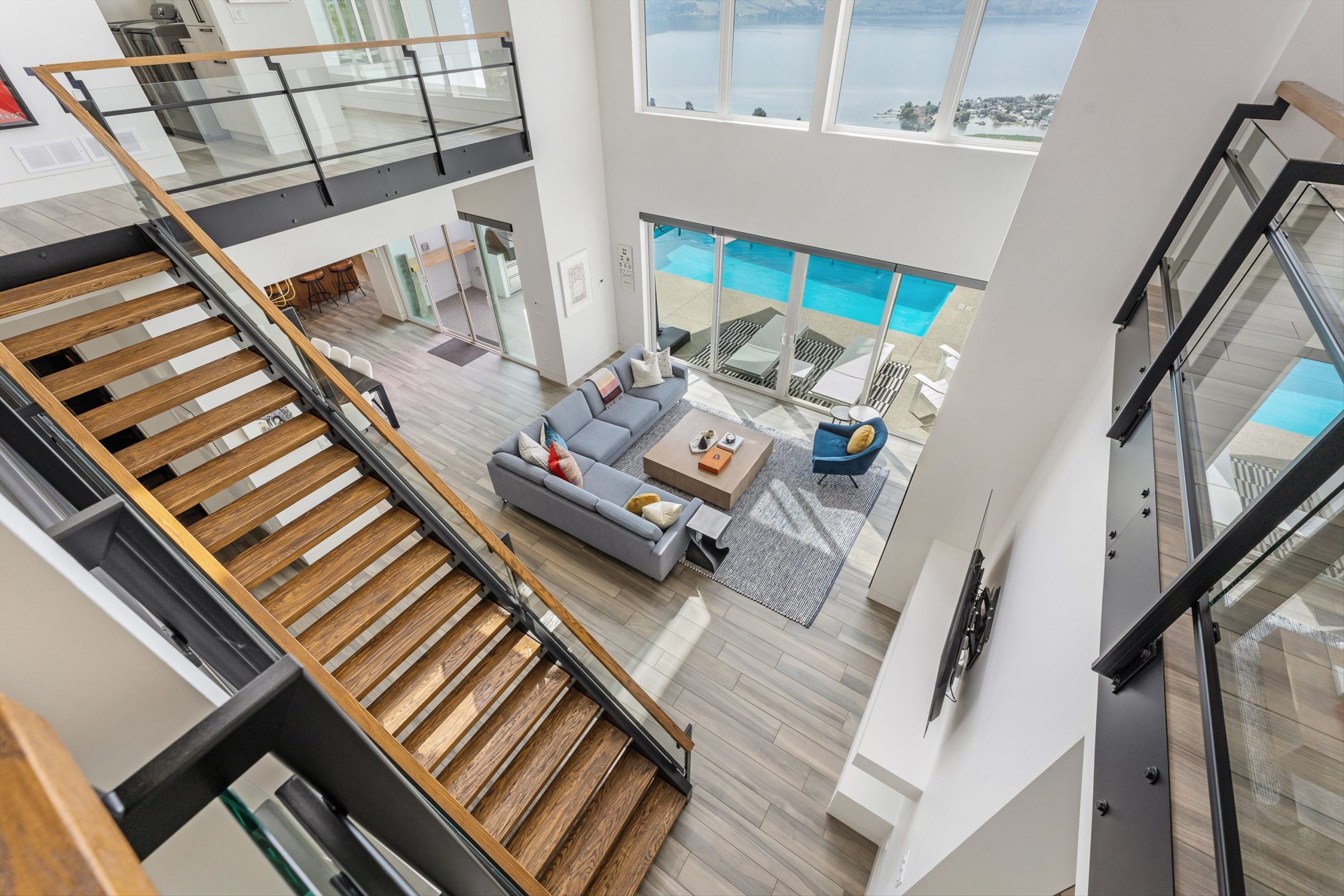 A contemporary showpiece in Lakeview Heights, this architectural residence is a masterclass in design, scale, and comfort. With soaring 12-ft ceilings, walls of glass, and seamless indoor-outdoor flow, the home is purposefully oriented to capture panoramic views of Okanagan Lake, surrounding vineyards, and the valley below. Crafted for elevated living and entertaining, the interior features heated tile plank floors, a grand-scale expansive fireplace in the great room, and a chef-inspired kitchen with leathered granite island, AGA range, Electrolux fridge/freezer, and butler’s pantry.