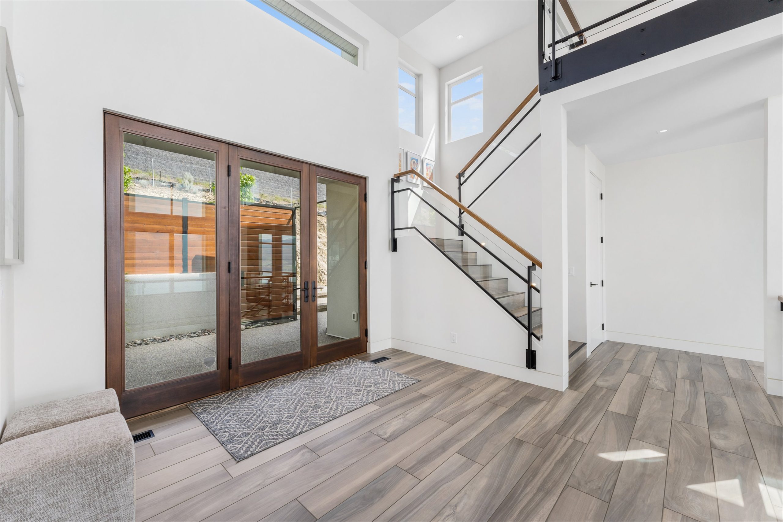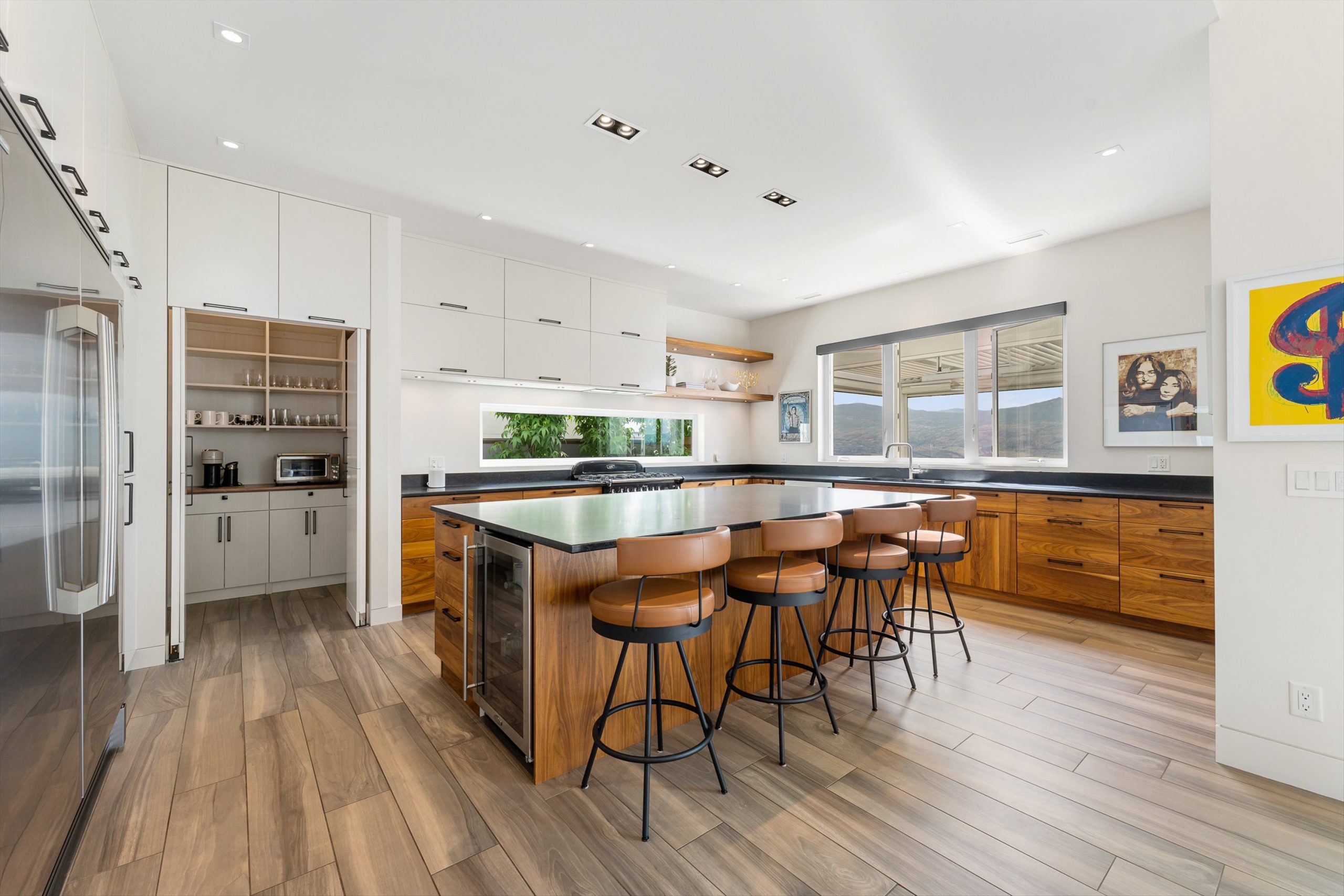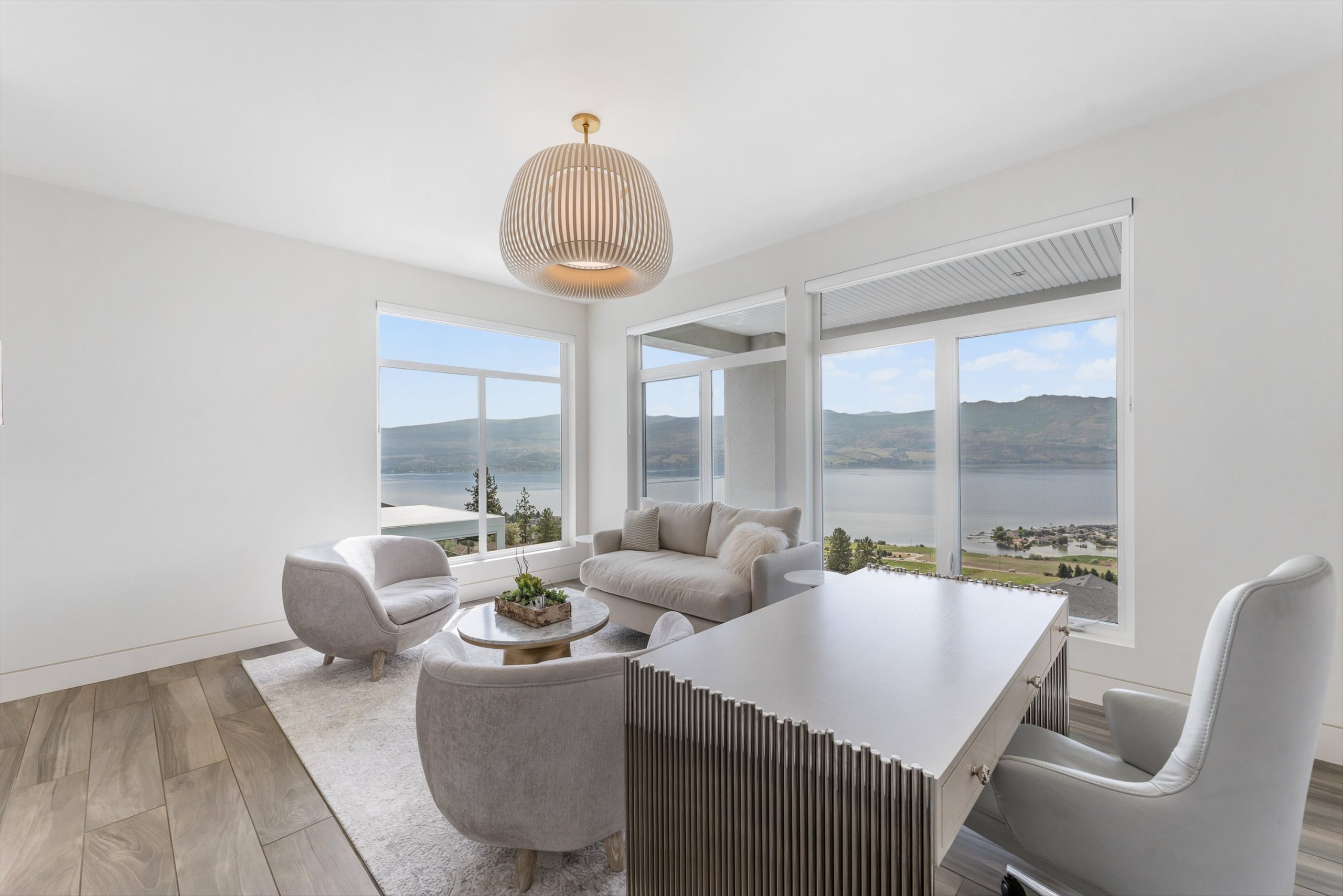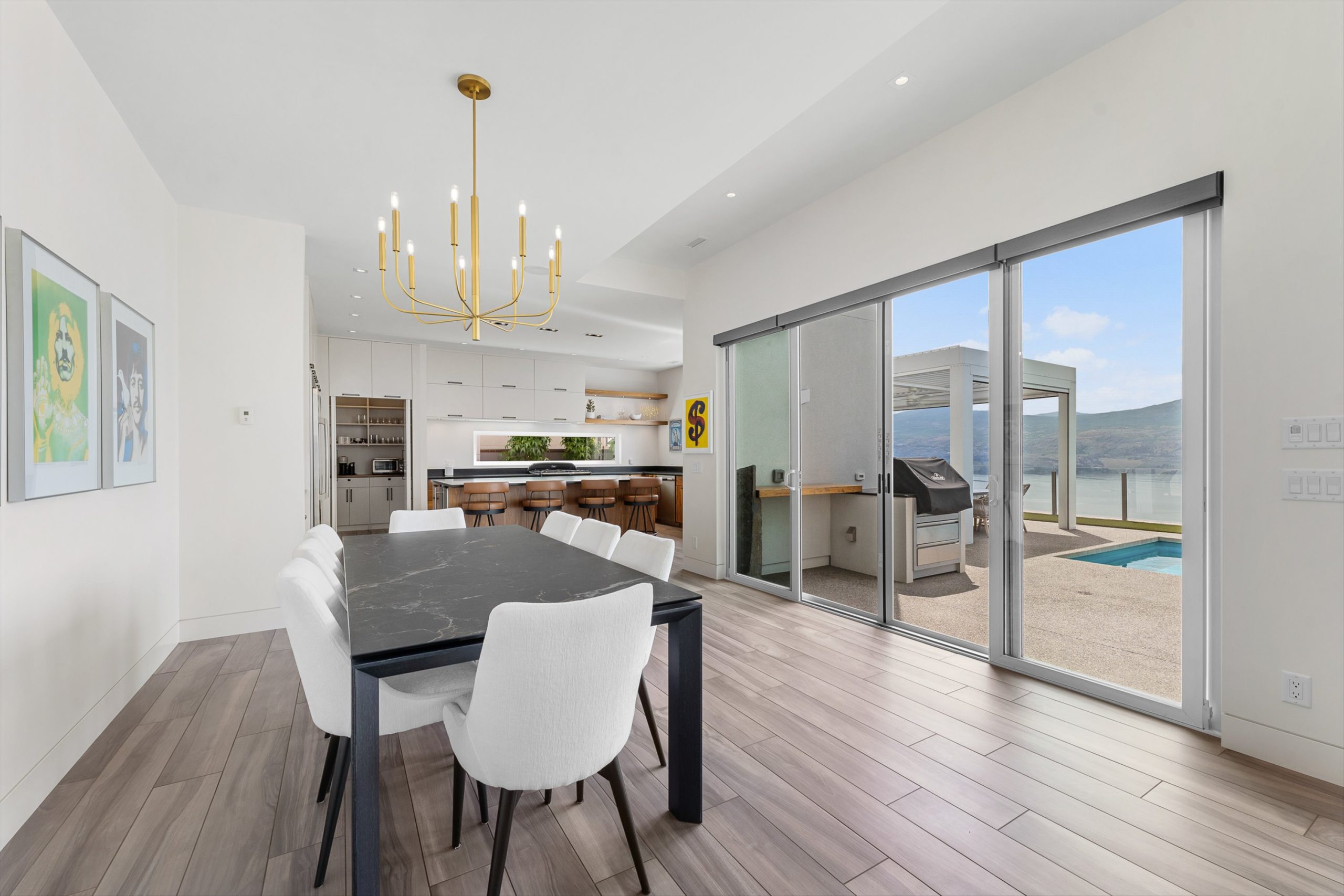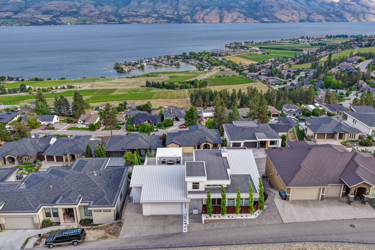A contemporary showpiece in Lakeview Heights, this architectural residence is a masterclass in design, scale, and comfort. With soaring 12-ft ceilings, walls of glass, and seamless indoor-outdoor flow, the home is purposefully oriented to capture panoramic views of Okanagan Lake, surrounding vineyards, and the valley below. Crafted for elevated living and entertaining, the interior features heated tile plank floors, a grand-scale expansive fireplace in the great room, and a chef-inspired kitchen with leathered granite island, AGA range, Electrolux fridge/freezer, and butler’s pantry.