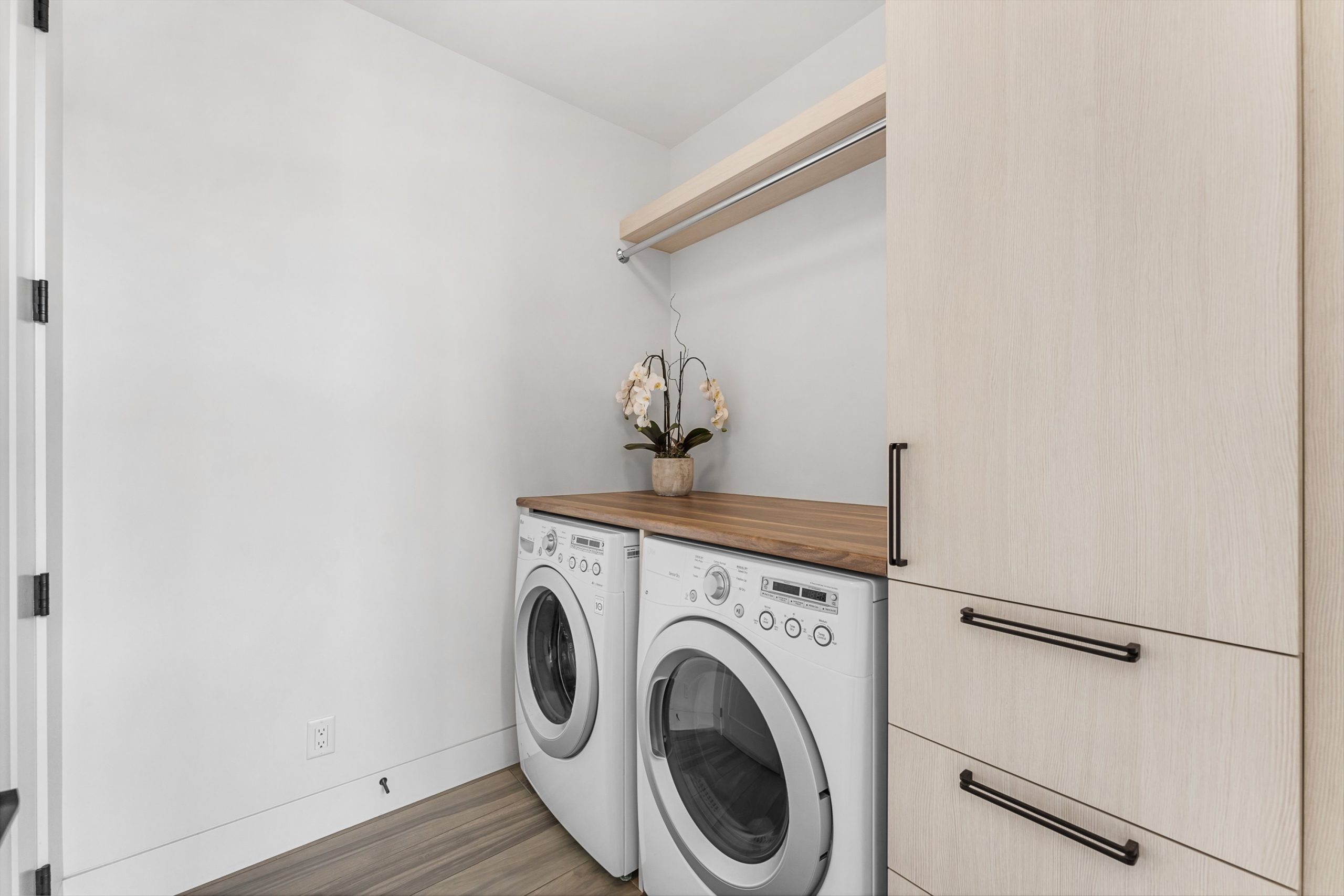 A media room, home gym, rooftop bar, and two full laundry rooms enhance the functional layout. The professionally landscaped grounds include a heated saltwater pool, built-in BBQ, turf lawn, frameless glass railings, and unobstructed lake views. Smart home upgrades, designer lighting, power blinds, and a double garage with integrated storage complete this rare offering.