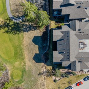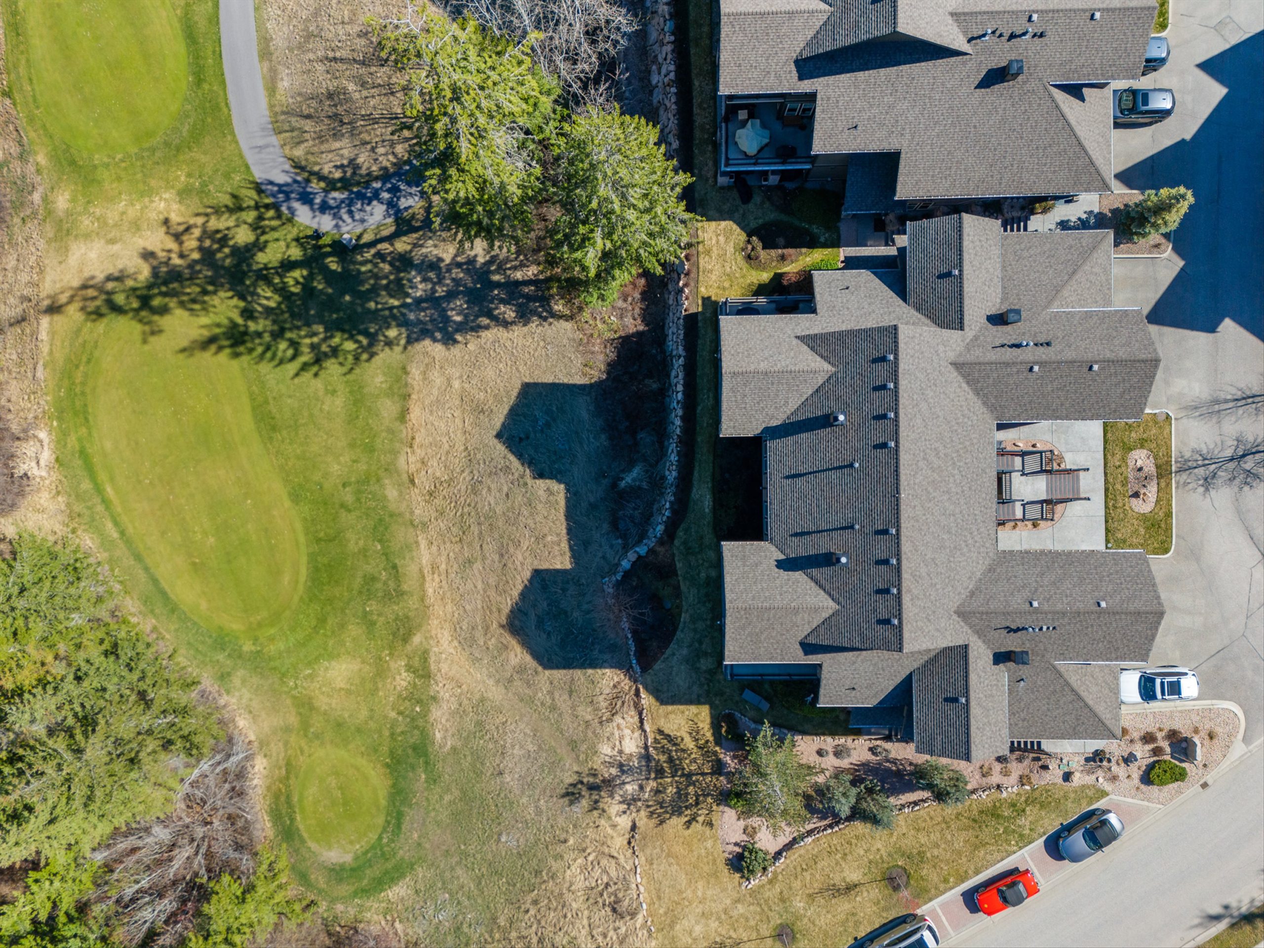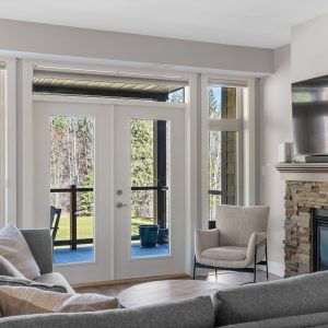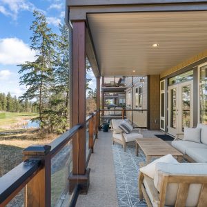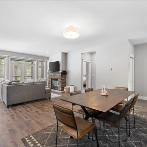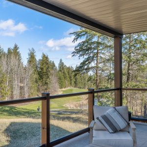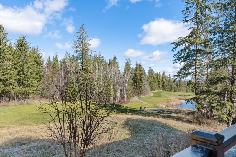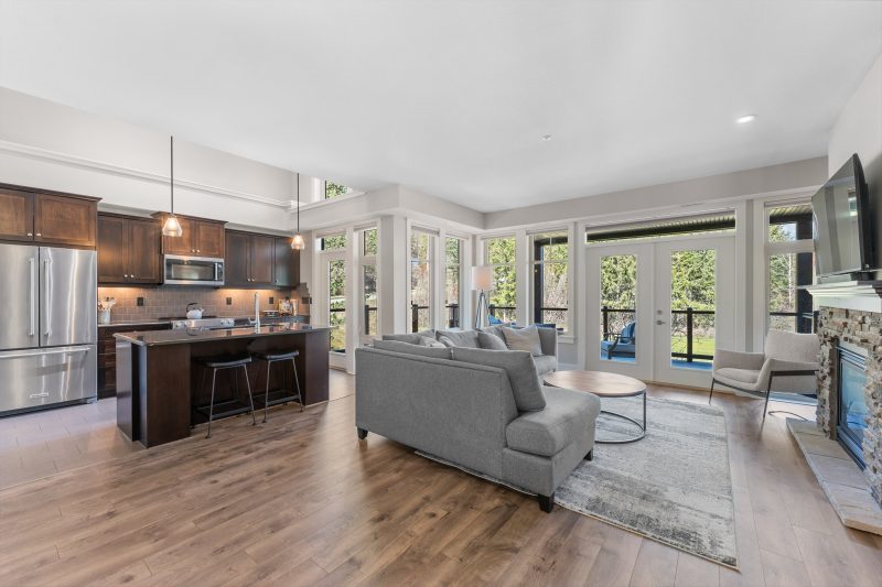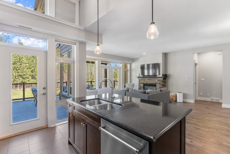 Large windows fill the open-concept living, dining, and kitchen areas with natural light while framing the fairway view. The living room is anchored by a gas fireplace with stone hearth and wood mantel, flowing seamlessly to the covered deck, perfect for morning coffee or evening dining.
