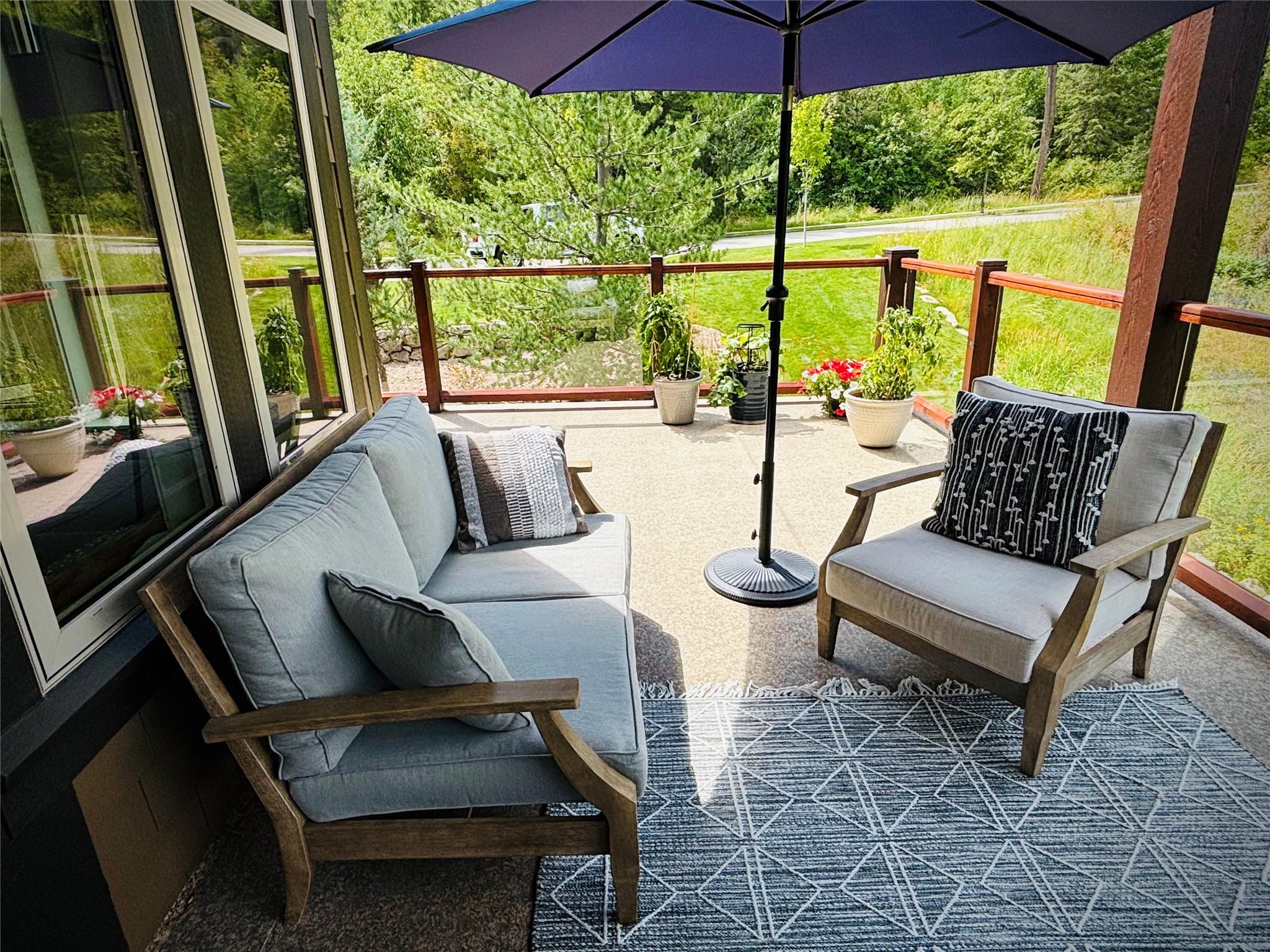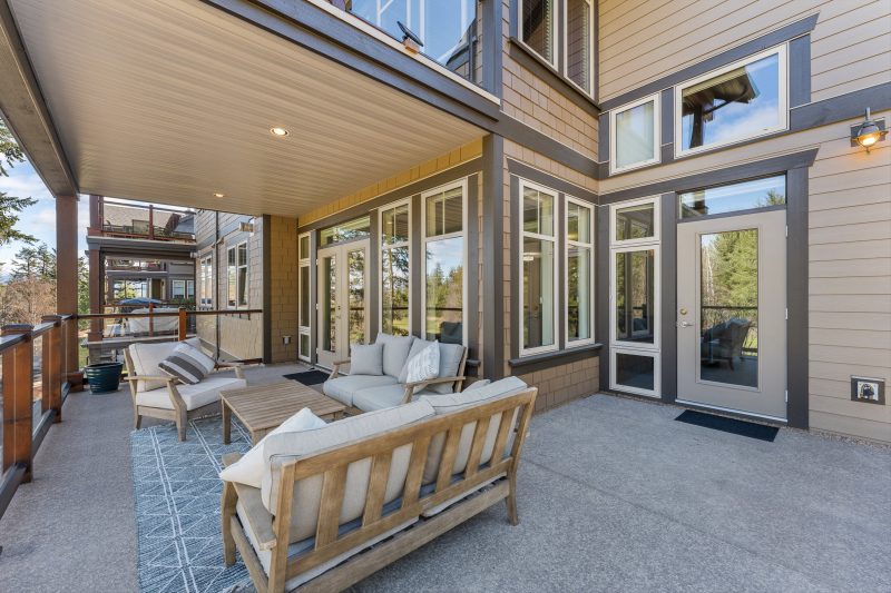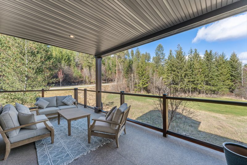 The kitchen features rich wood cabinetry, granite countertops, central island, KitchenAid appliances, and a vaulted ceiling. Double doors open to the covered deck with glass railings, BBQ hookup, and space for dining and lounging.