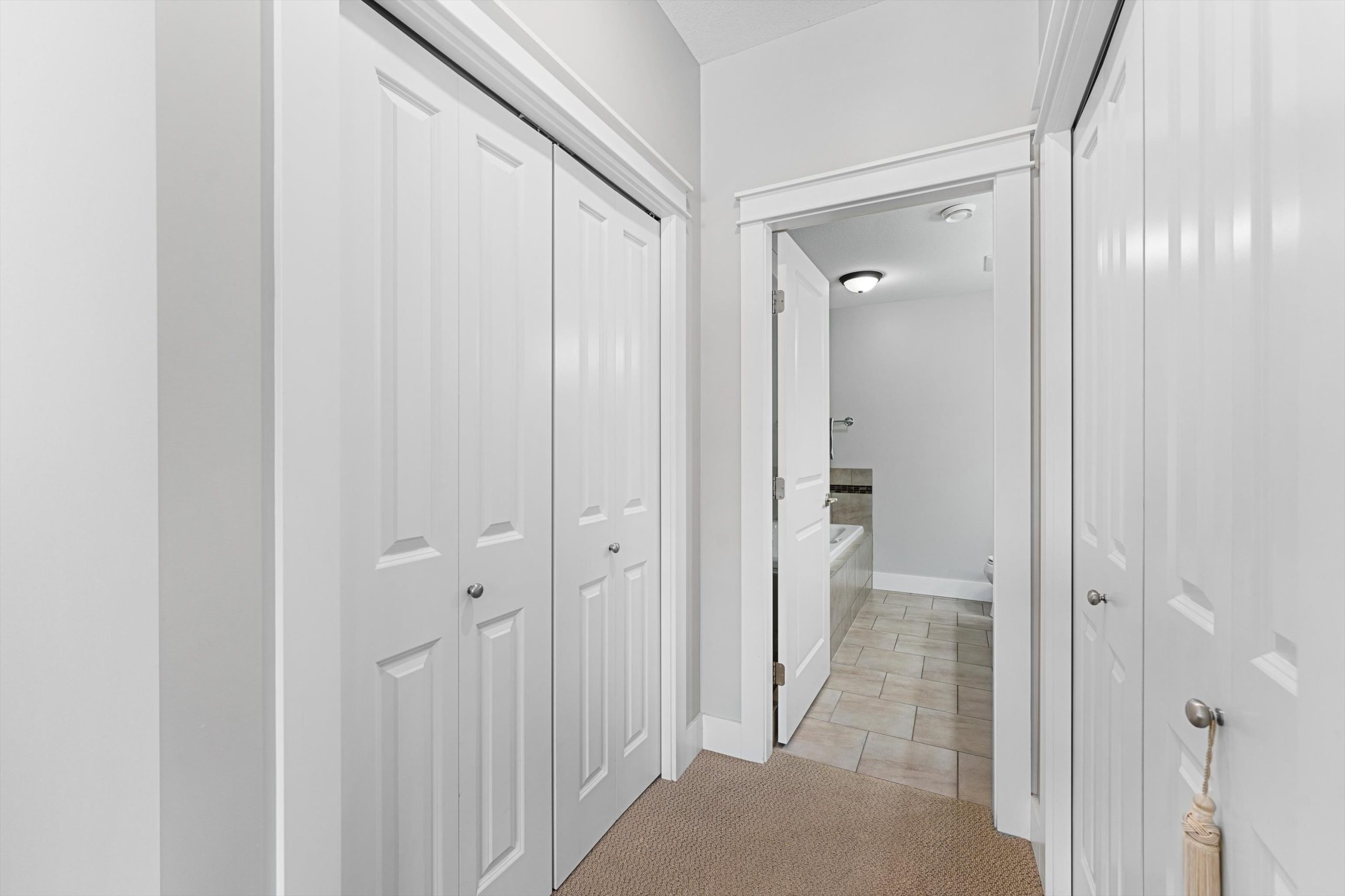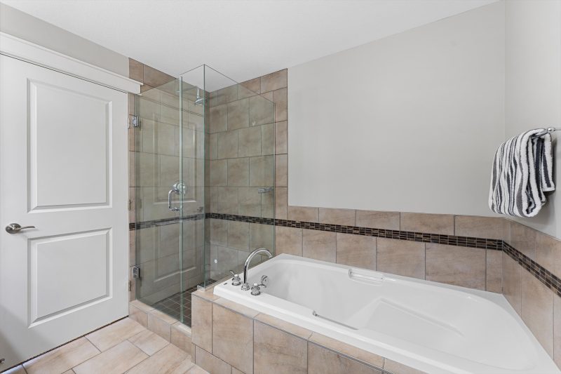 The primary suite offers golf course views, walk-through closets, and a 5-piece ensuite with heated tile floors, double vanity, soaker tub, and tiled walk-in shower. A generous guest bedroom and 3-piece bath also feature heated tile. Additional highlights include a single-car garage, central vac rough-in, radon system, and ample storage.