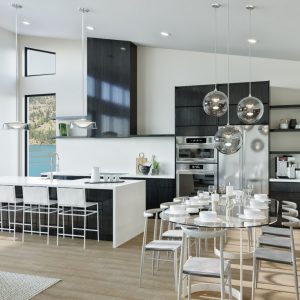This stunning home features a 14+ ft. vaulted ceiling in the open-concept kitchen/living area, offering beautiful lake views from every floor. Floor-to-ceiling windows open onto a covered balcony with an optional outdoor kitchen, perfect for indoor/outdoor entertaining. The gourmet kitchen is equipped with chef-inspired appliances. The primary retreat includes a private covered balcony, ensuite with spa-like finishes, and a spacious walk-in closet. There is also a sizable guest bedroom with a three-piece ensuite. Select from 3 finishing collections or customize to your personal taste. The impressive wine display features a cabinet-coordinated wood surround, simple horizontal bottle display, and LED lighting.