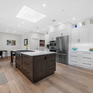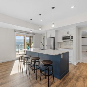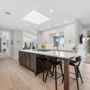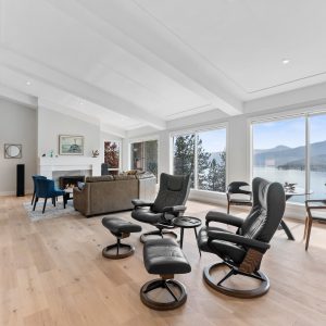Upper deck provides all season enjoyment with electric sunshades and gas heater. A spacious foyer and expansive windows in the living and dining area create a sun filled space with vaulted beamed ceilings, a gas fireplace, and built-in wet bar. The large gourmet kitchen boasts a generous centre island with seating, a skylight, stainless steel appliances, huge walk-in pantry and built-in workstation. Seating area off the kitchen provides access to the lake view deck.