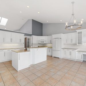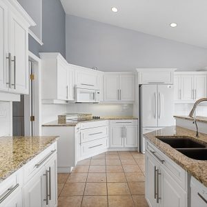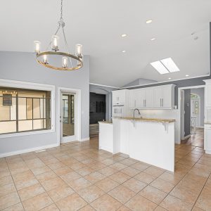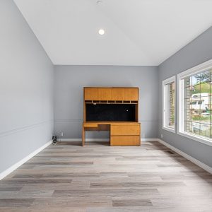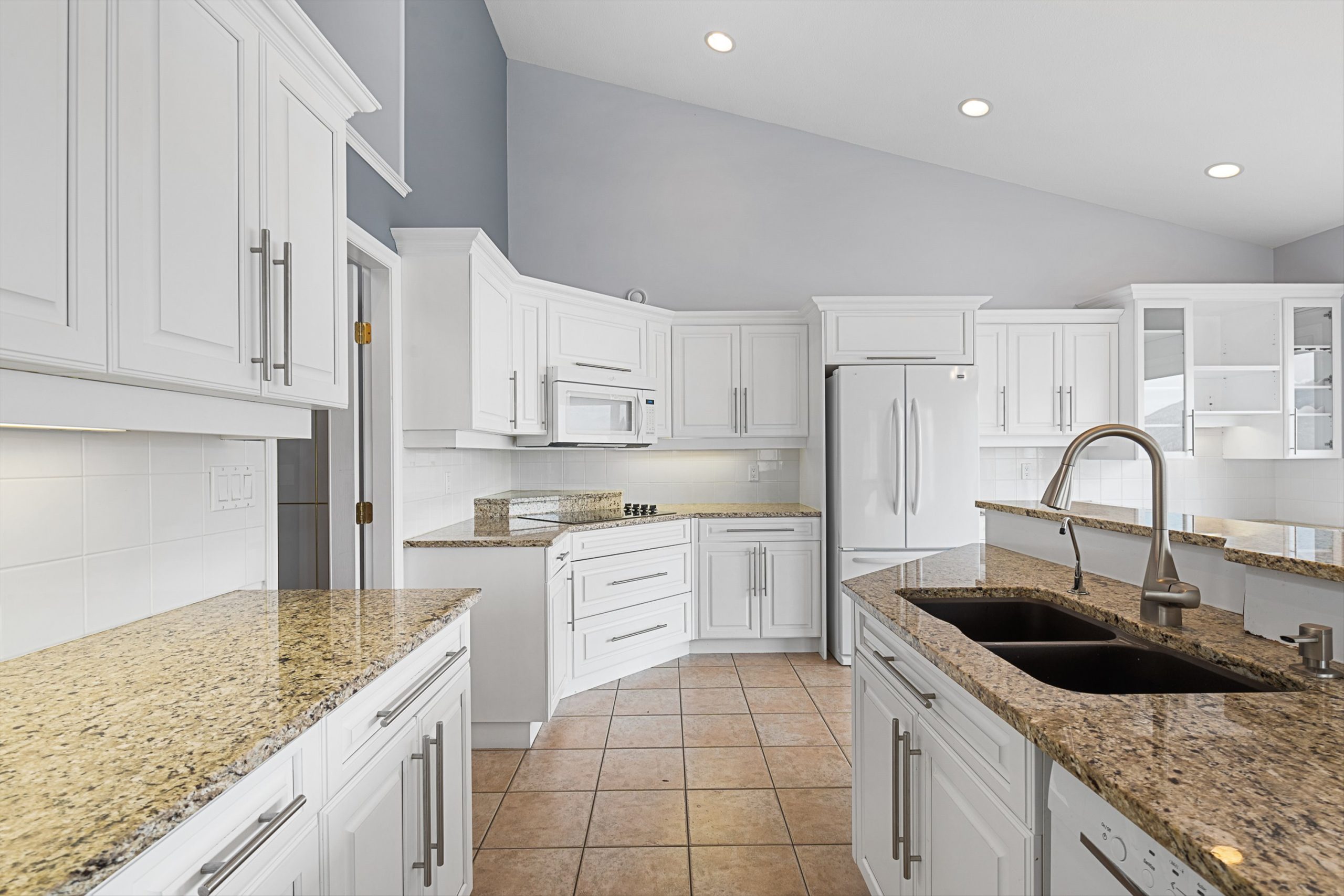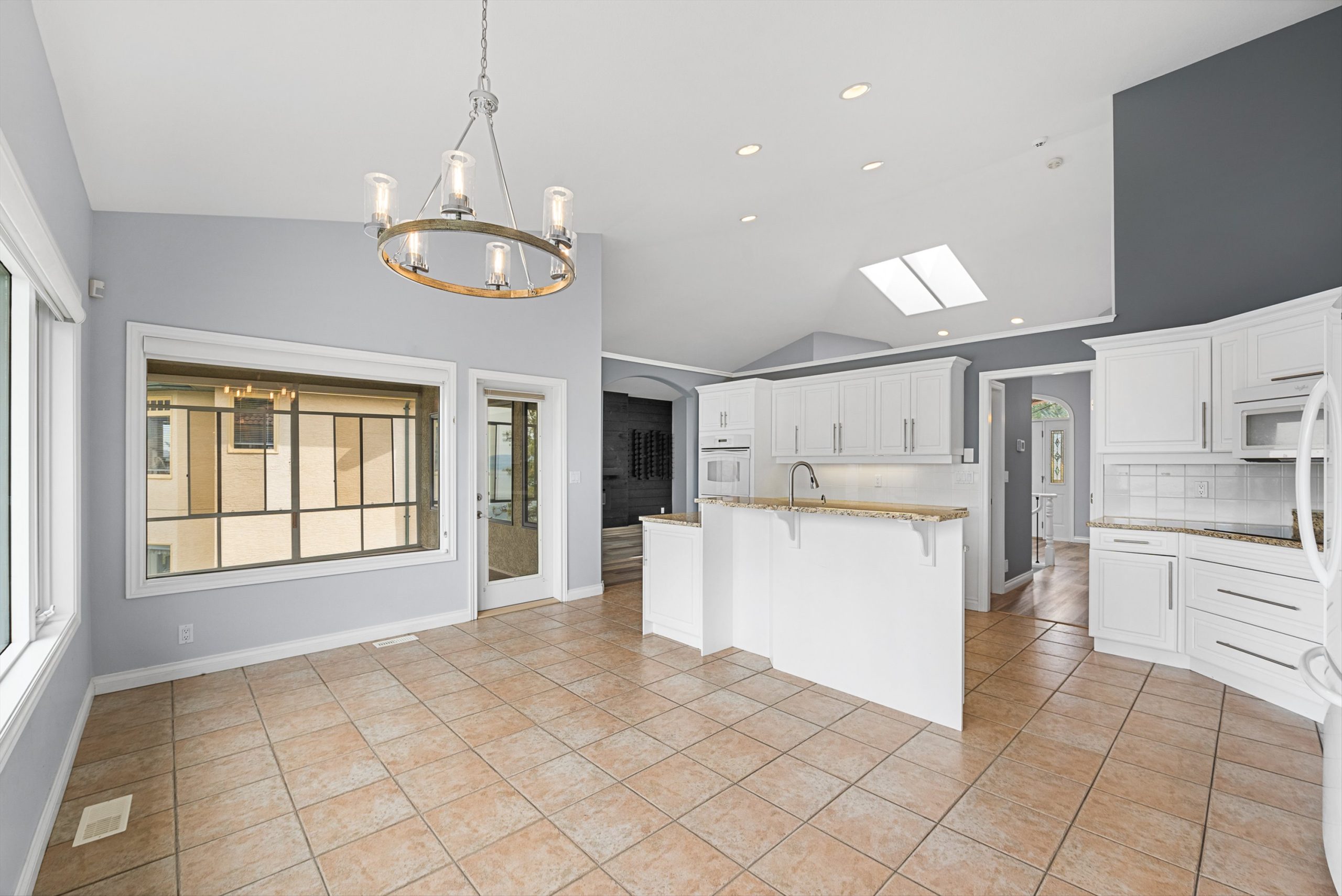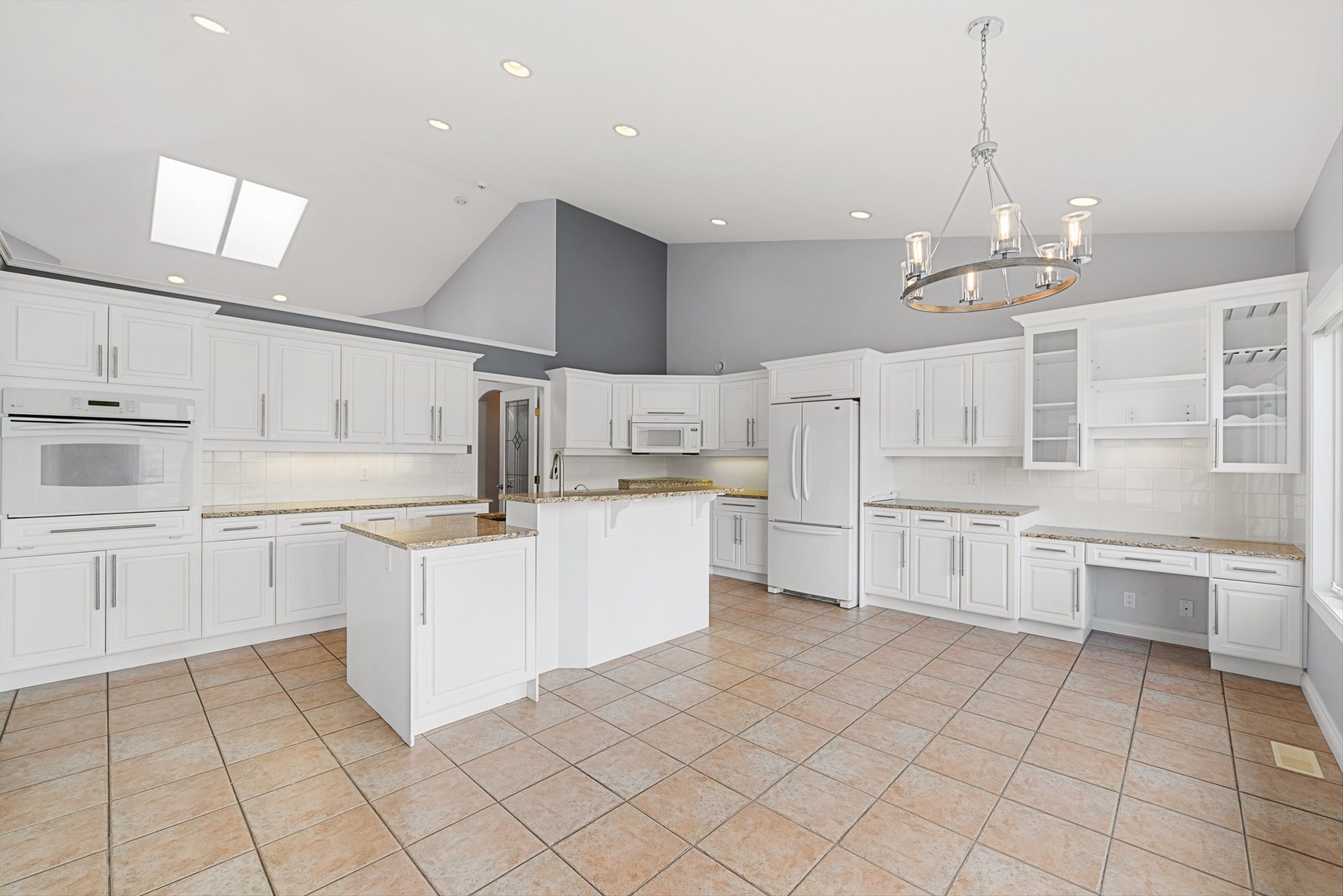 The vaulted living room with shiplap feature wall and electric linear fireplace flows into a spacious kitchen with granite counters, white shaker cabinetry, walk-in pantry and central island with undermount sink and raised eating bar, all positioned to capture the views. The adjoining dining area opens to a glass-enclosed sunroom and new Duradek surface with frameless glass railings, ideal for four-season indoor-outdoor living.