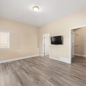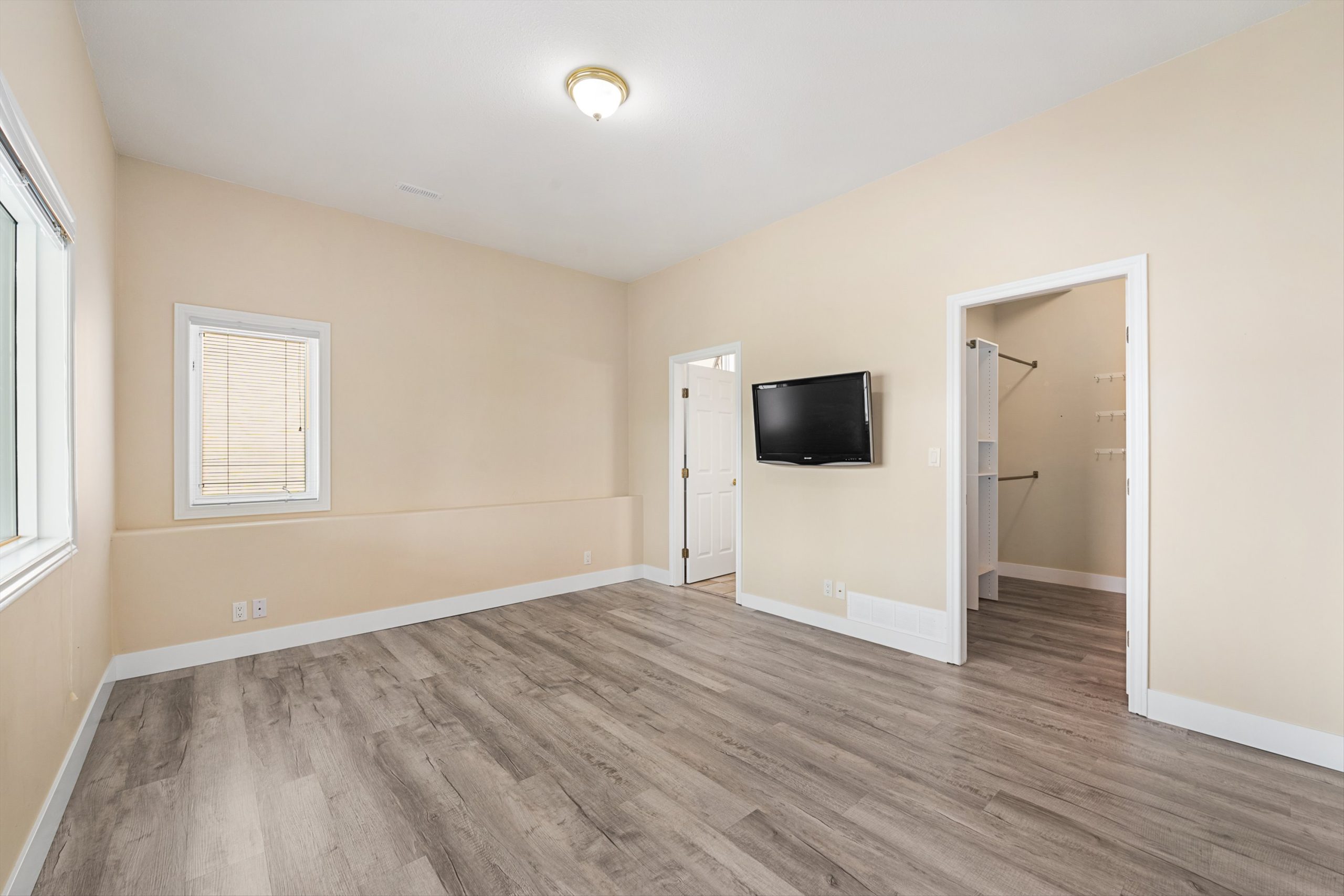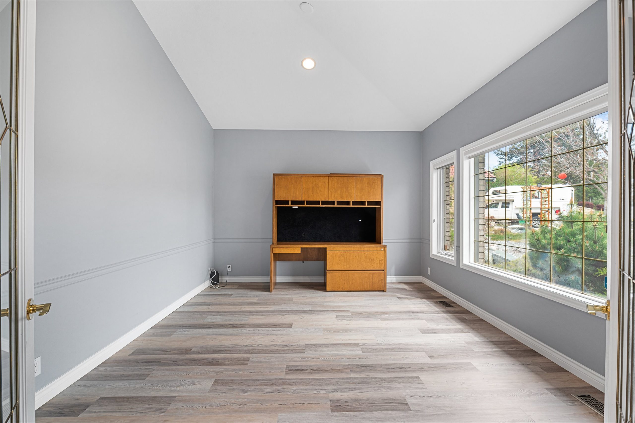 The main floor also includes a bright office/den, updated powder room, laundry with garage access, and a serene primary retreat with cork flooring, deck access, walk-in closet and a luxurious 5-piece ensuite with freestanding tub and fully tiled walk-in shower (2023).