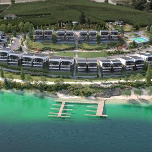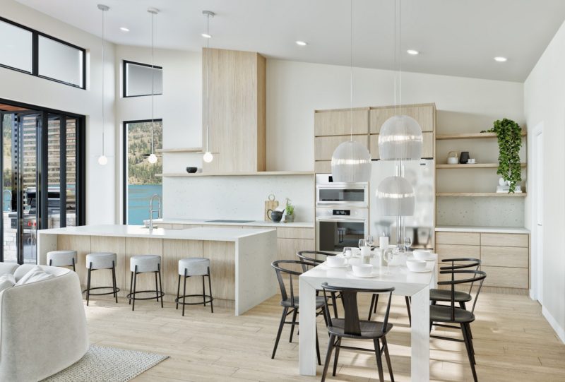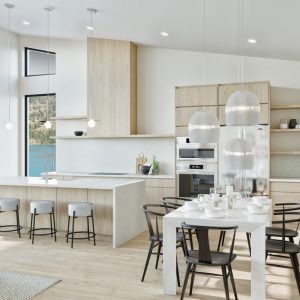 A chef-inspired kitchen with premium appliances, generous island and walk-in pantry anchors the space, while sliding doors open to a covered balcony, perfect for outdoor dining and relaxed evenings overlooking the lake.