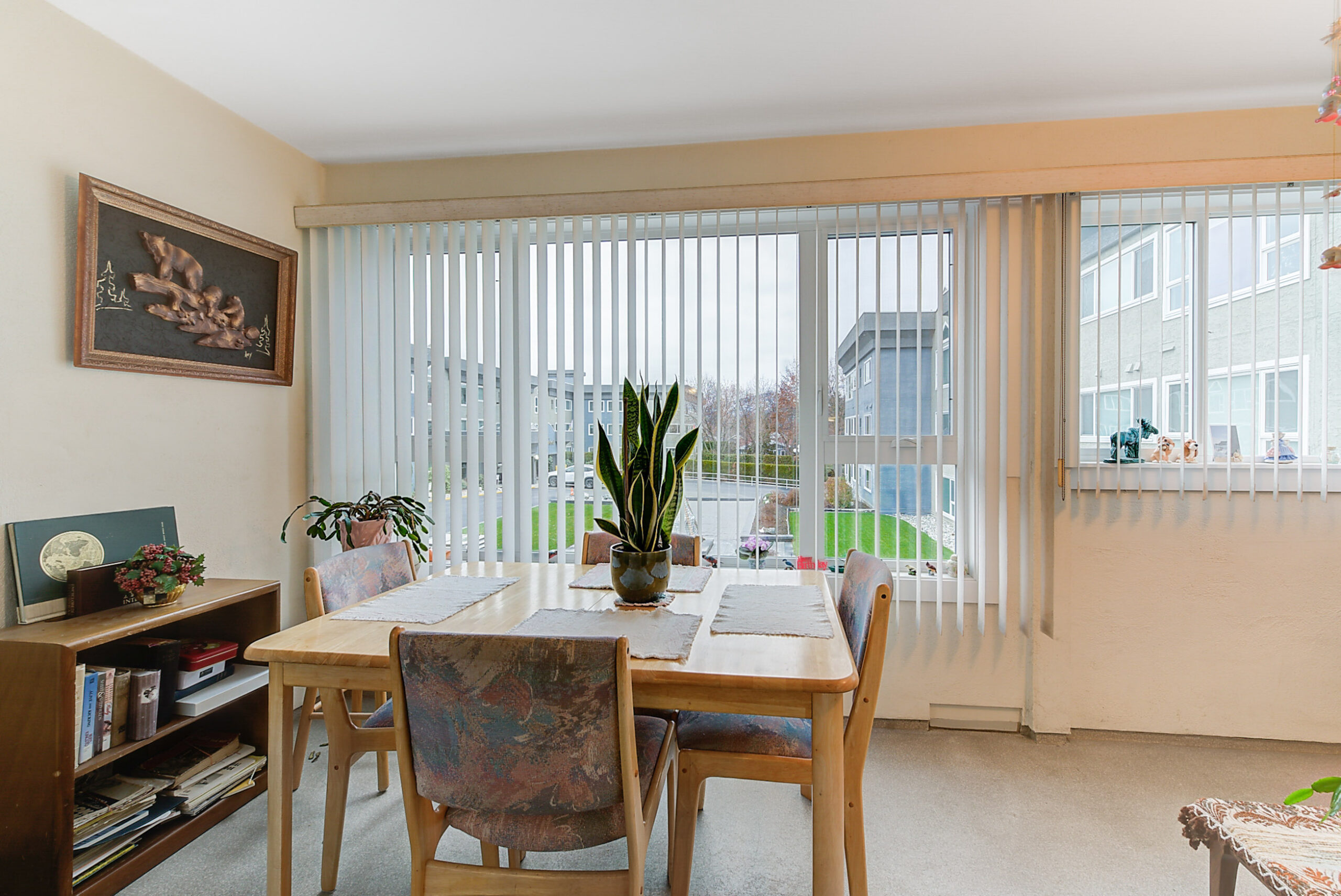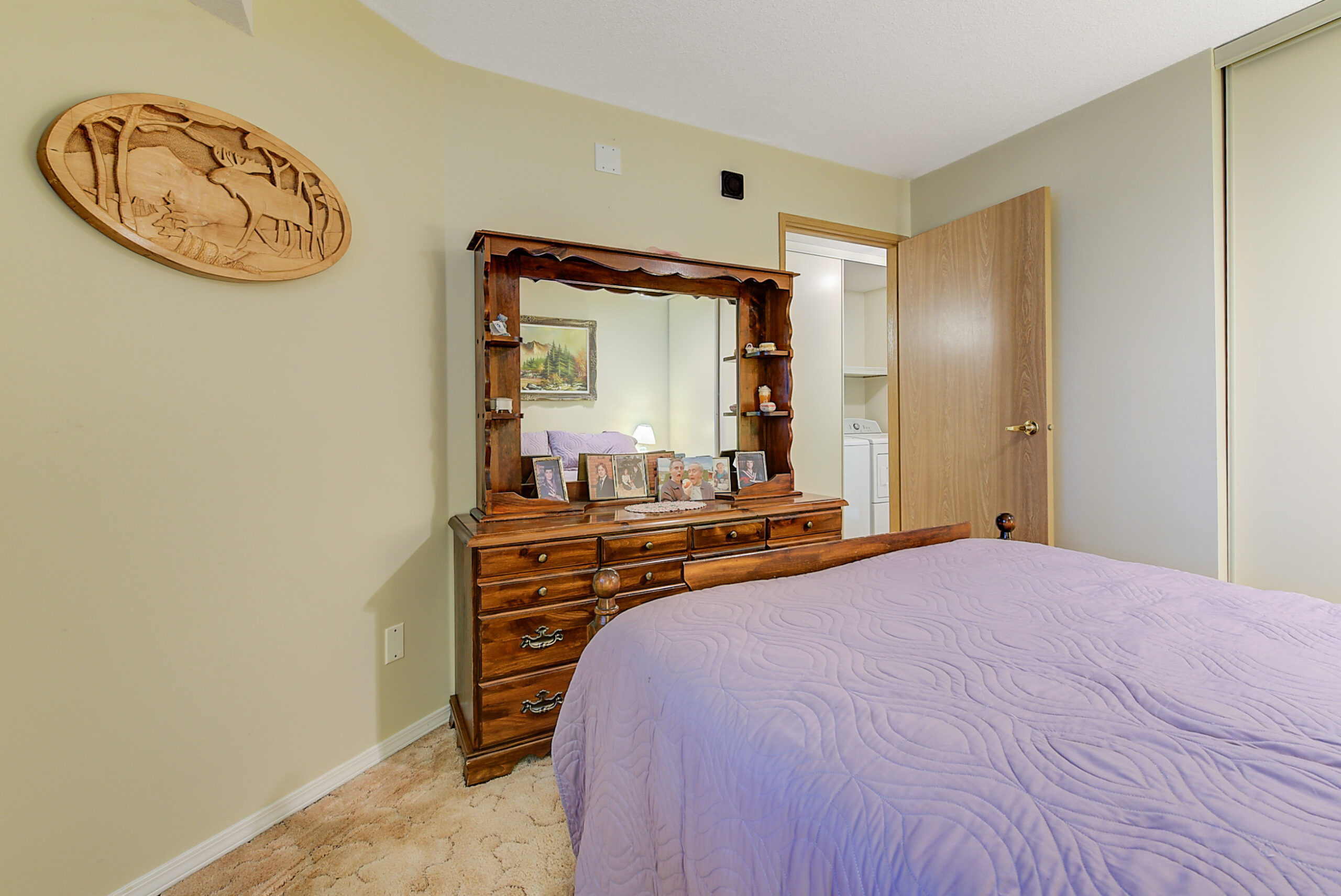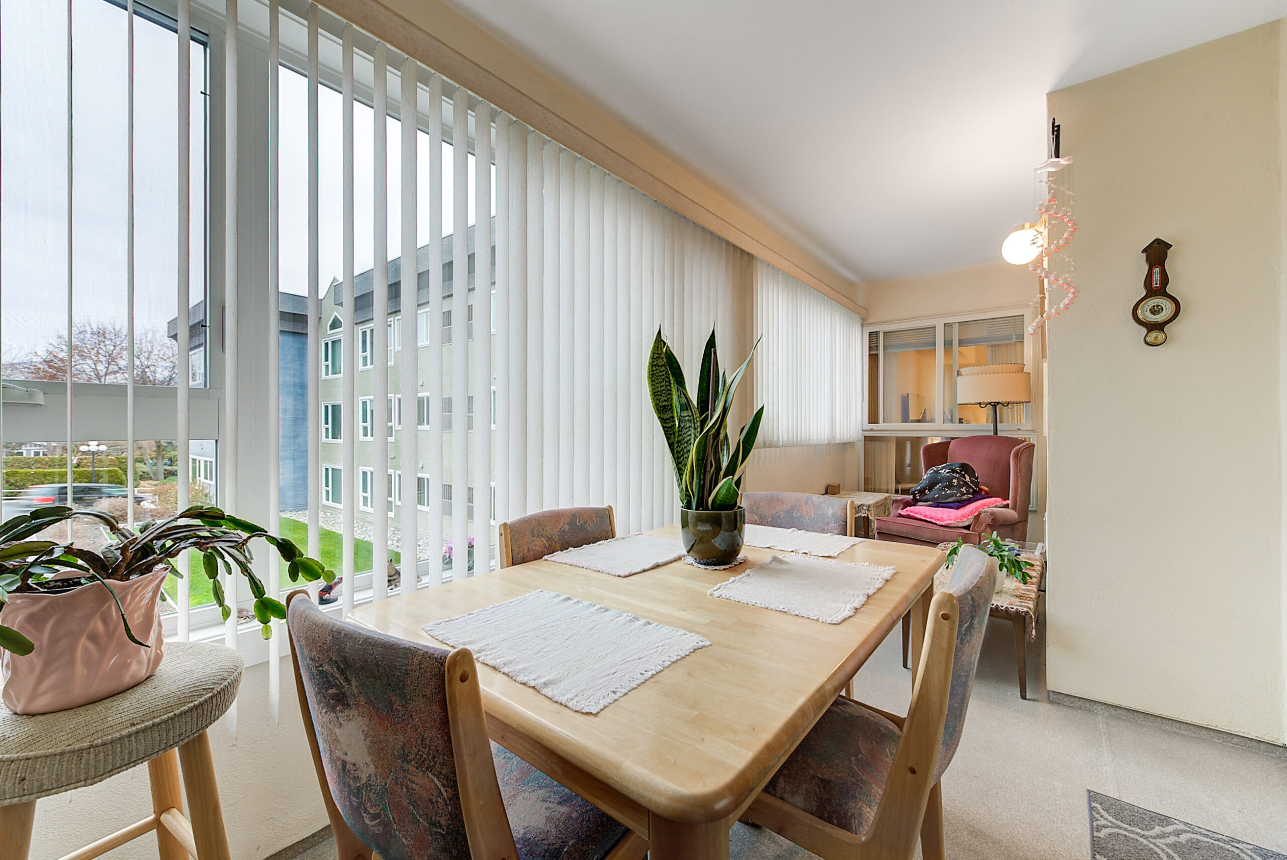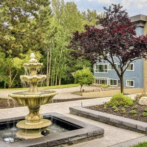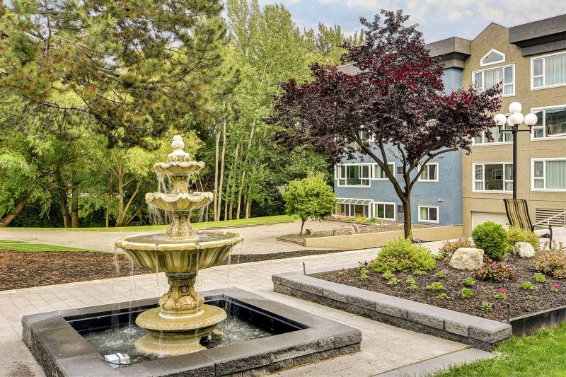 The large living room leads to an enclosed sunroom offering space for a sitting area and table overlooking the courtyard and fountain. Off the living room is a separate dining area with a passthrough to the kitchen which offers a wonderful layout with ample storage space. Primary bedroom has a a walk-in closet and a 3 piece ensuite. Generous-sized additional bedroom with an adjacent 4 piece bath.