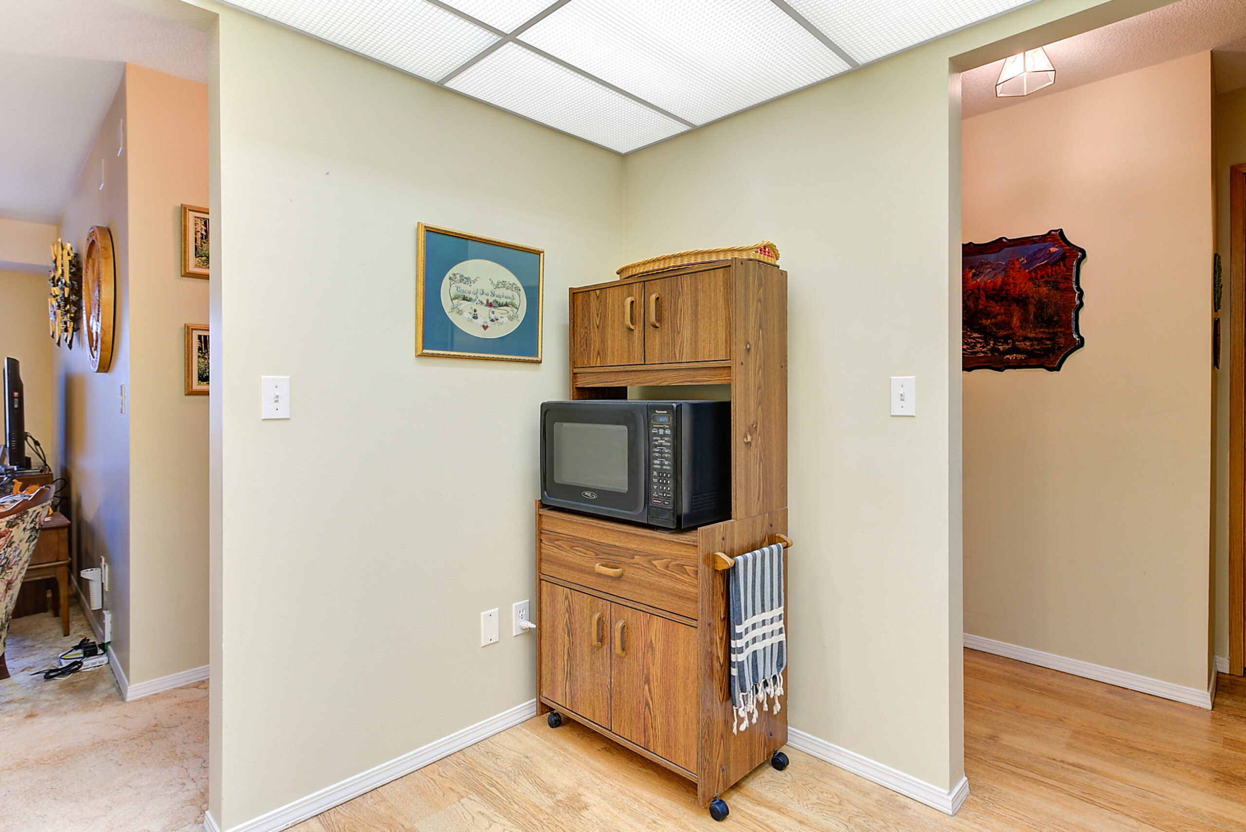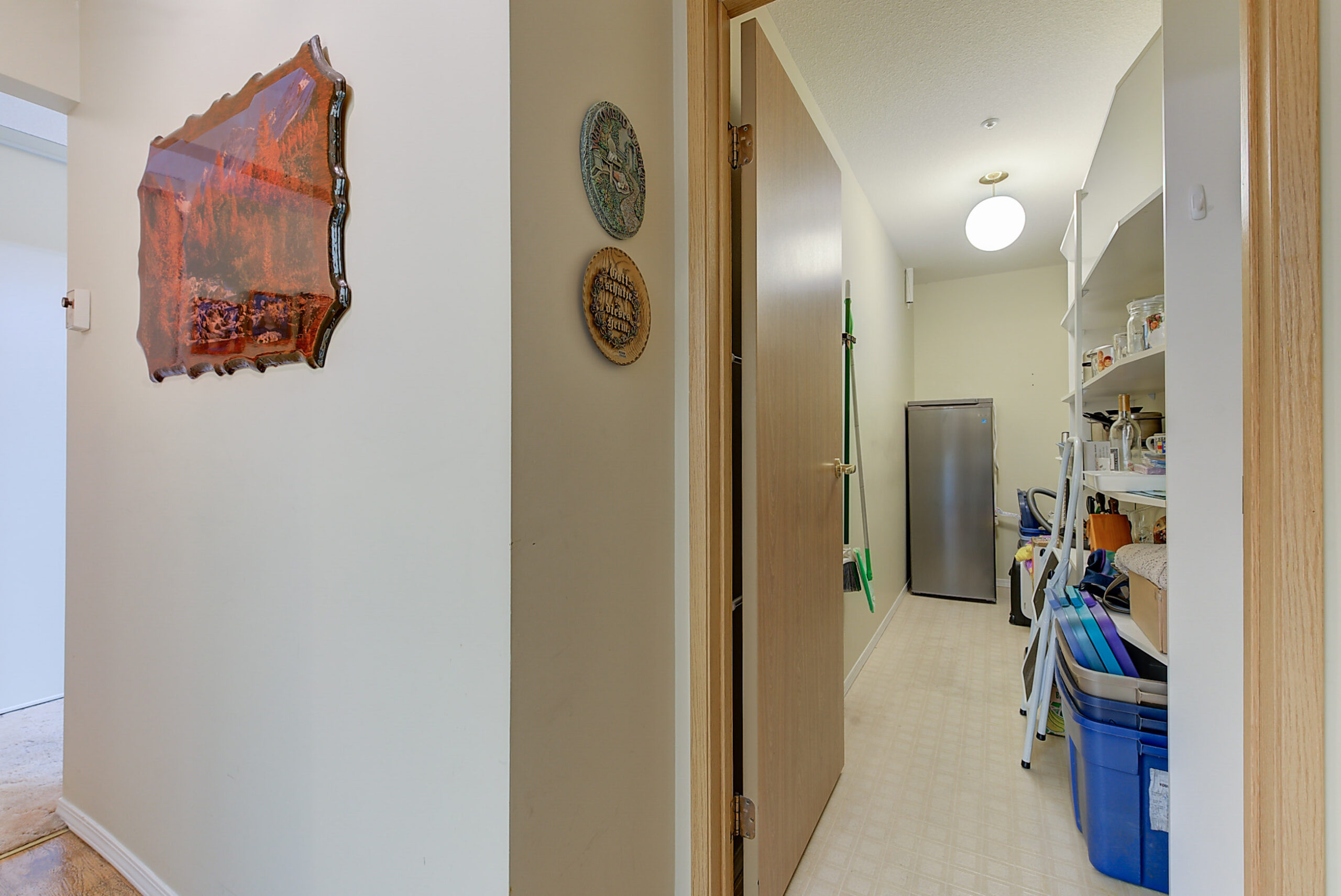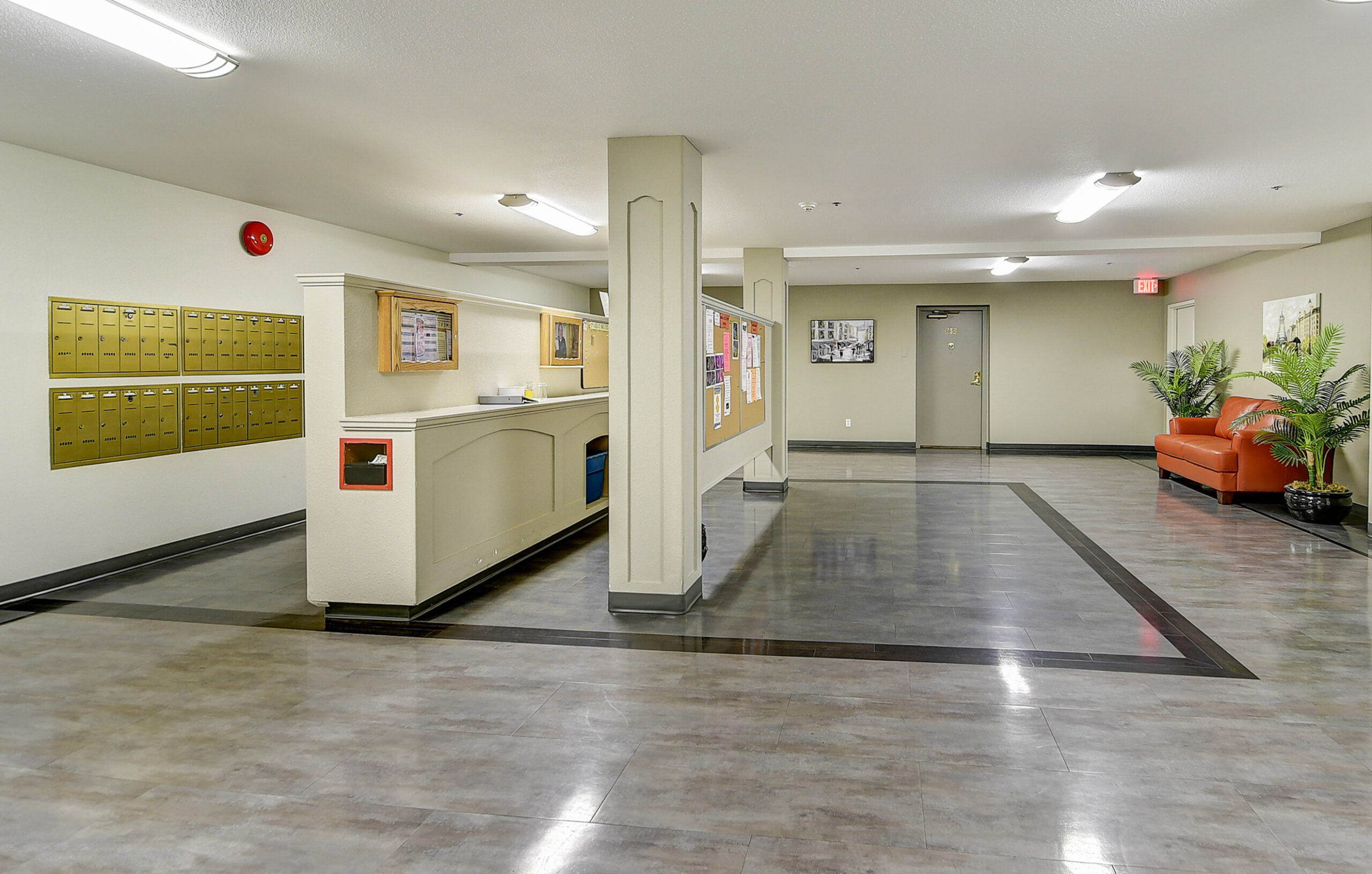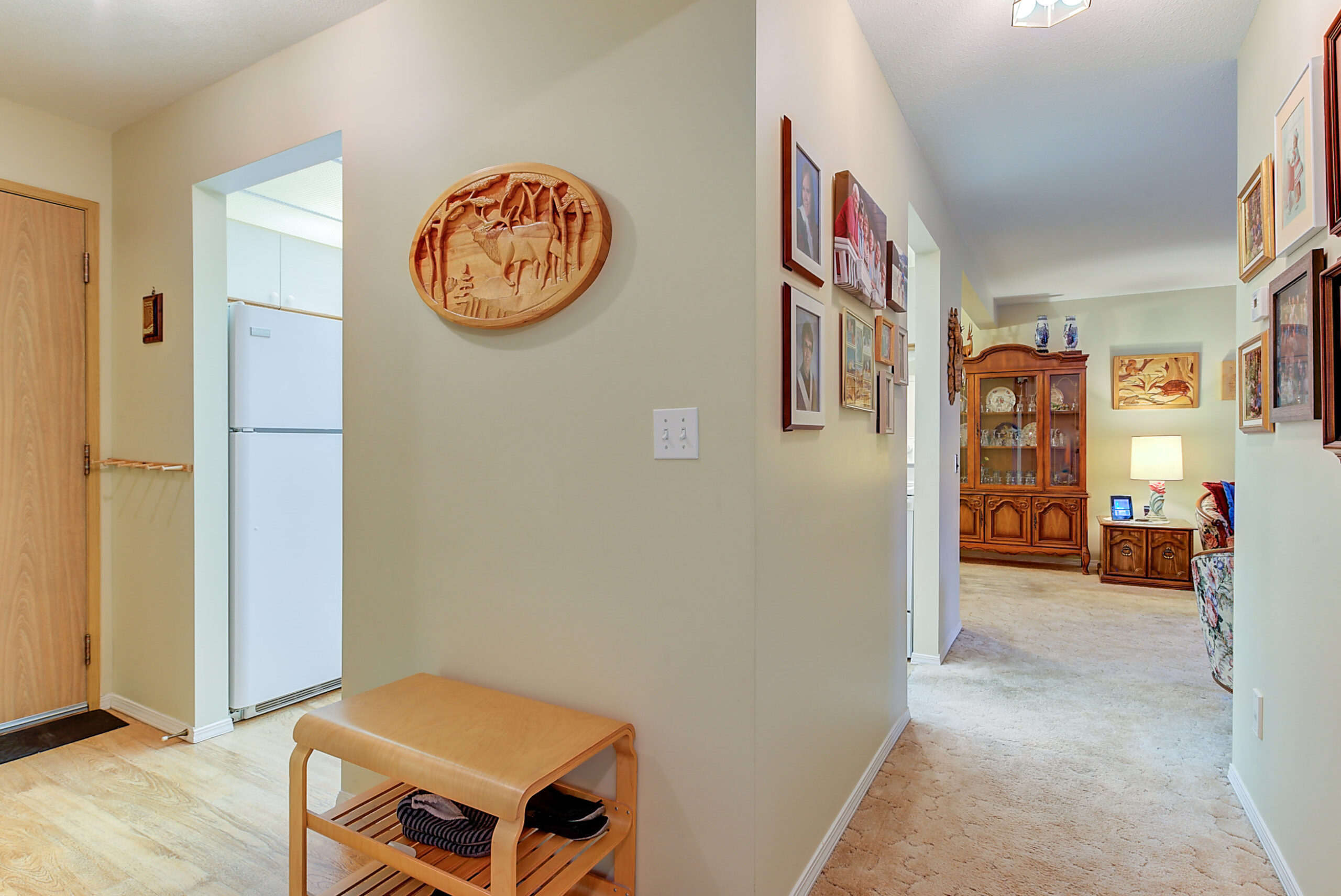 The large living room leads to an enclosed sunroom offering space for a sitting area and table overlooking the courtyard and fountain. Off the living room is a separate dining area with a passthrough to the kitchen which offers a wonderful layout with ample storage space. Primary bedroom has a a walk-in closet and a 3 piece ensuite. Generous-sized additional bedroom with an adjacent 4 piece bath.
