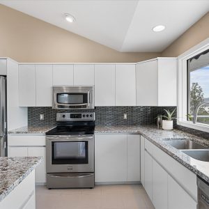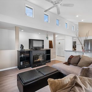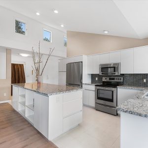 Inside, expansive windows and vaulted ceilings bring light and views into the main living spaces, where the kitchen, dining, and family rooms flow together toward the west-facing deck, perfect for evening sunsets. The bright kitchen features a large central island, modern flat-front cabinetry, updated granite countertops, and a lake-facing sink, while the adjacent living area centers around a glass-enclosed gas fireplace.
