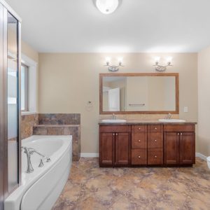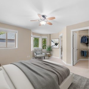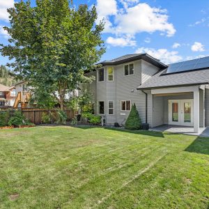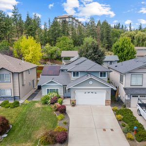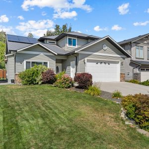 Upstairs, the expansive primary suite features bay windows overlooking the backyard, a walk-in closet, and a 5-piece ensuite with soaker tub and glass shower. Two additional bedrooms and a full bath provide comfort for family or guests. Outdoors, enjoy a covered patio with roll-down screen, a large fenced yard with mature landscaping, and raised garden beds—perfect for pets, play, and entertaining. A double garage with built-in shelving and driveway parking for two add convenience to this exceptional property. Roof is equipped with solar panels.