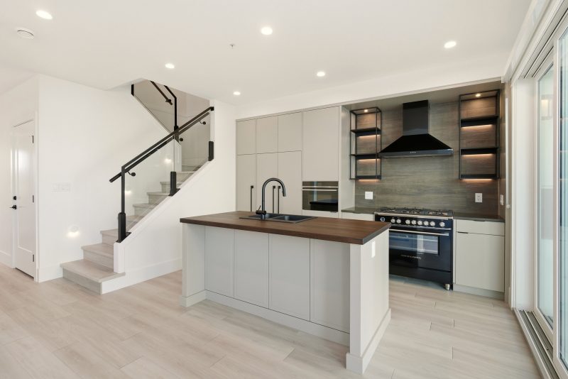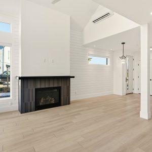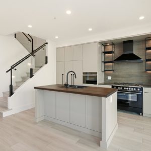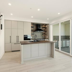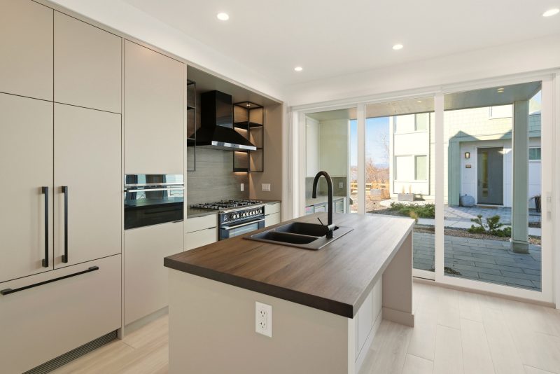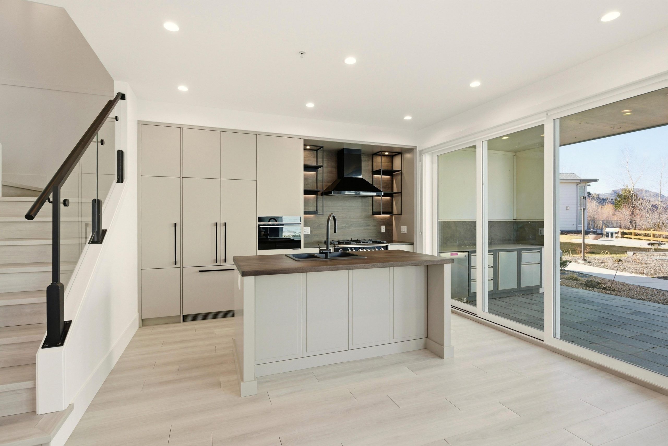 The chef-inspired kitchen pairs sleek modern cabinetry with engineered stone countertops, a distinctive butcher block island and premium Fisher & Paykel appliances, including a paneled refrigerator, dual-fuel range, speed microwave oven and double drawer dishwasher. The dining area flows seamlessly to a spacious tiled patio with a built-in outdoor kitchen, creating an effortless extension of the interior living space, perfect for lakeside entertaining.