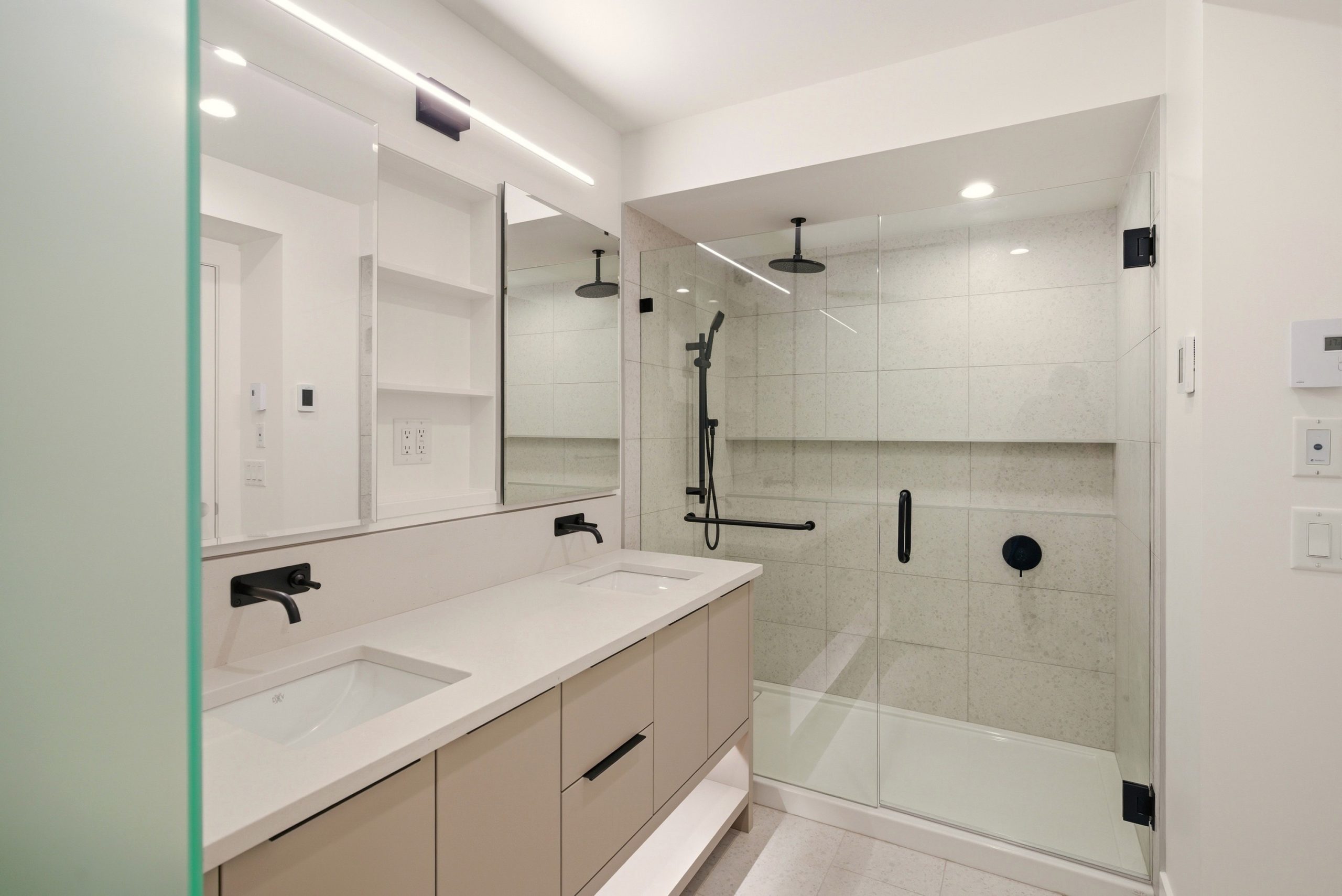Upstairs, the primary retreat offers lake views, custom closets and a spa-like ensuite with double vanity and frameless glass shower. Two additional bedrooms, a full bath with designer tile finishes, and a loft-style office or reading nook complete the upper level.