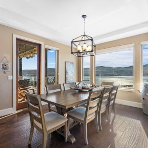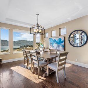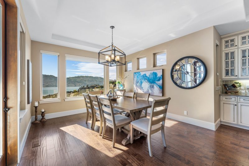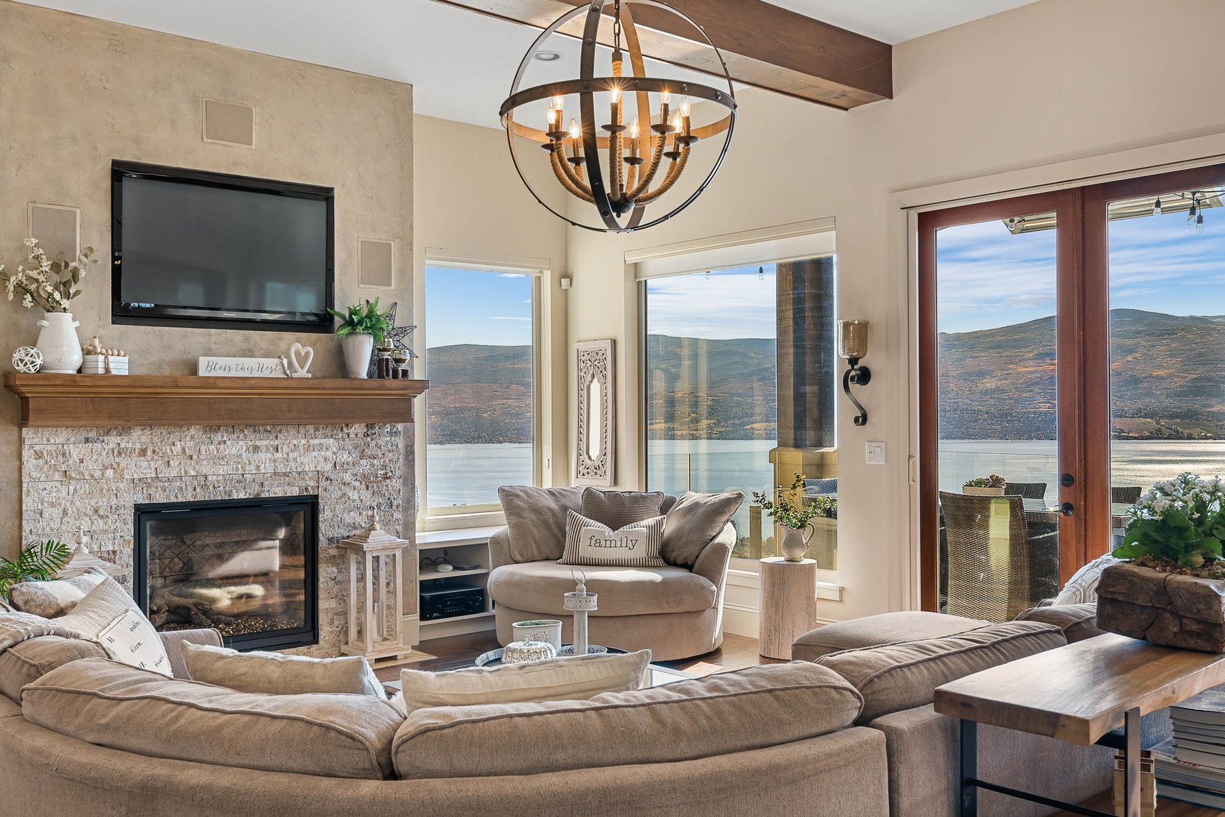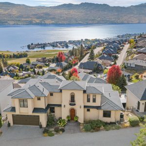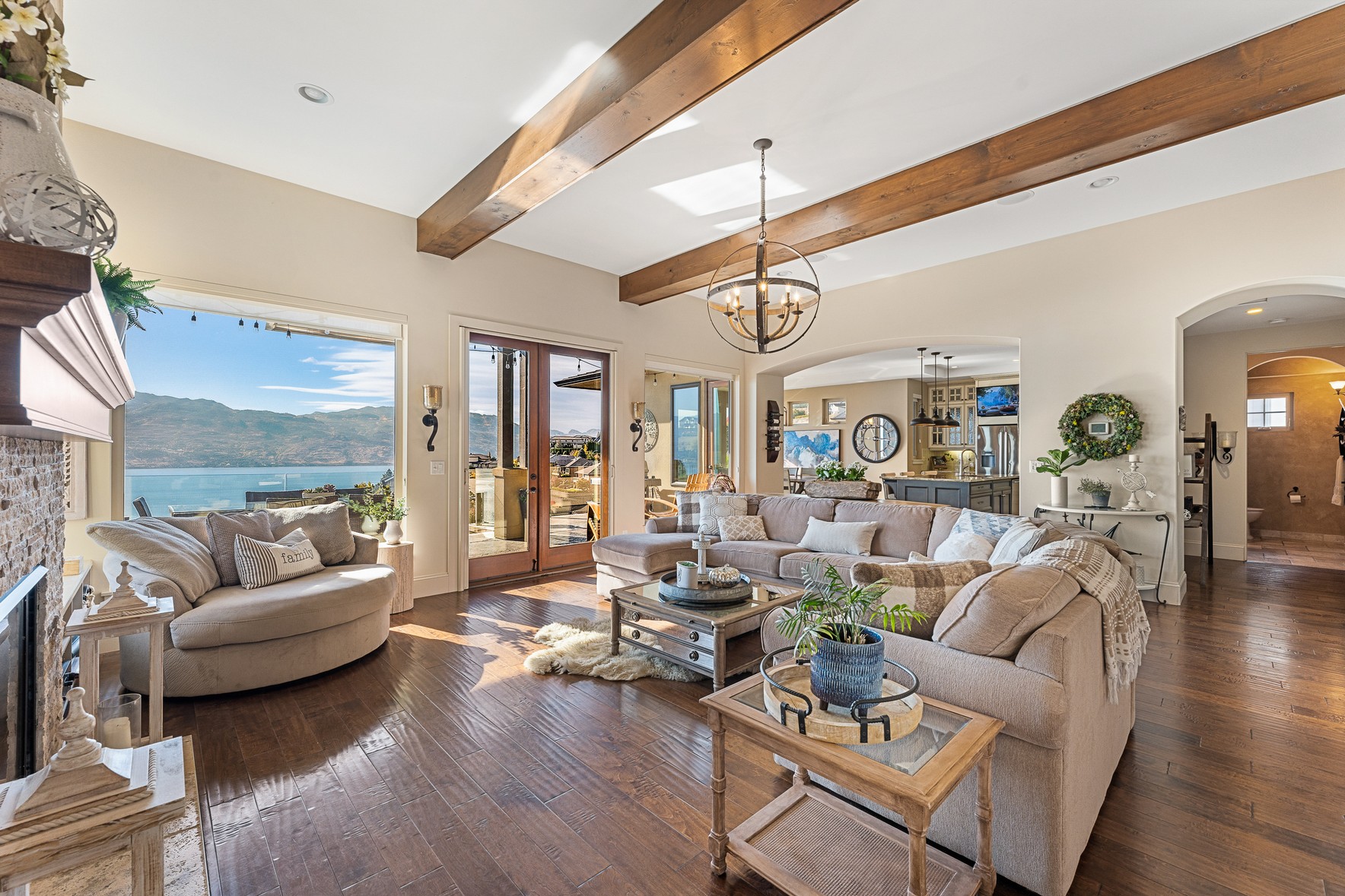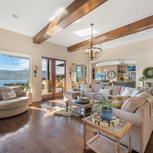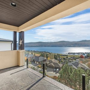 Set above Okanagan Lake in Lakeview Heights, this West Kelowna home offers the warmth and character of a Mediterranean-inspired villa, subtly echoing the relaxed hillside homes of Tuscany. Just minutes from the Westside Wine Trail, it feels connected to the surrounding vineyards, with natural stone, rich wood detailing, and sunlit rooms that open to the lake. On the main level, timber beams, textured walls, and a stone fireplace anchor the great room, where French doors lead to a covered lakeview patio with wood-inlay ceilings, infrared heaters, and space for relaxed dinners outdoors.