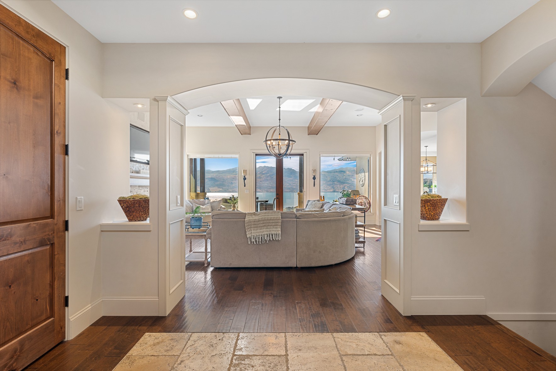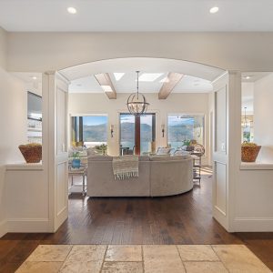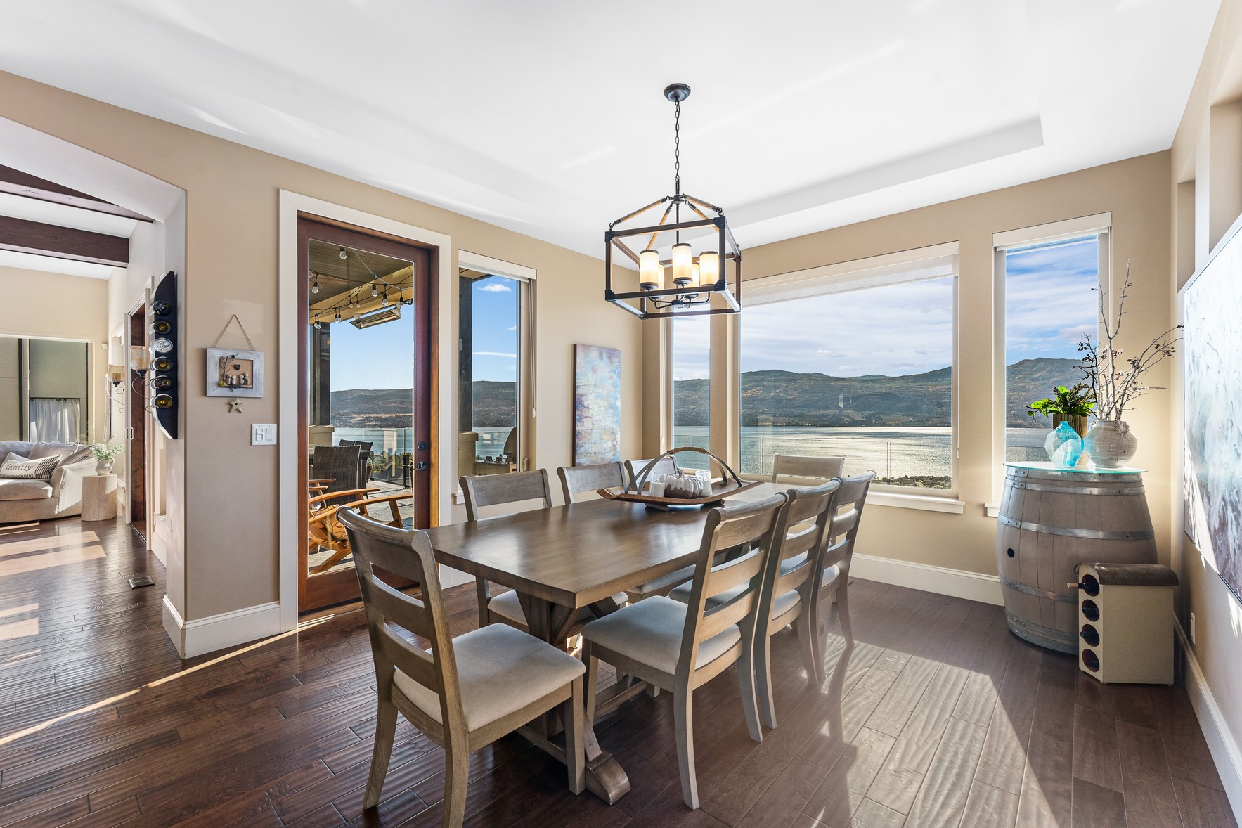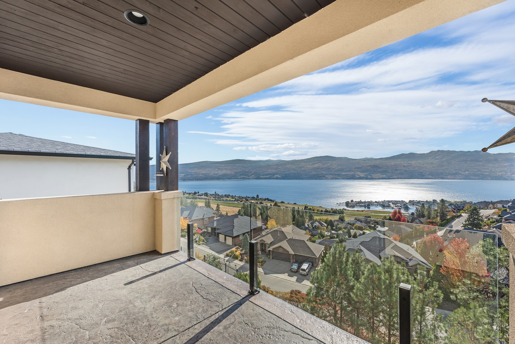 Set above Okanagan Lake in Lakeview Heights, this West Kelowna home offers the warmth and character of a Mediterranean-inspired villa, subtly echoing the relaxed hillside homes of Tuscany. Just minutes from the Westside Wine Trail, it feels connected to the surrounding vineyards, with natural stone, rich wood detailing, and sunlit rooms that open to the lake. On the main level, timber beams, textured walls, and a stone fireplace anchor the great room, where French doors lead to a covered lakeview patio with wood-inlay ceilings, infrared heaters, and space for relaxed dinners outdoors.