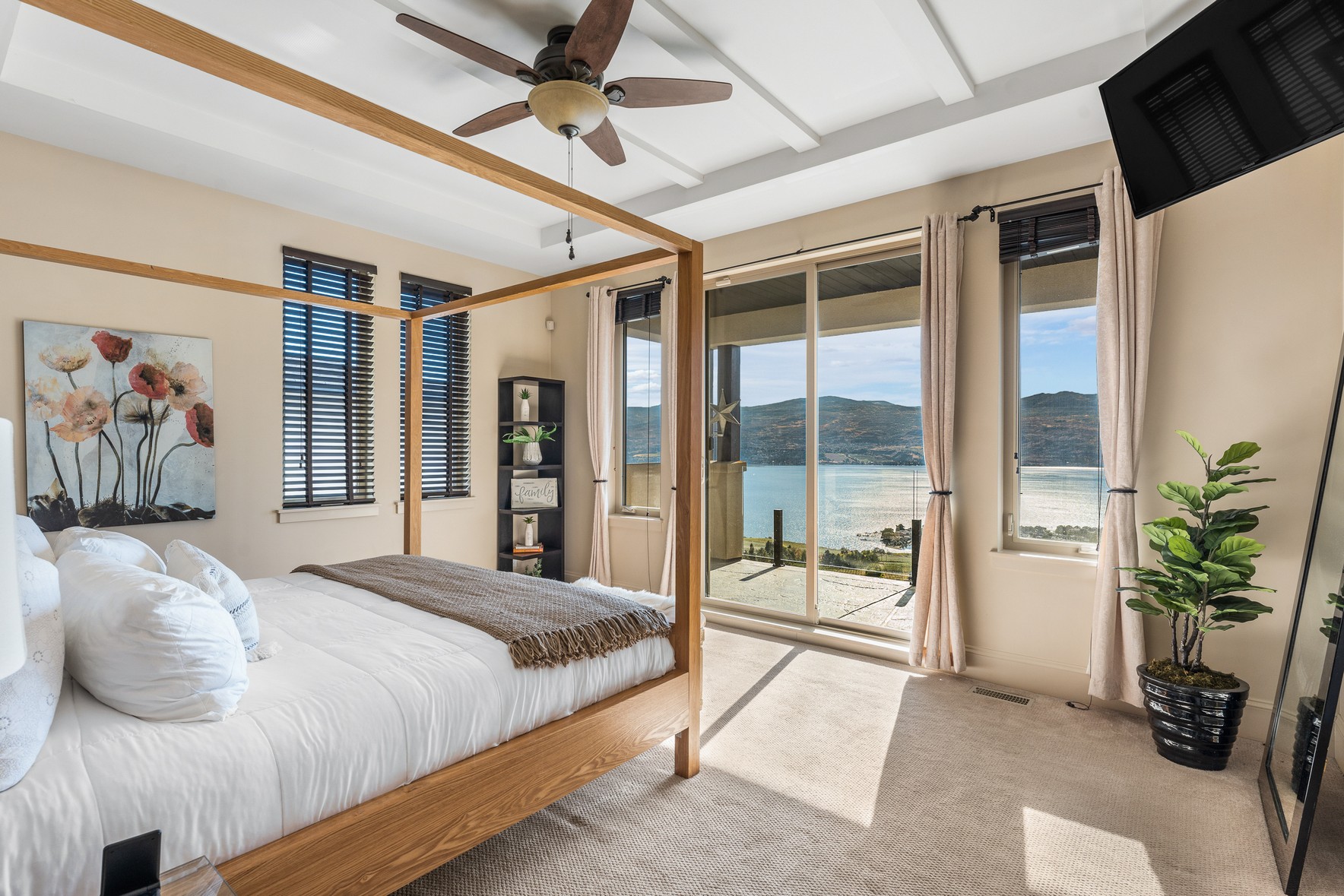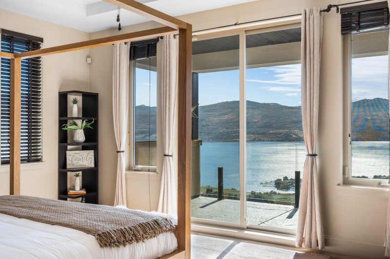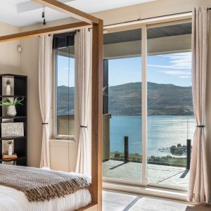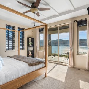 The entire upper floor is devoted to the primary suite, offering two walk-in closets, a spa-style ensuite with heated travertine, soaker tub, and walk-in shower, plus a private covered balcony with lake and valley views.