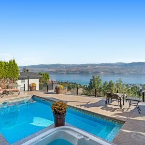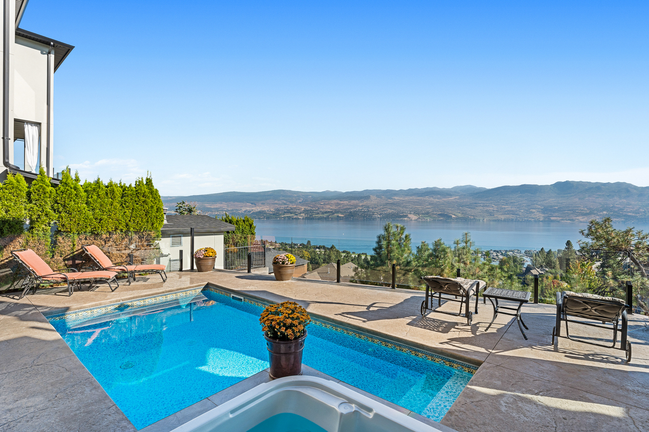 On the walkout level, a generous recreation room, custom bar, and direct access to the pool terrace make entertaining effortless, from afternoon swims to evenings in the hot tub or around the firepit. A self-contained studio suite on the lower level adds flexibility for extended stays, or multi-generational living. Manicured landscaping, water features, an oversized double garage with abundant storage, and a convenient tiled dog wash complete a home that blends classic Mediterranean detailing with the relaxed Okanagan lifestyle.