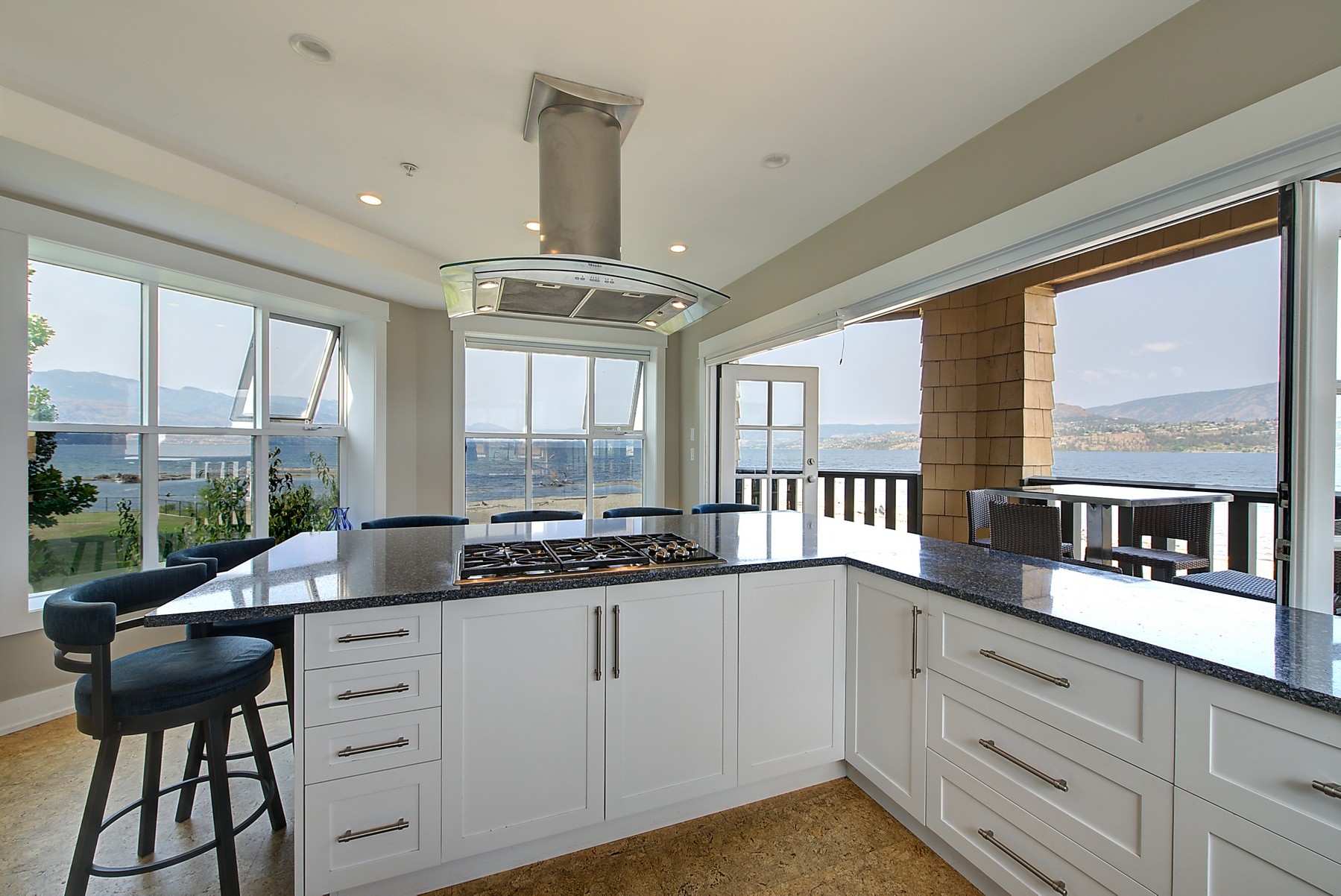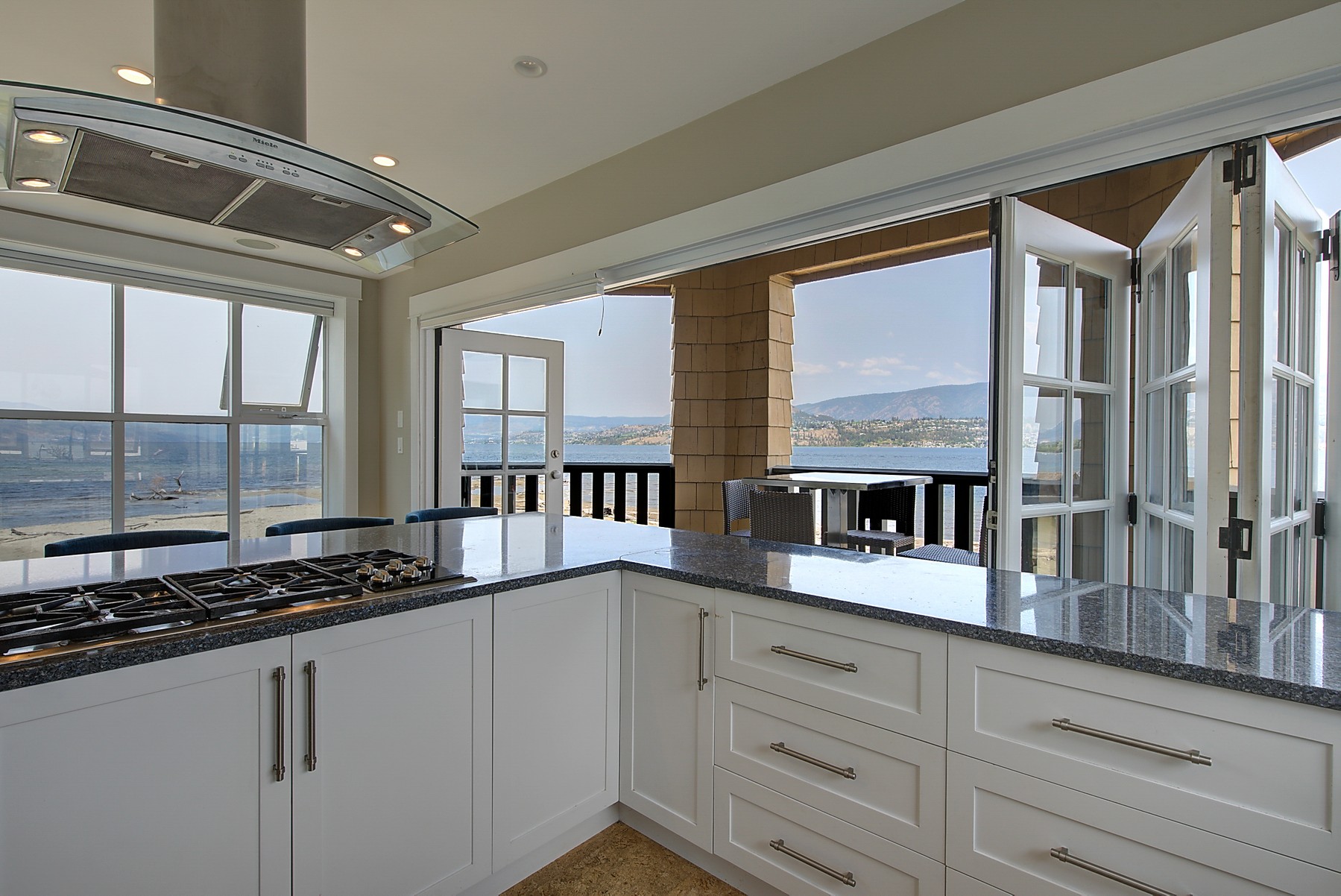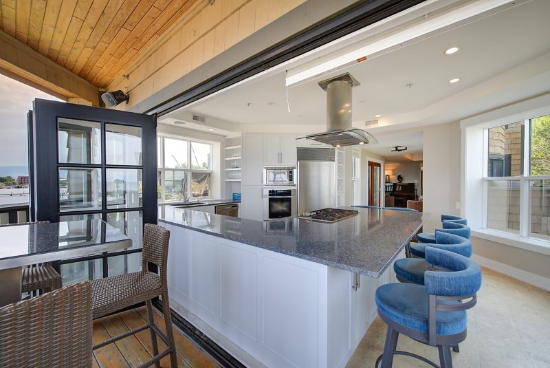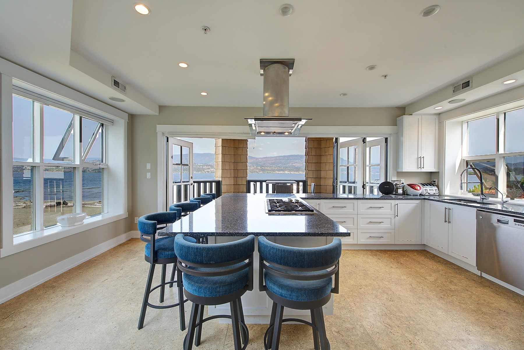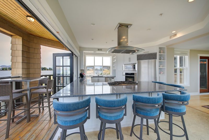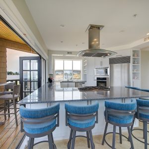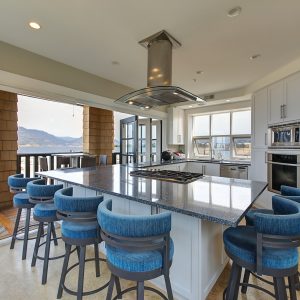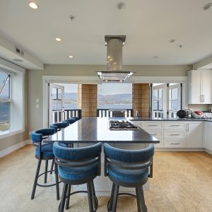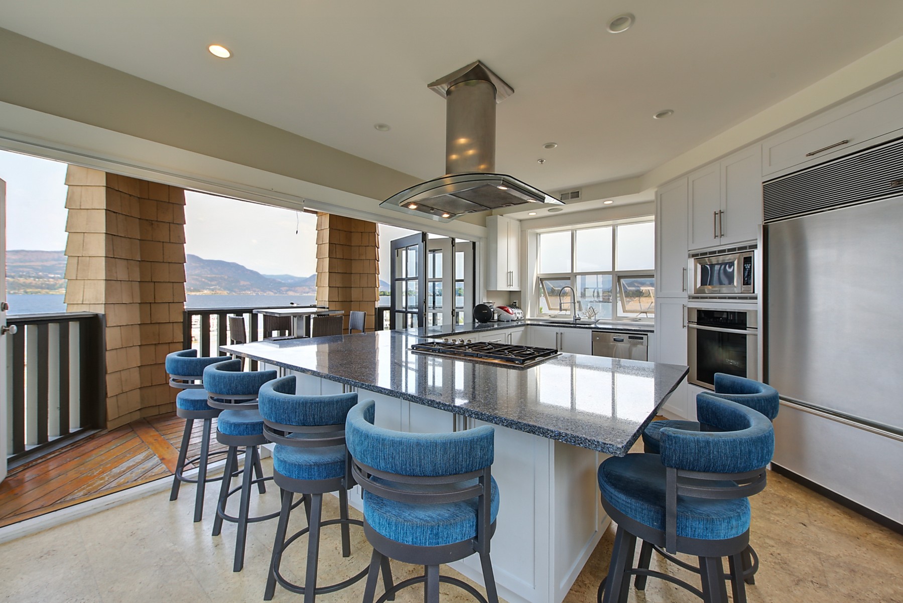 The kitchen design is truly incredible with a lakeside wall that completely opens to the balcony effortlessly engaging the beauty of the lakefront setting with the interior. Kitchen features 6-person island seating, quartz counters, white cabinetry and professional appliances. Spacious dining room is open to main living room with convenient access to the BBQ deck.