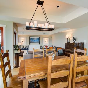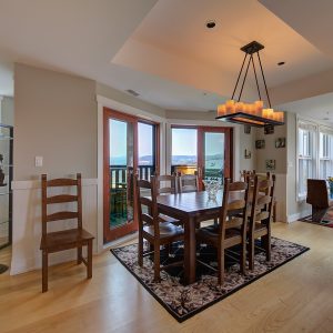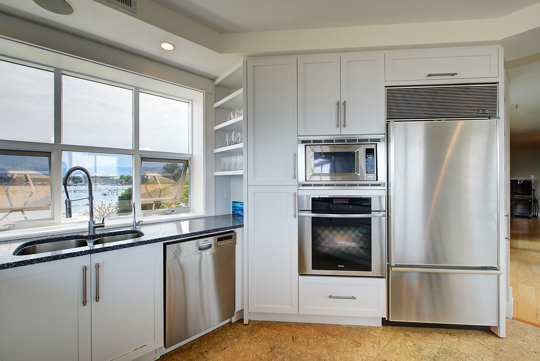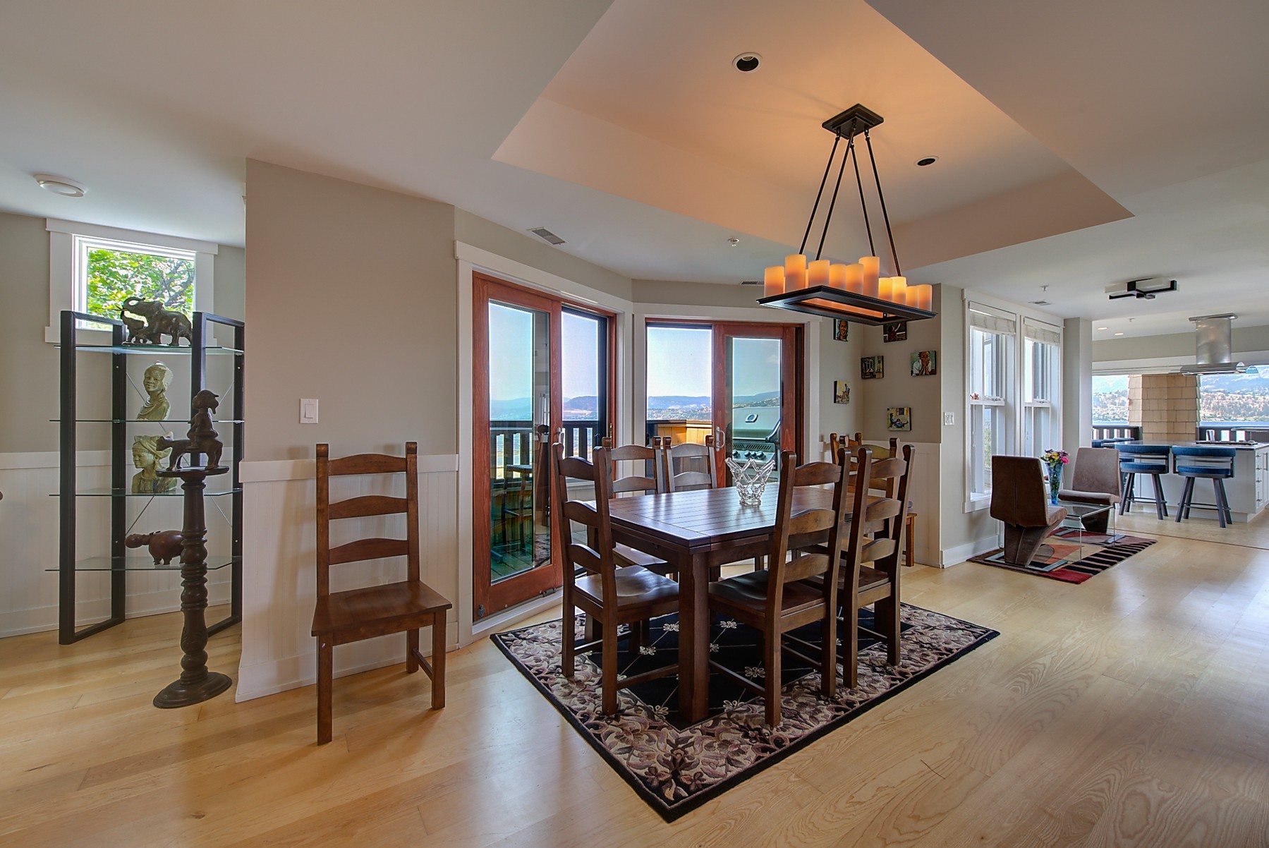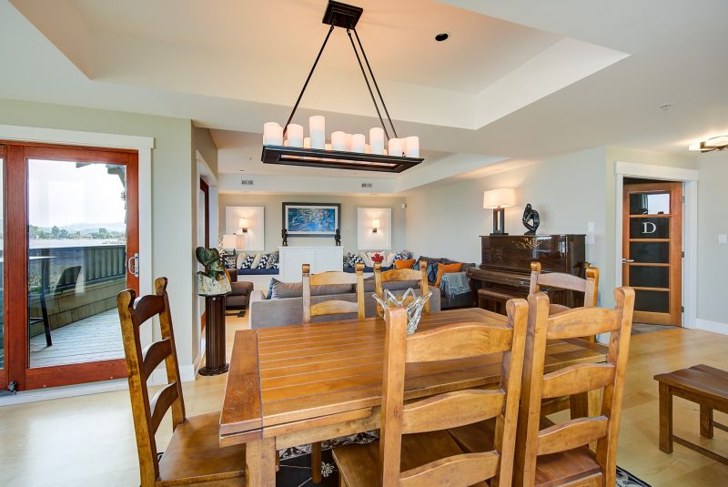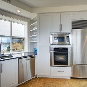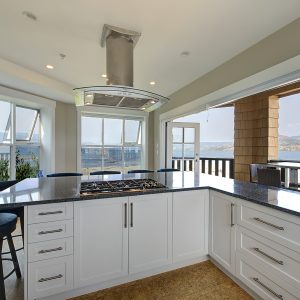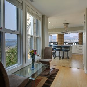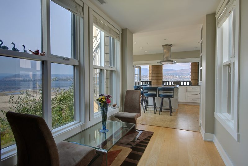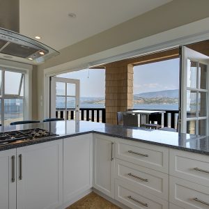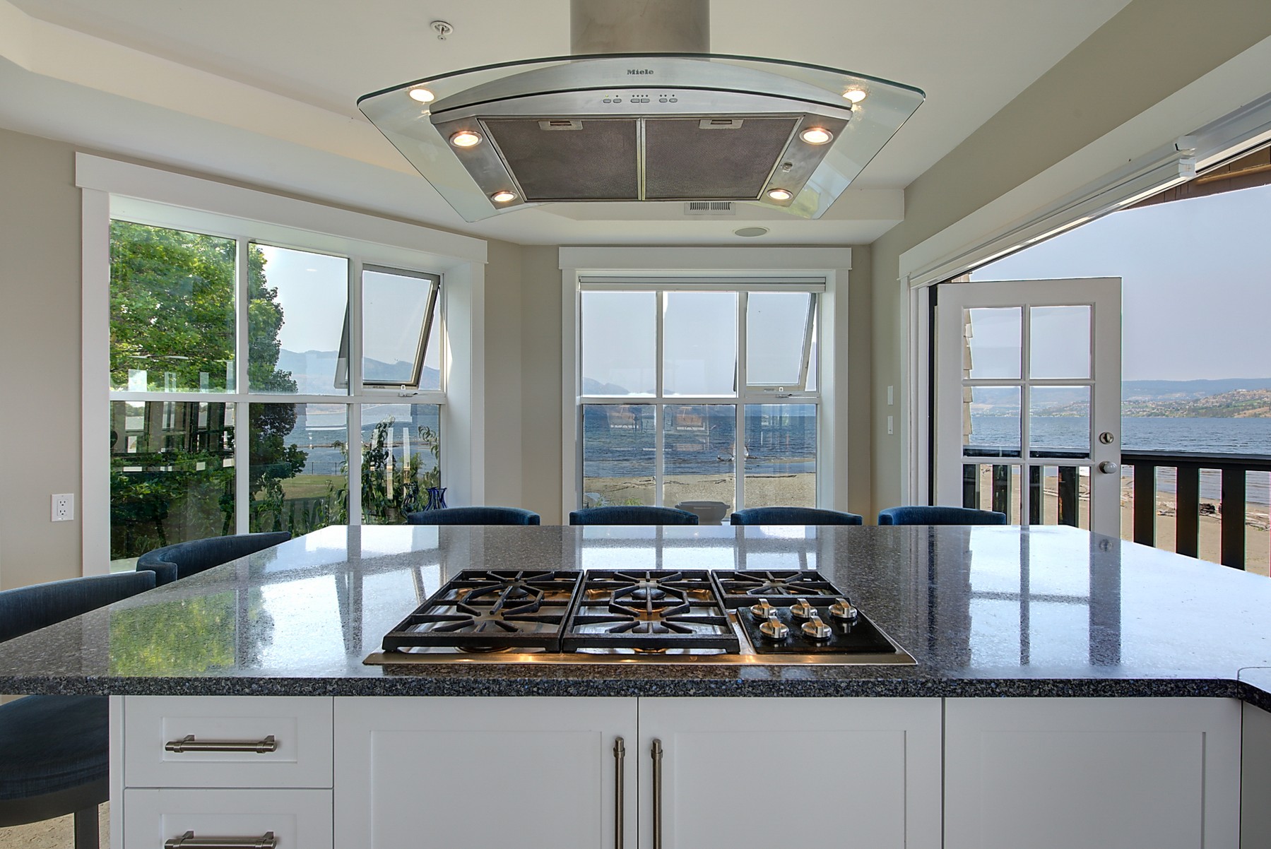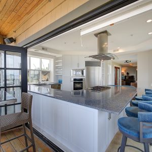 The kitchen design is truly incredible with a lakeside wall that completely opens to the balcony effortlessly engaging the beauty of the lakefront setting with the interior. Kitchen features 6-person island seating, quartz counters, white cabinetry and professional appliances. Spacious dining room is open to main living room with convenient access to the BBQ deck.