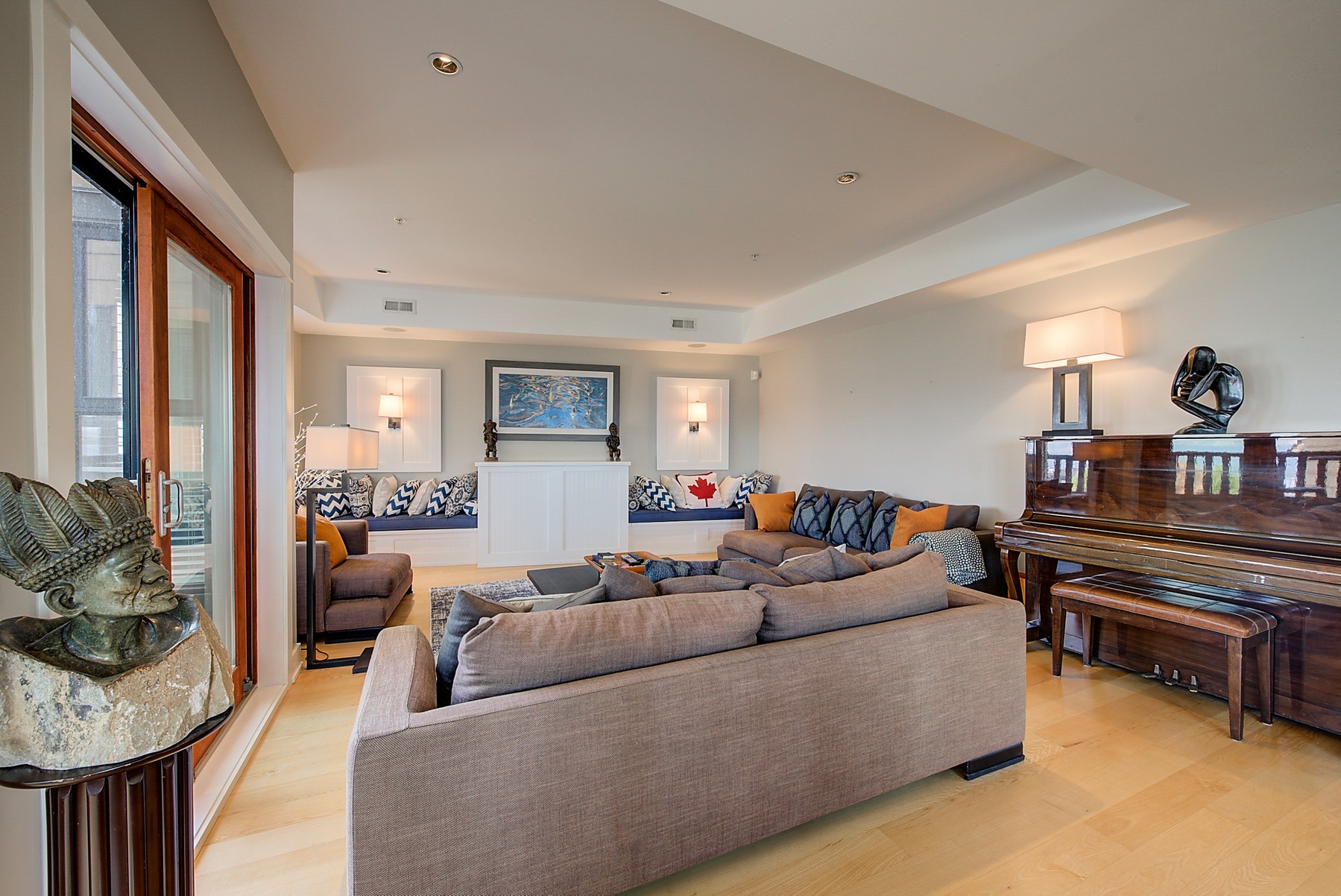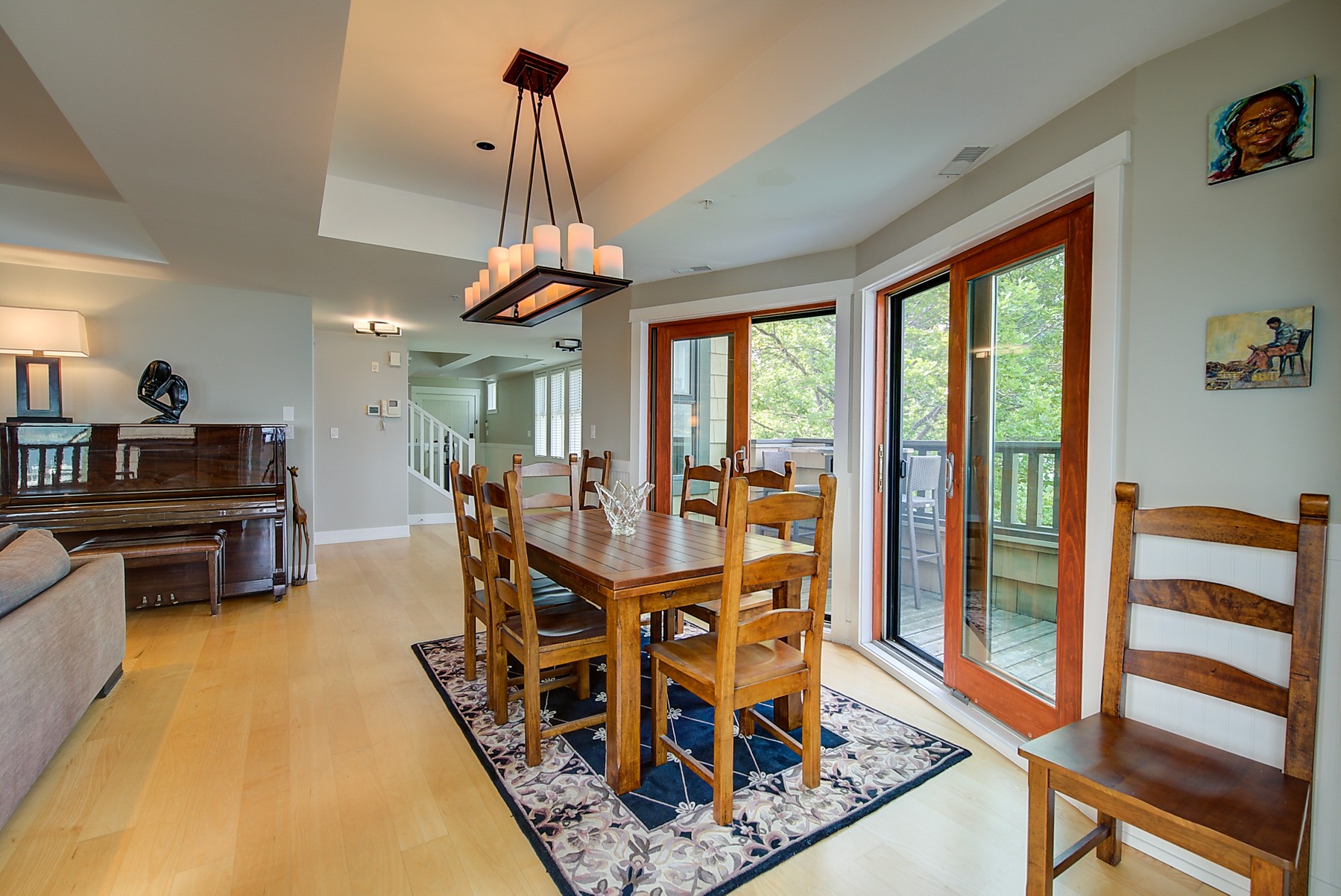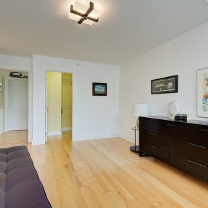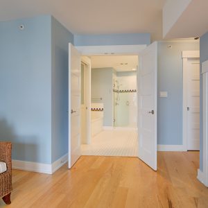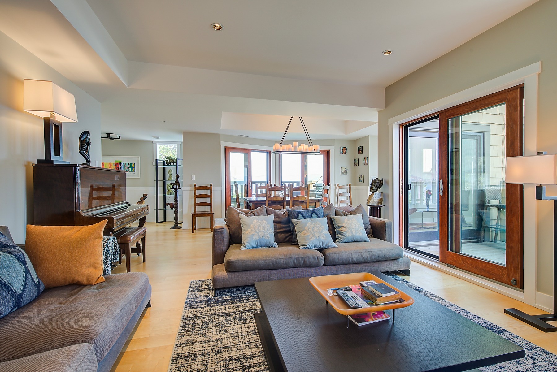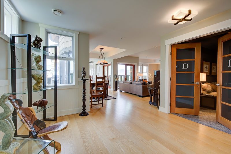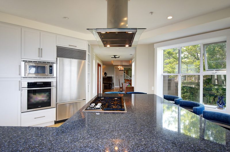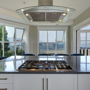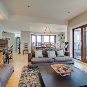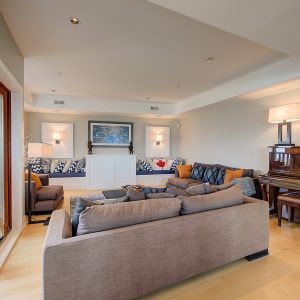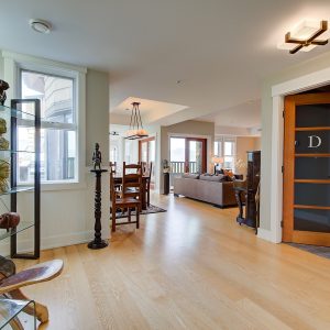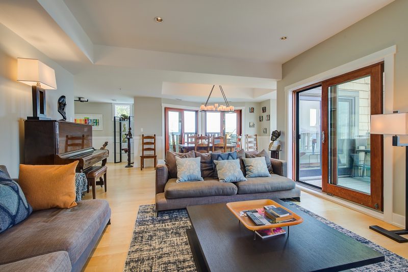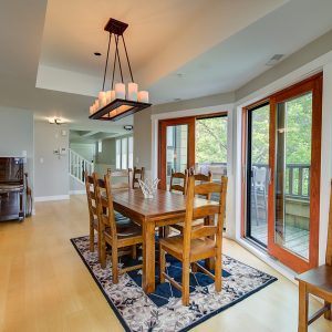 The kitchen design is truly incredible with a lakeside wall that completely opens to the balcony effortlessly engaging the beauty of the lakefront setting with the interior. Kitchen features 6-person island seating, quartz counters, white cabinetry and professional appliances. Spacious dining room is open to main living room with convenient access to the BBQ deck.