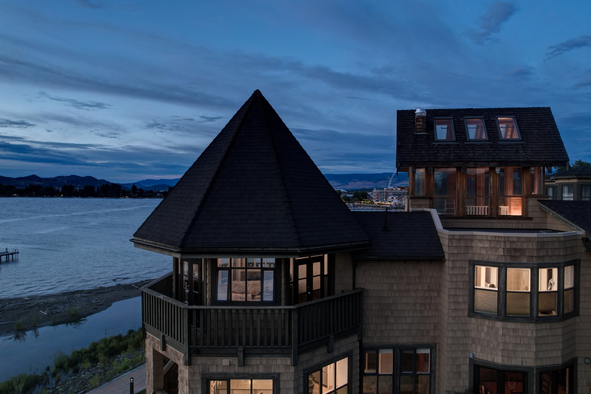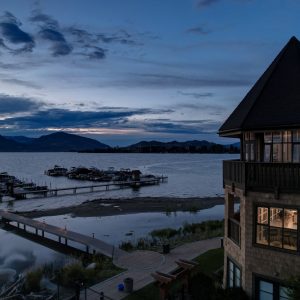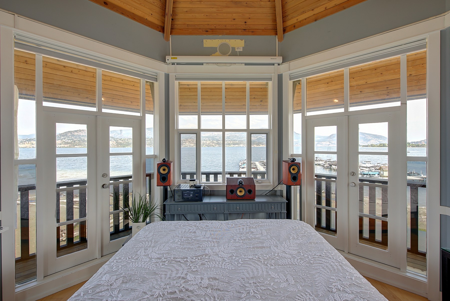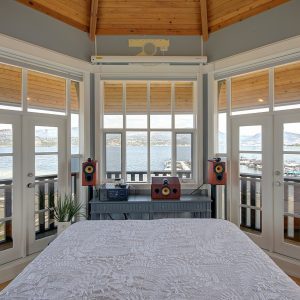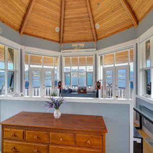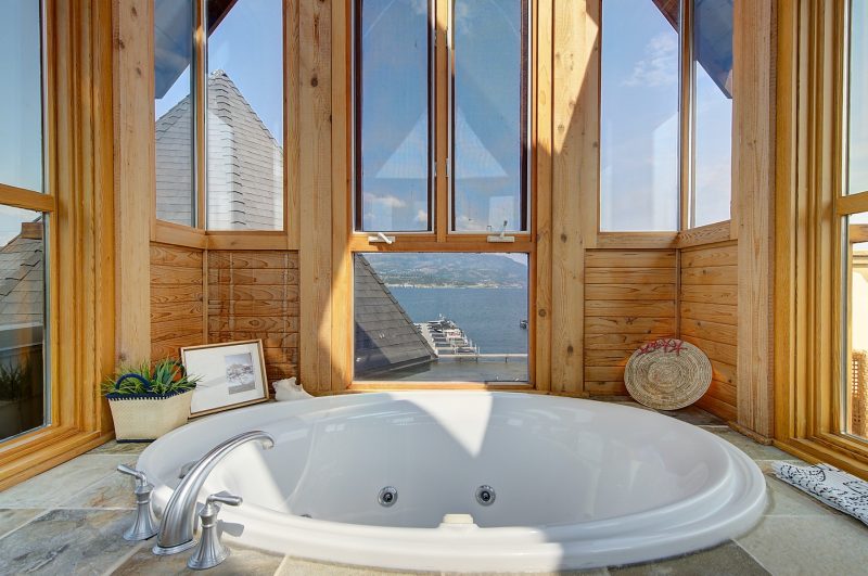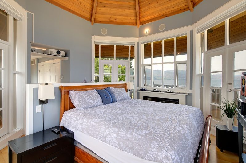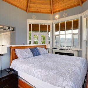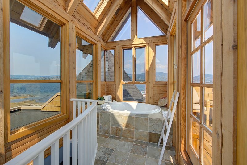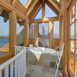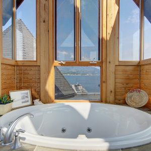 The luxurious primary suite comprises two levels. Surrounded in windows providing wrap around views of the lake and mountains, glass door to the private balcony, high 2-storey cedar ceiling. The upper level of the primary features a Jacuzzi tub that is surrounded in windows with access the 2nd private lake view balcony.