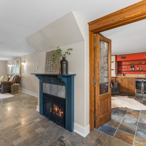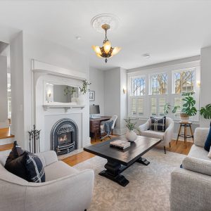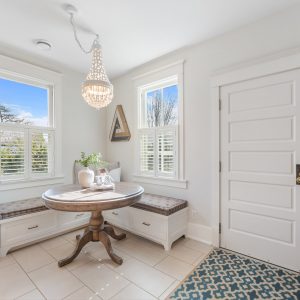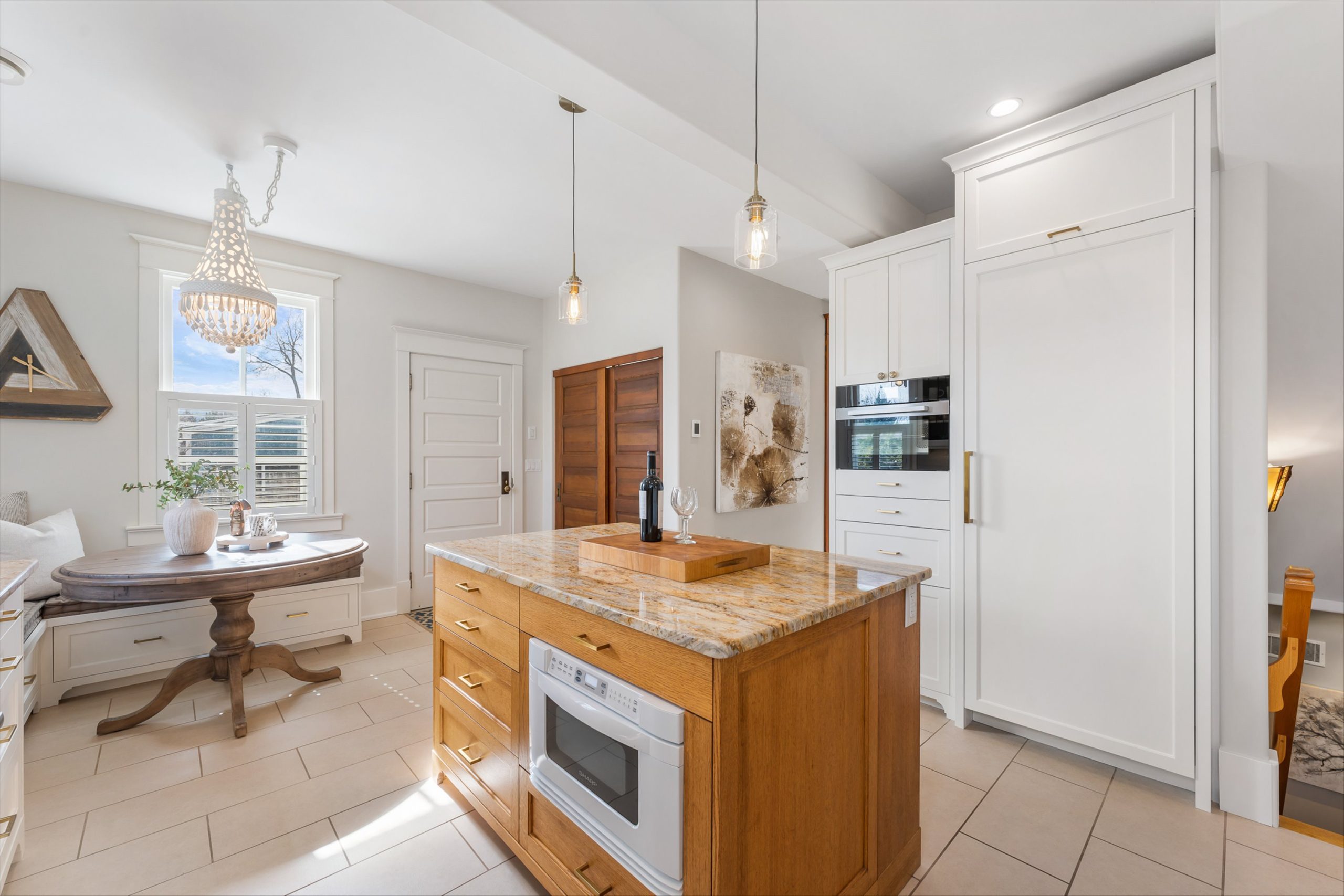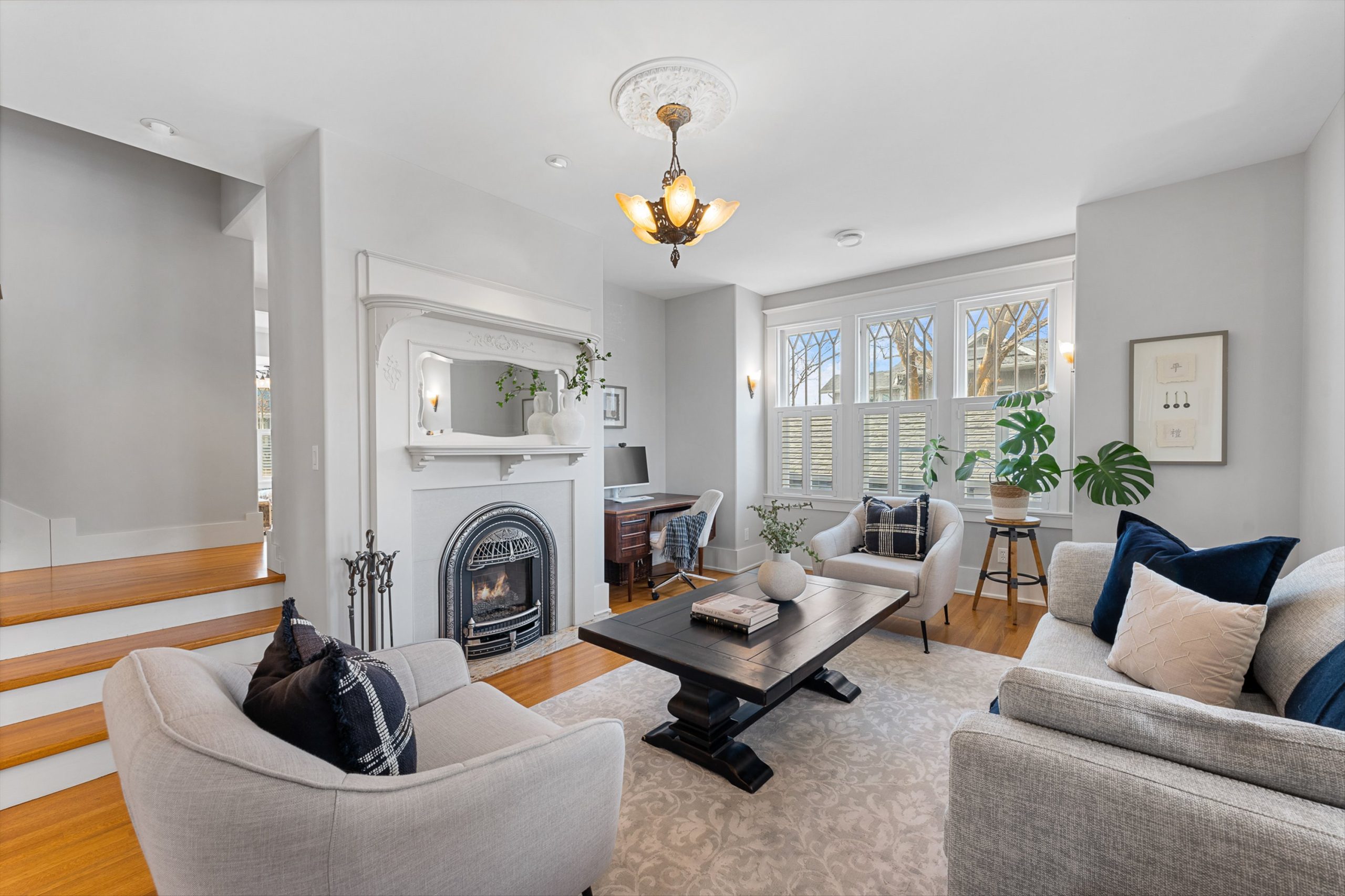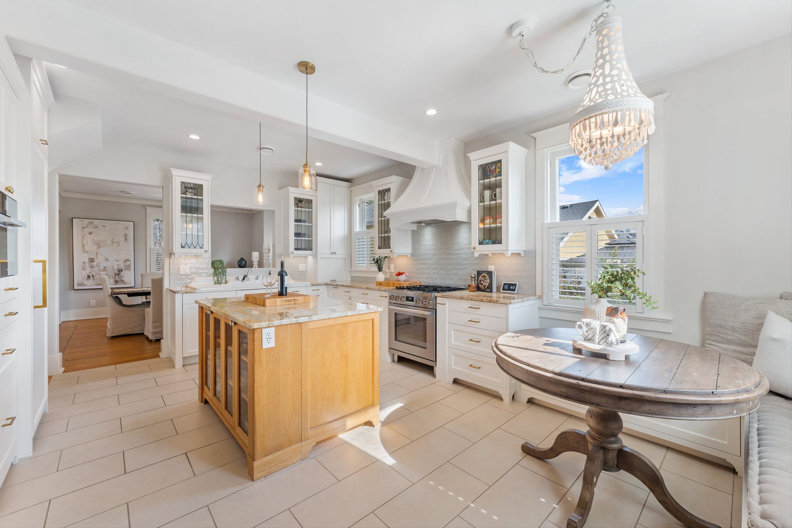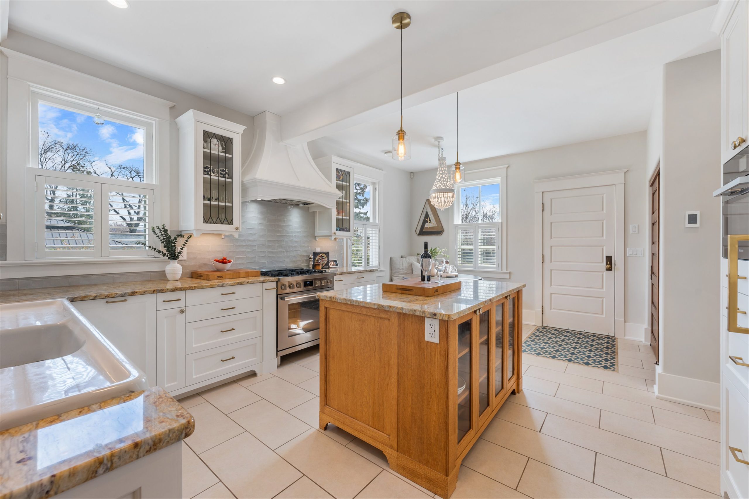 On the main, gracious living and dining spaces feature a gas fireplace, vintage fixtures, and large windows with plantation shutters. The chef-inspired kitchen offers heated tile floors, granite counters, Sonoma tile backsplash, central island, original cast-iron sink, and Miele appliances, along with a butler’s pantry and bright breakfast nook opening to the backyard.