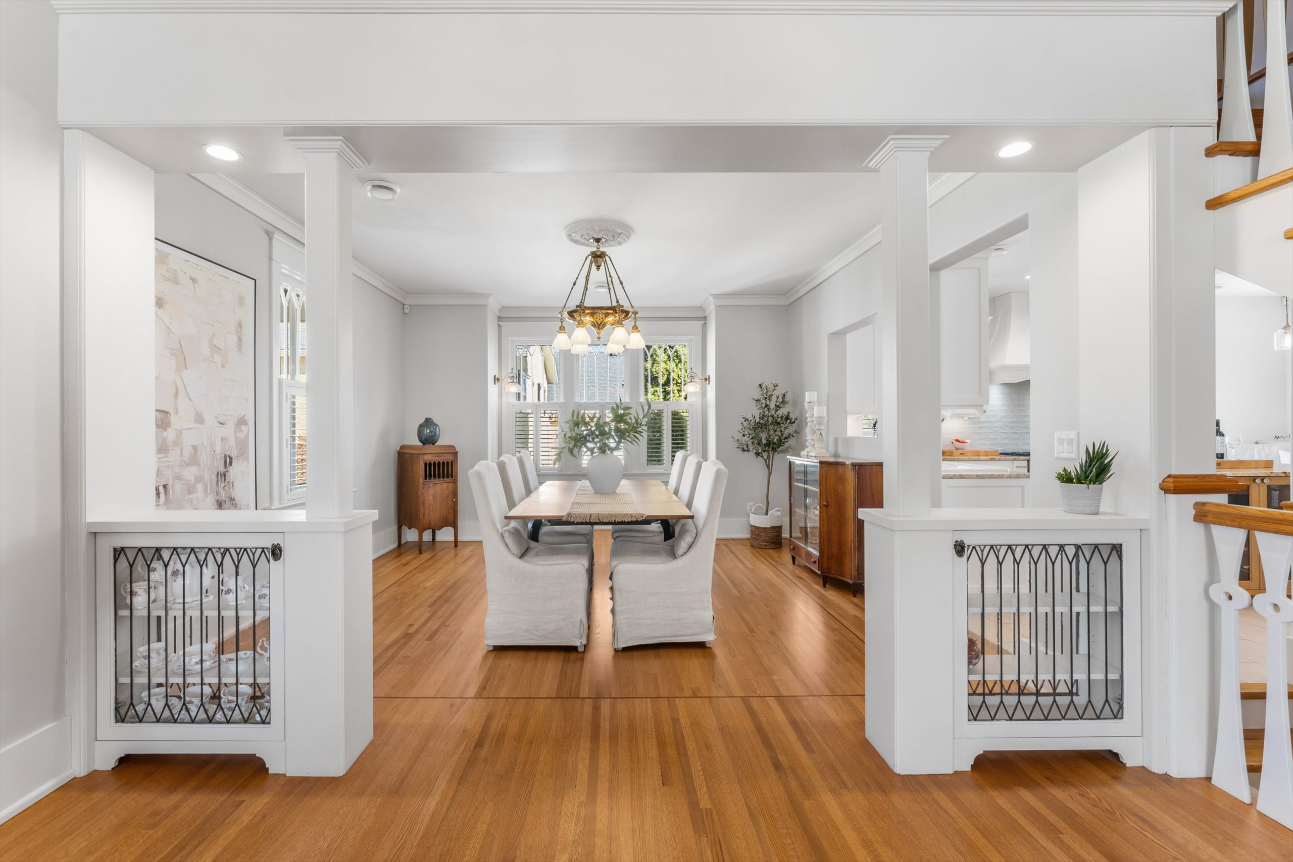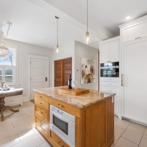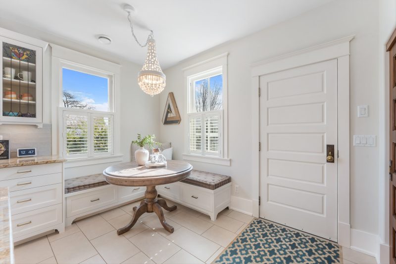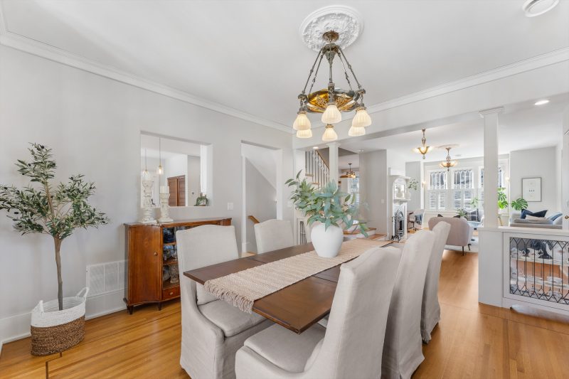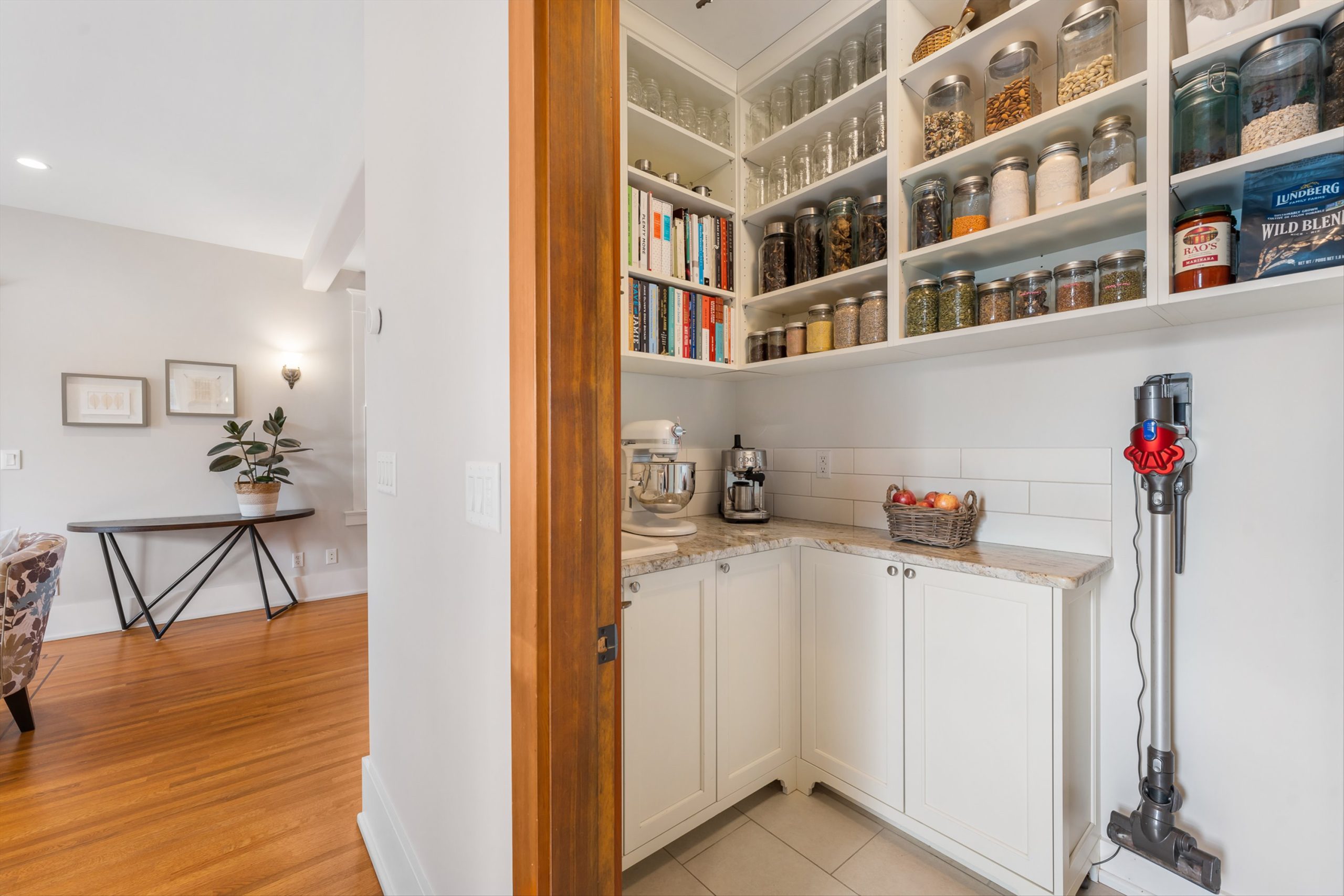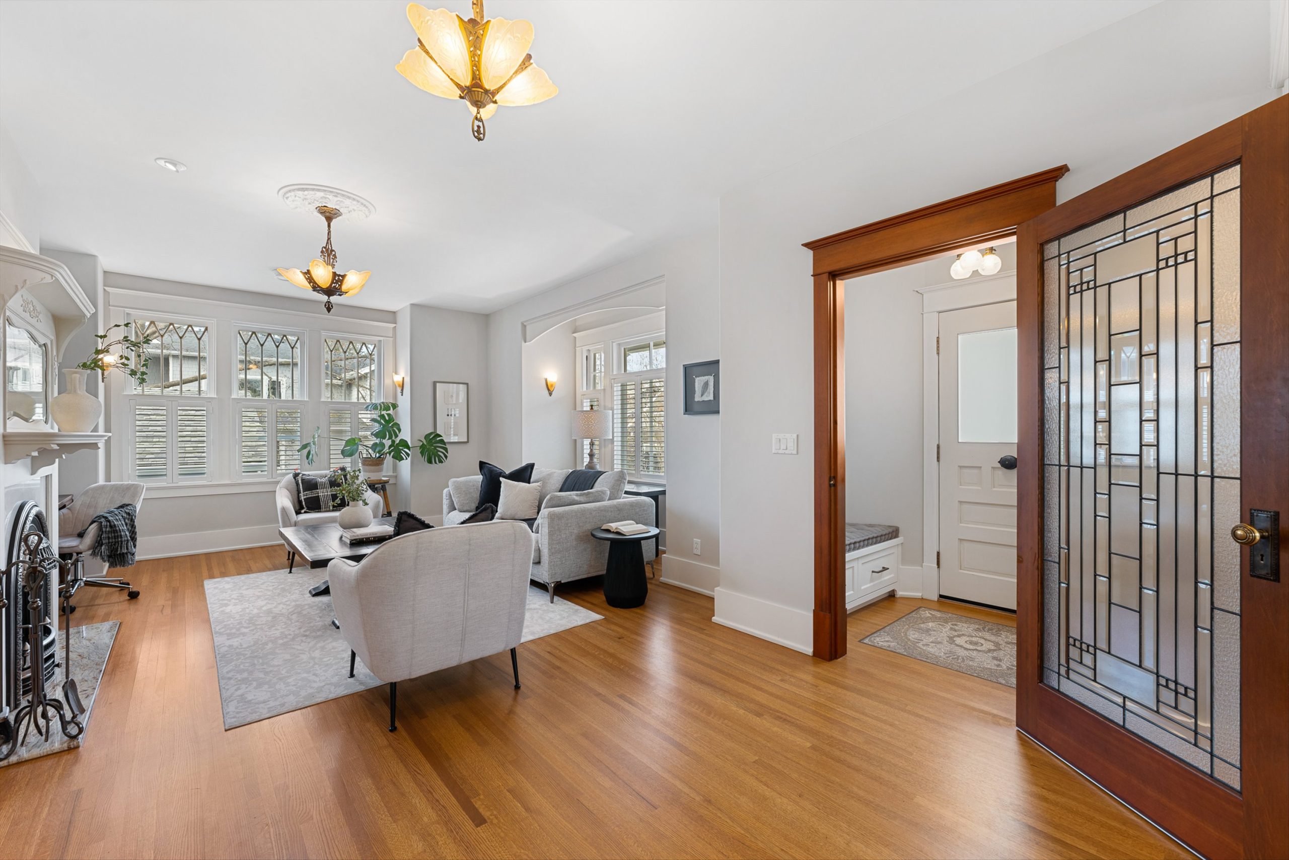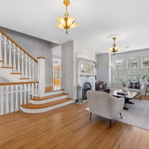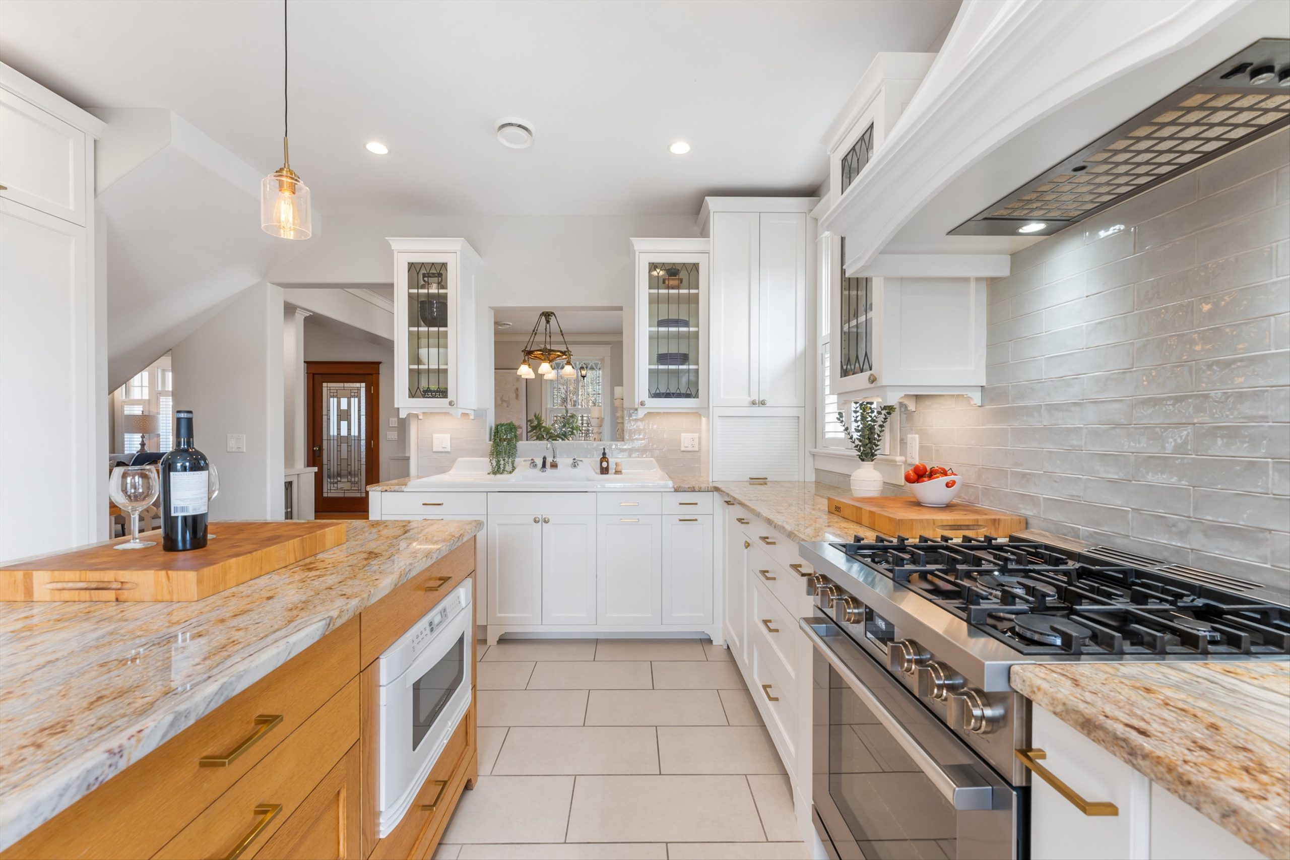 On the main, gracious living and dining spaces feature a gas fireplace, vintage fixtures, and large windows with plantation shutters. The chef-inspired kitchen offers heated tile floors, granite counters, Sonoma tile backsplash, central island, original cast-iron sink, and Miele appliances, along with a butler’s pantry and bright breakfast nook opening to the backyard.