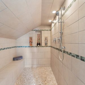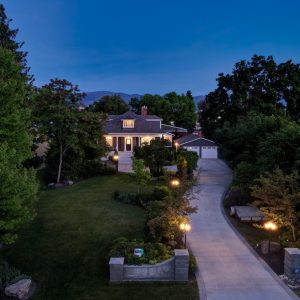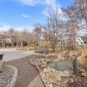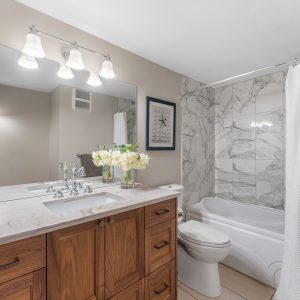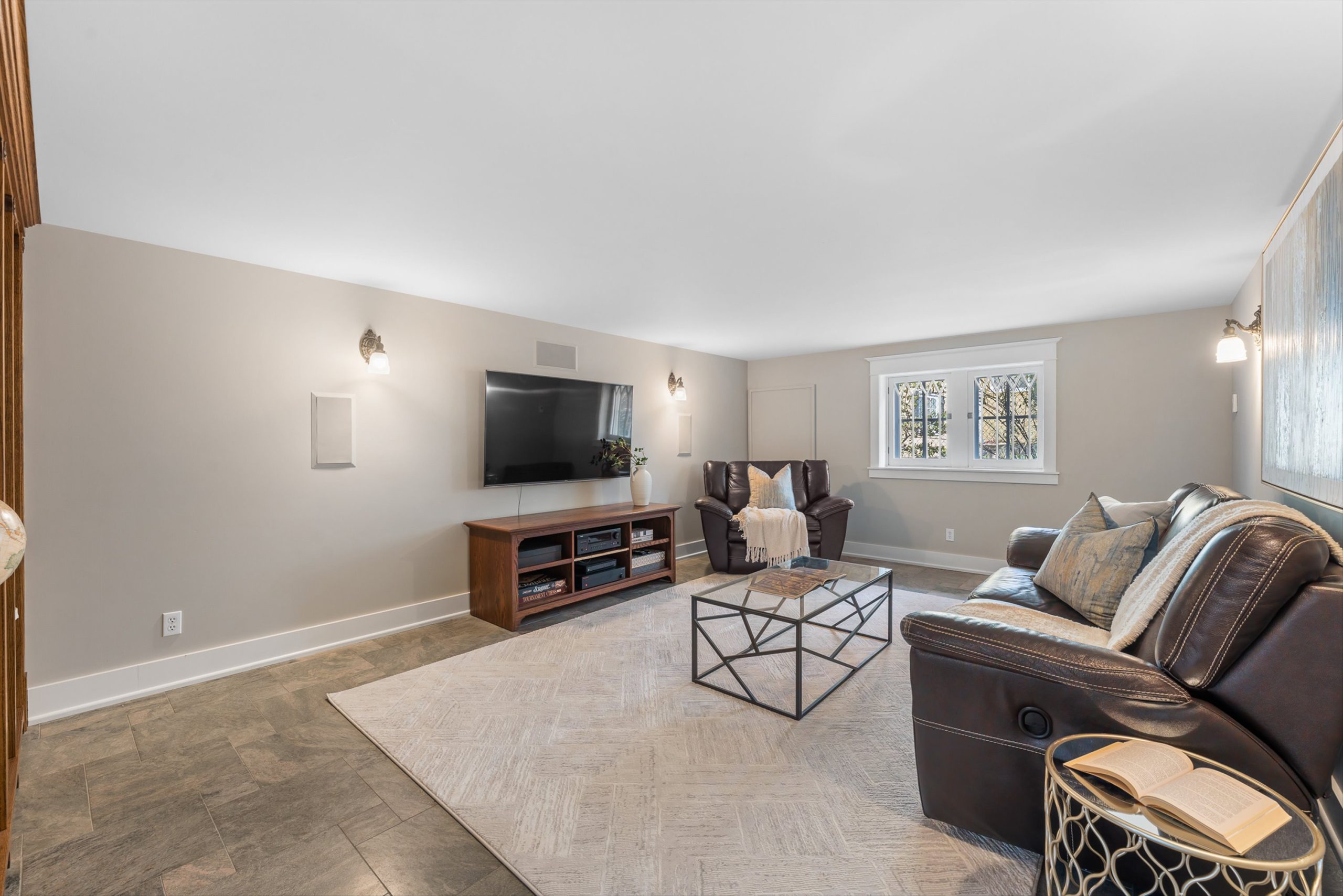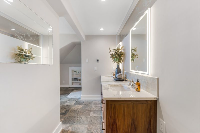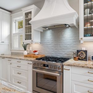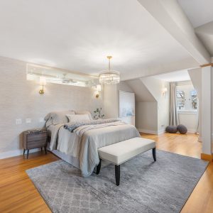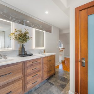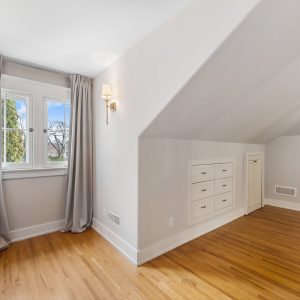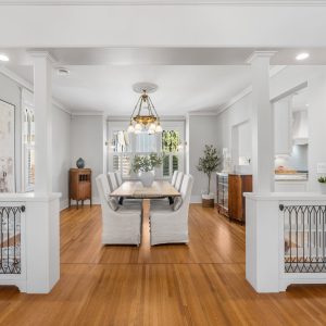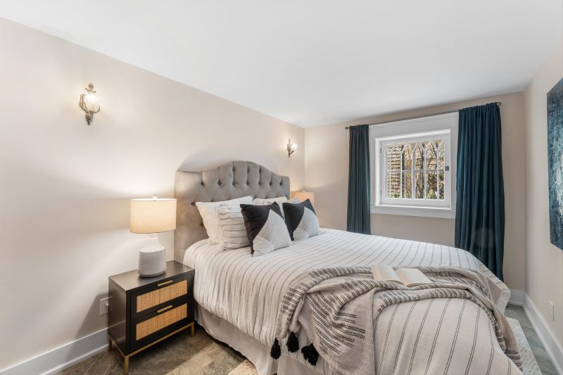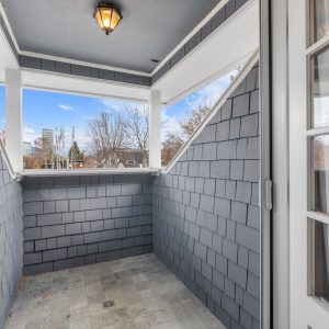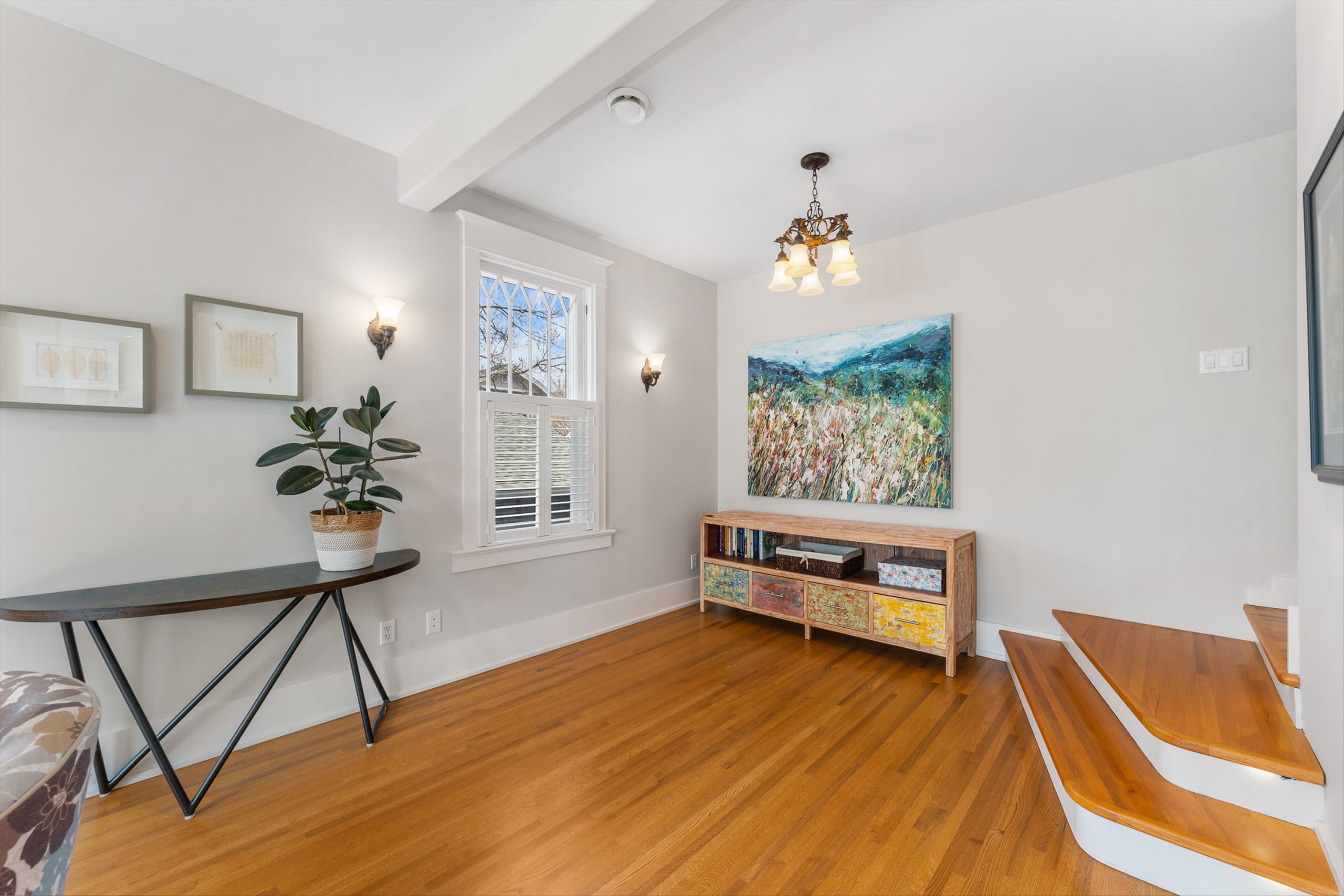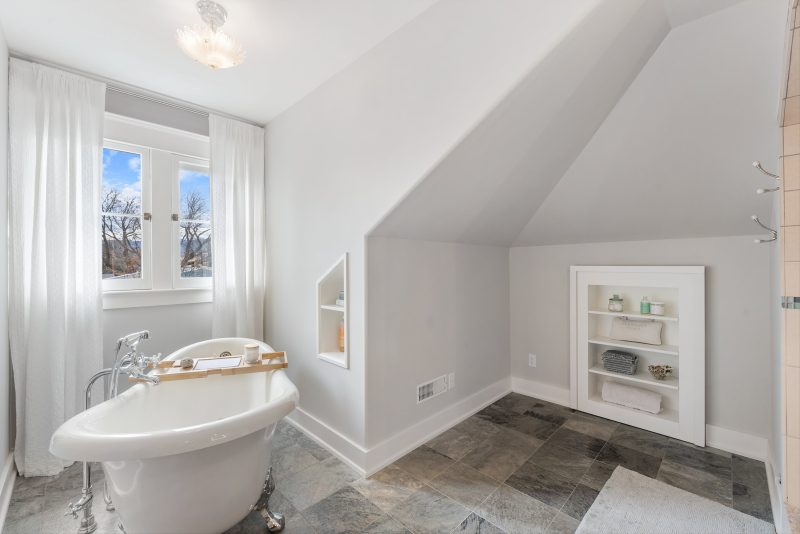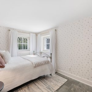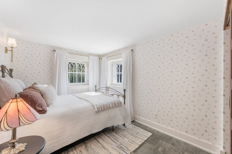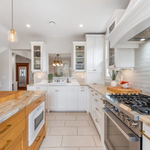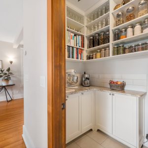 On the main, gracious living and dining spaces feature a gas fireplace, vintage fixtures, and large windows with plantation shutters. The chef-inspired kitchen offers heated tile floors, granite counters, Sonoma tile backsplash, central island, original cast-iron sink, and Miele appliances, along with a butler’s pantry and bright breakfast nook opening to the backyard.