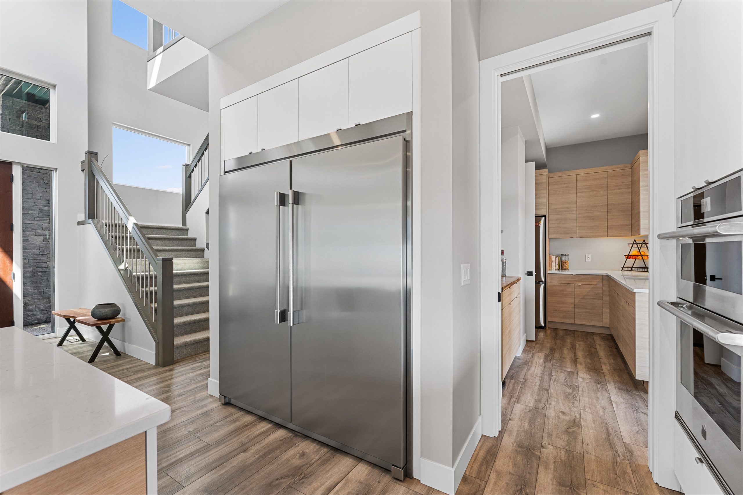 Gorgeous modern home in McKinley Beach where elevated Okanagan living meets thoughtful design & panoramic lake views. Situated on a rare 0.374-acre lot, this estate boasts a spacious family layout with resort-style amenities, expansive indoor-outdoor living, & a self-contained 2 bedroom, 1 bath legal suite. The main level impresses with soaring ceilings, a chef’s kitchen featuring JennAir appliances, a massive island, & a seamless connection to the covered deck—perfect for al fresco dining. The luxurious primary suite enjoys sweeping lake & valley views, a spa-inspired ensuite, & a walk-through dressing room. A bright office, large pantry, powder room, & laundry complete this level.