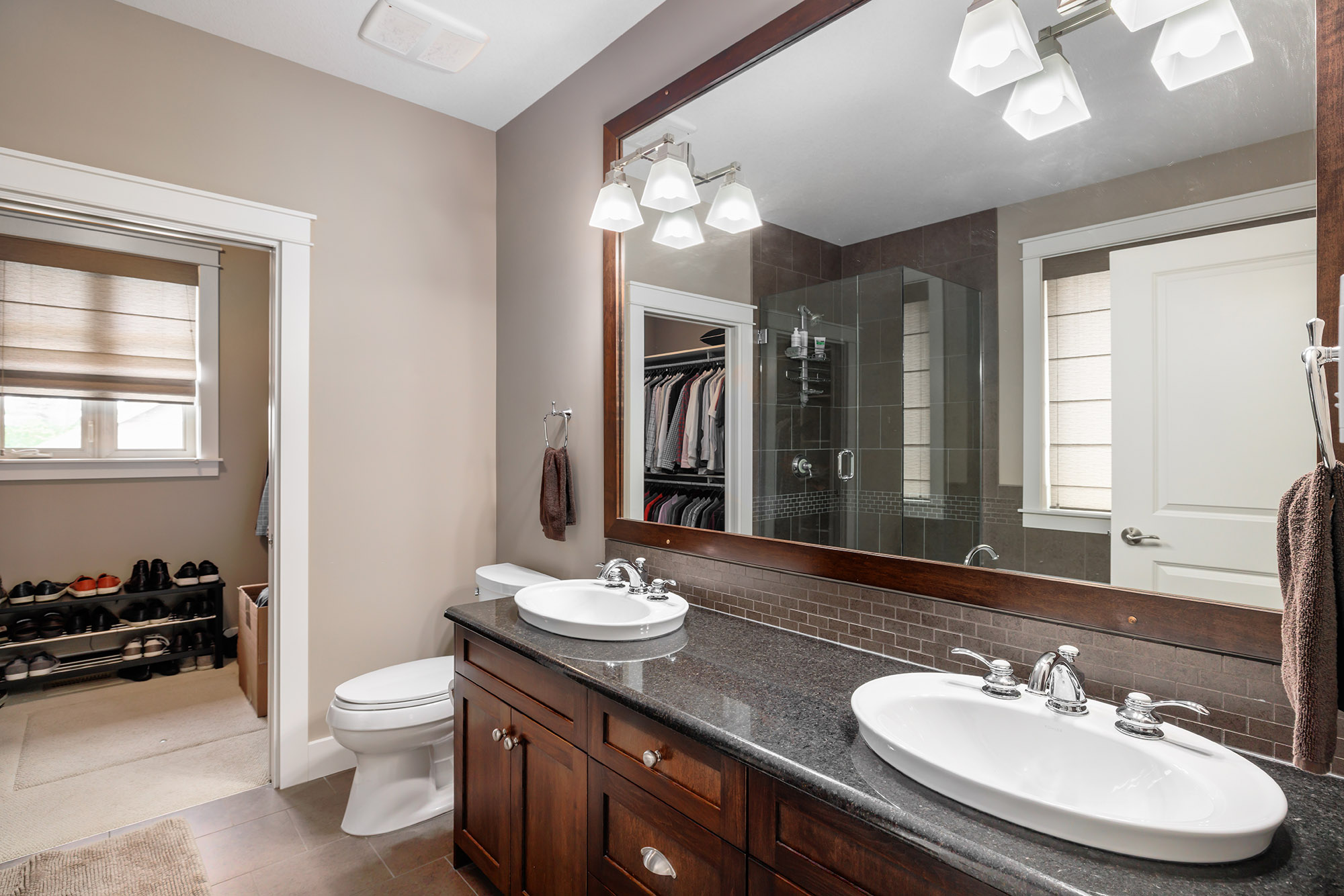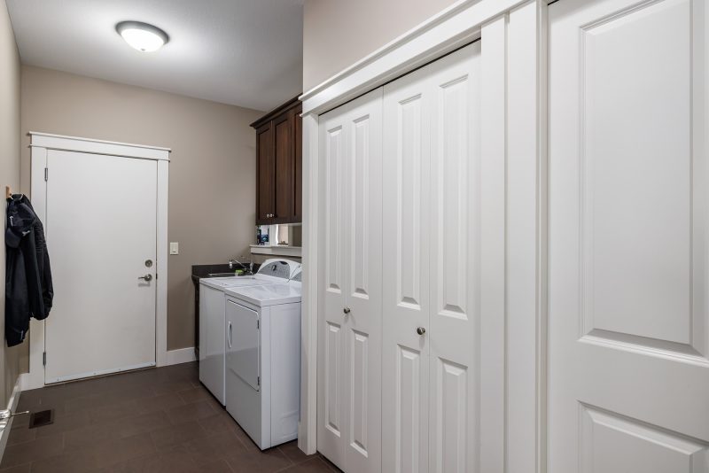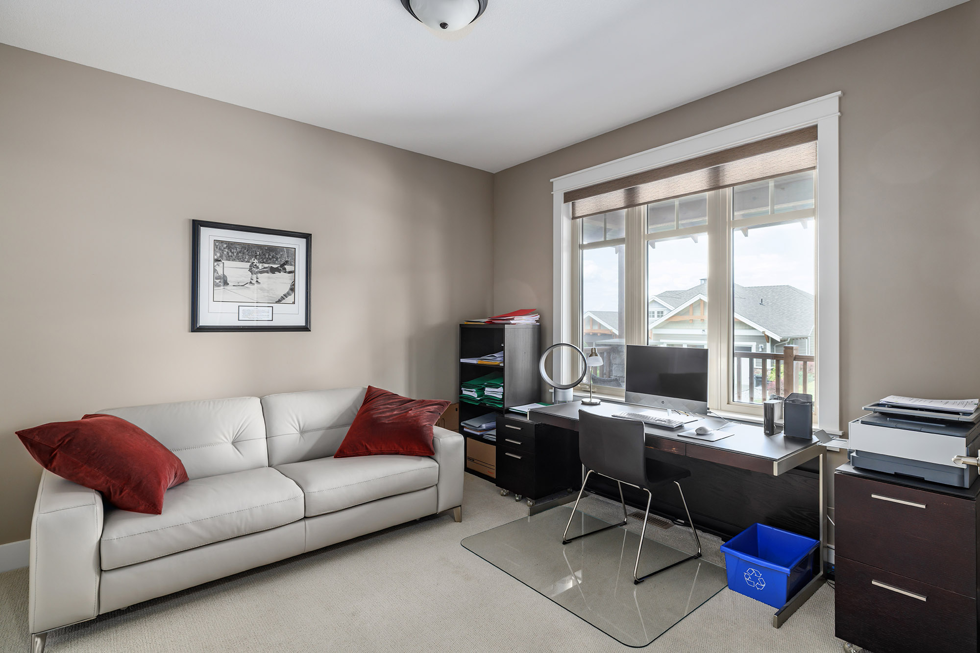 The versatile den with double French doors and views to the backyard, offers the perfect space for a home office or third bedroom. The spacious primary retreat includes a walk-in closet with built-ins and a 5-piece ensuite with heated tile, a soaker tub, and a glass door walk-in shower.