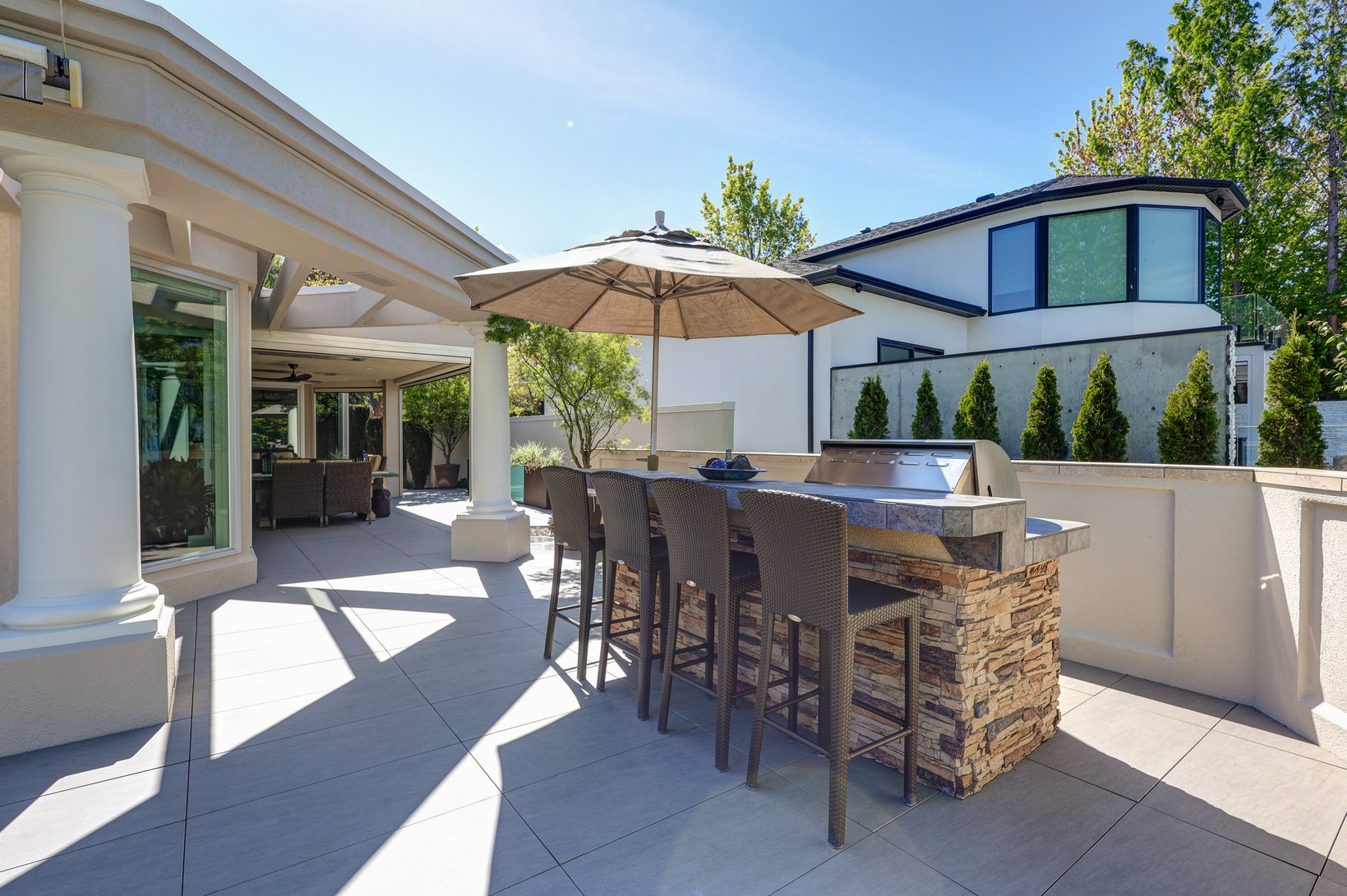 A detached guest casita with its own bed and bath provides the ideal retreat for visitors. Outside, the expansive patio with built-in BBQ, ceiling fan, and heaters sets the stage for lakeside gatherings.