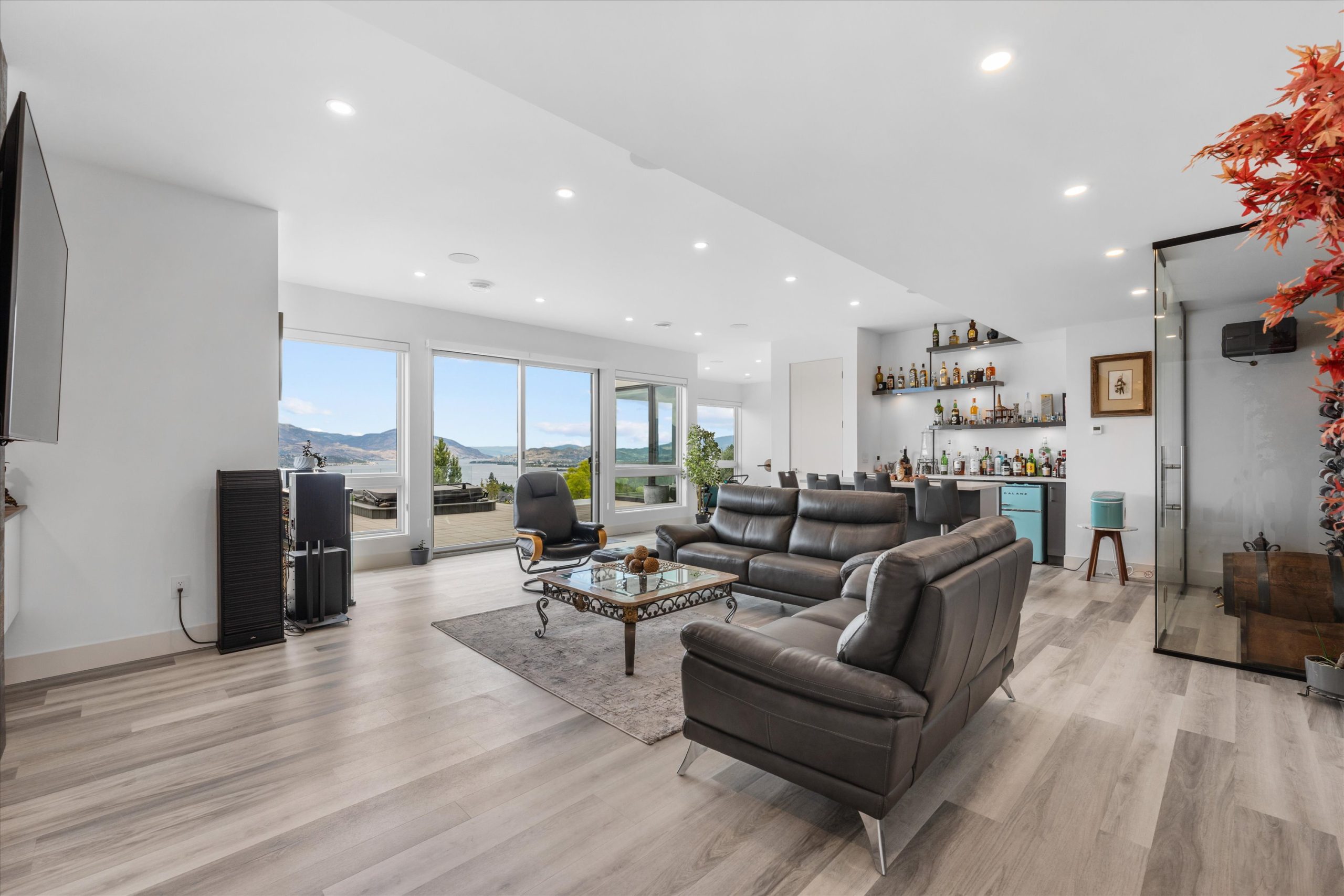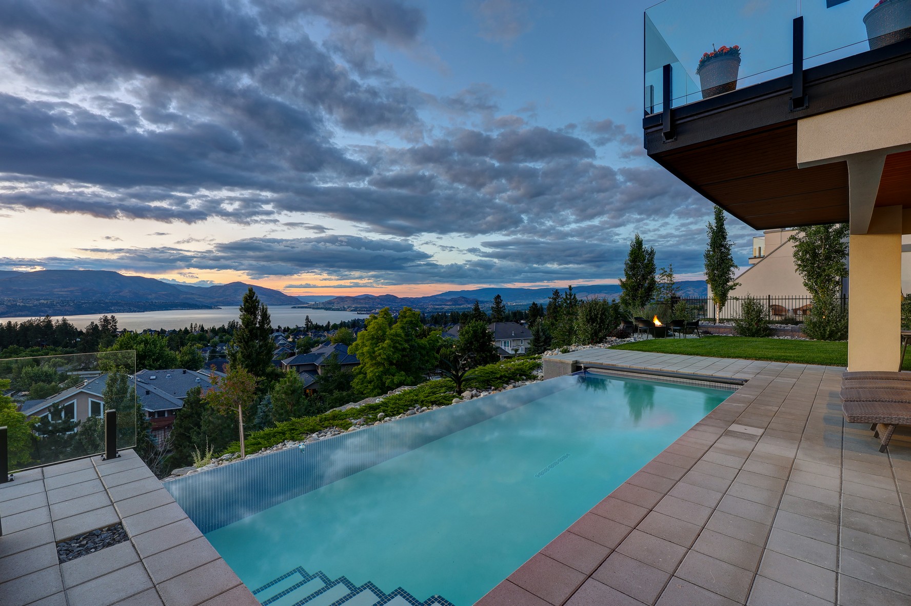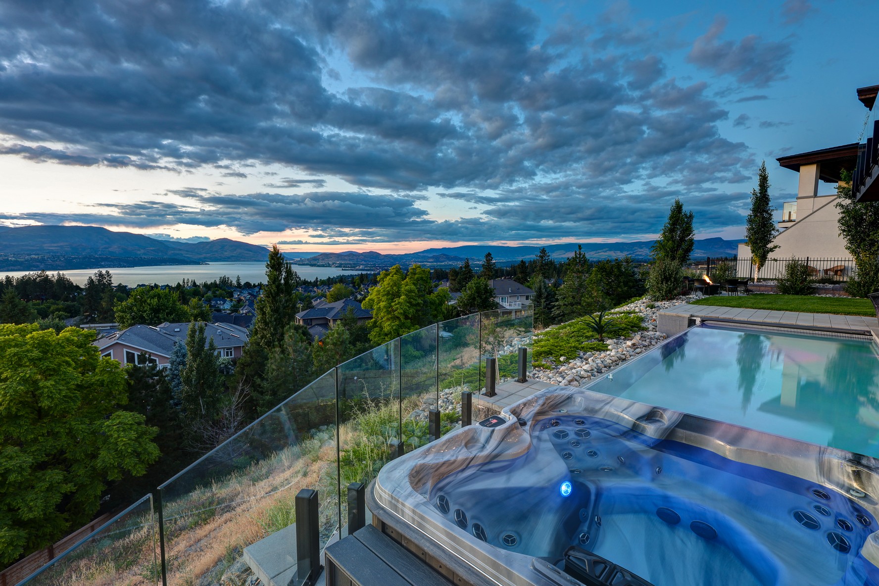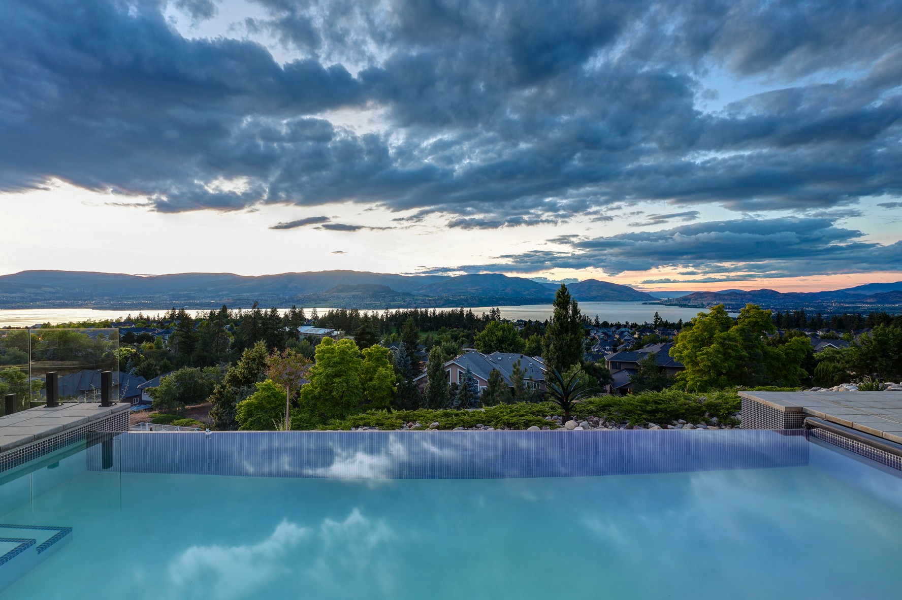 Outdoors, the backyard is a private oasis designed for both relaxation and entertaining—featuring a saltwater infinity pool with power cover, sunken hot tub, fire table, and lush landscaping. The covered patio with wood inlay ceilings, built-in speakers, and a full outdoor kitchen offers the perfect setting for alfresco dining. A fully self-contained suite with private entrance, heated floors, and sweeping views adds flexibility for multigenerational living, guests, or rental income. This is elevated Okanagan living thoughtfully designed, beautifully finished, and truly unforgettable.