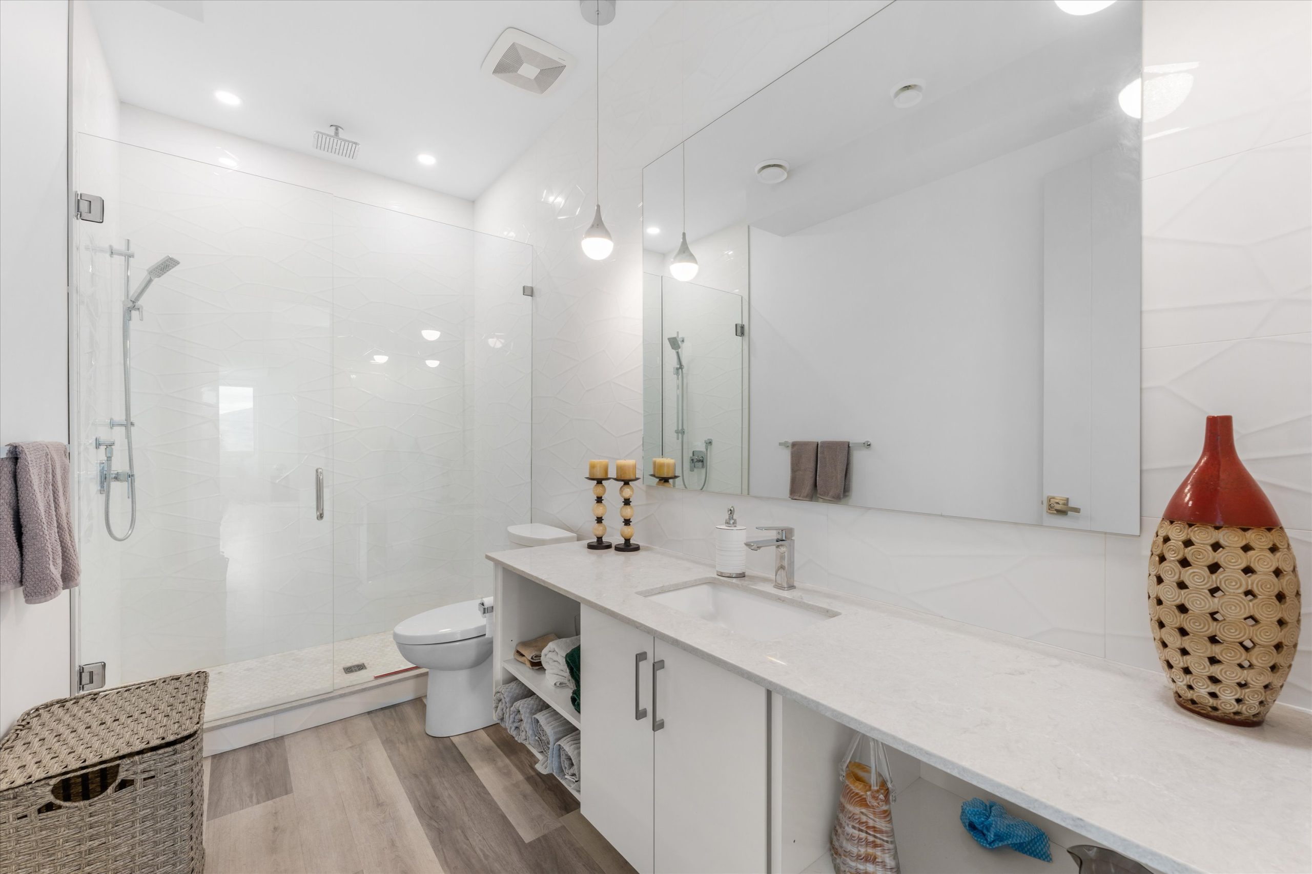 The chef’s kitchen features quartz counters, a Dekton waterfall island, Fulgor gas cooktop, JennAir ovens, and a full butler’s pantry with second kitchen. Expansive living and dining areas are framed by floor-to-ceiling windows, while the primary retreat boasts a spa-inspired ensuite, boutique-style walk-in closet, and rooftop deck access.