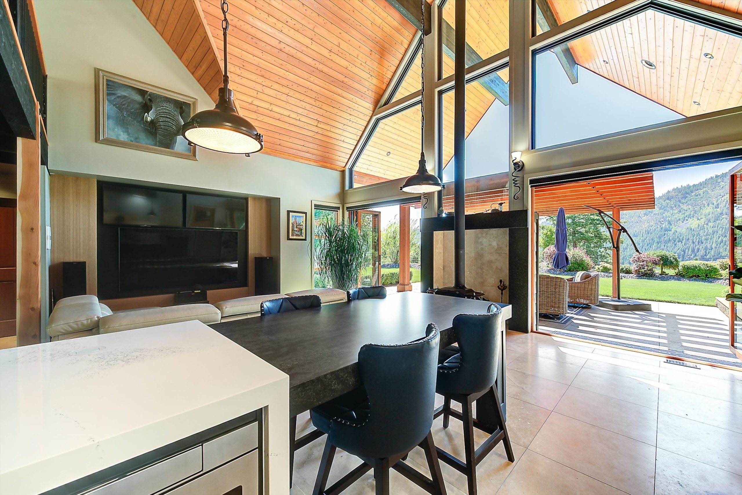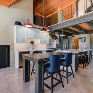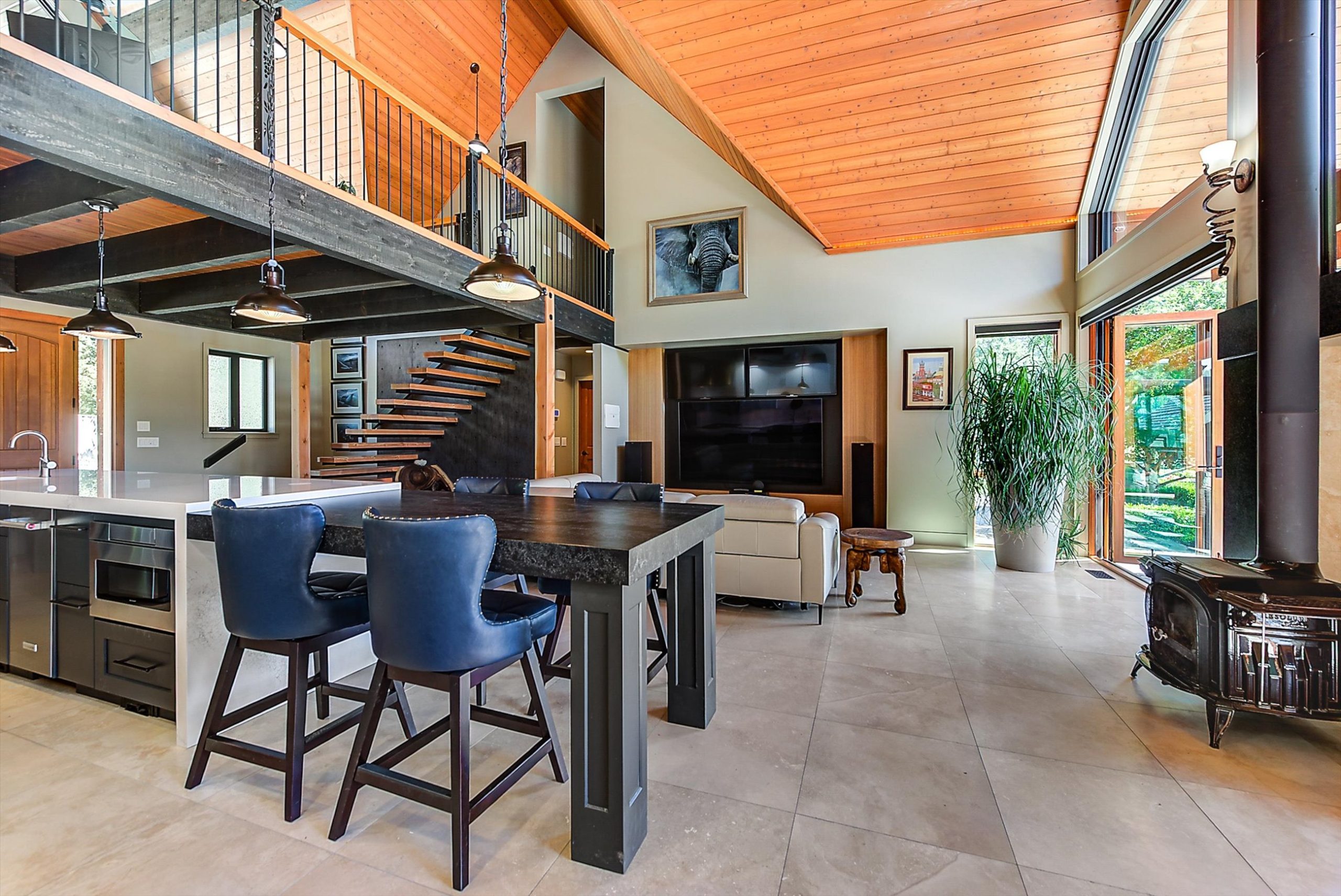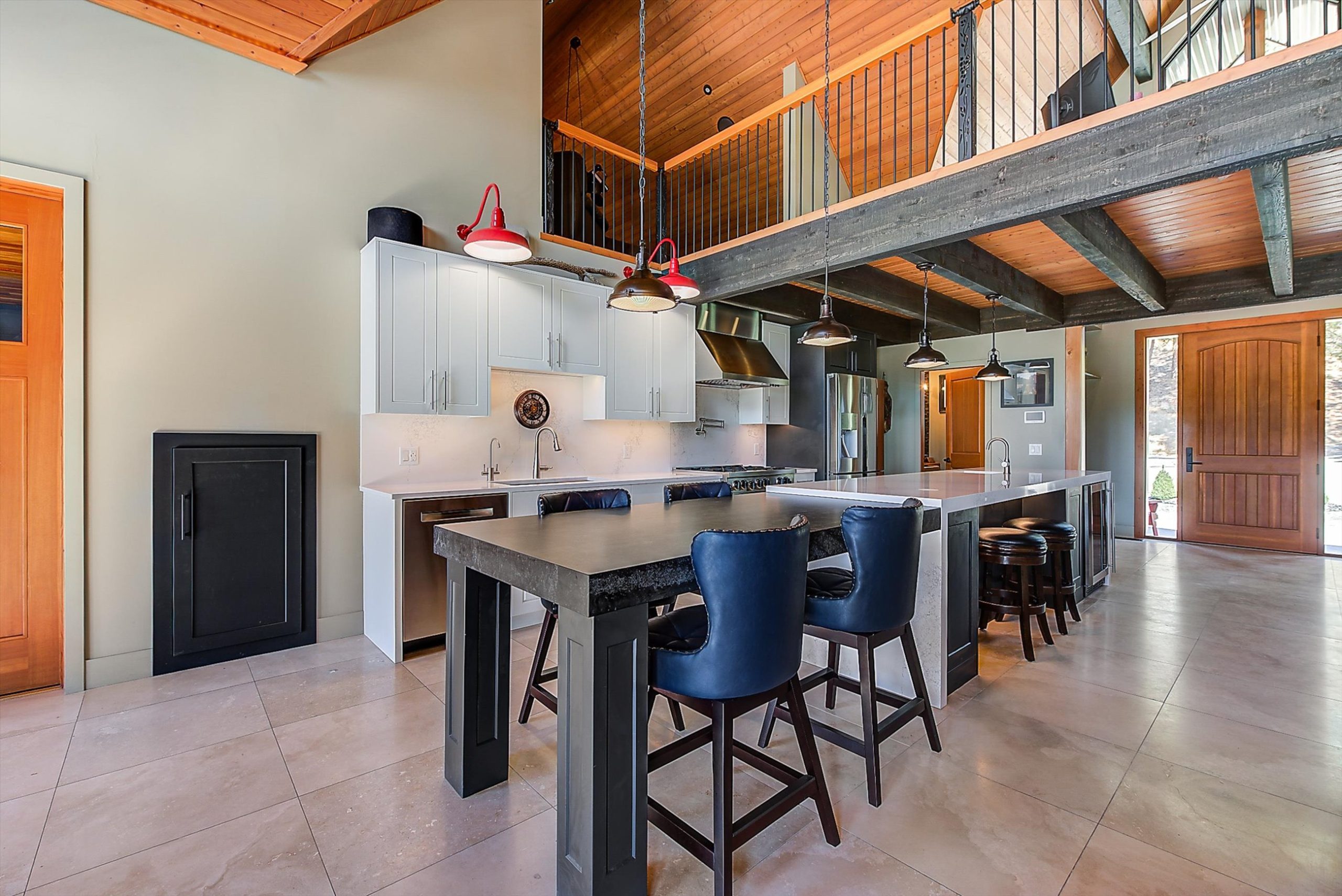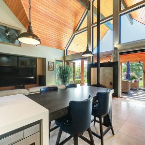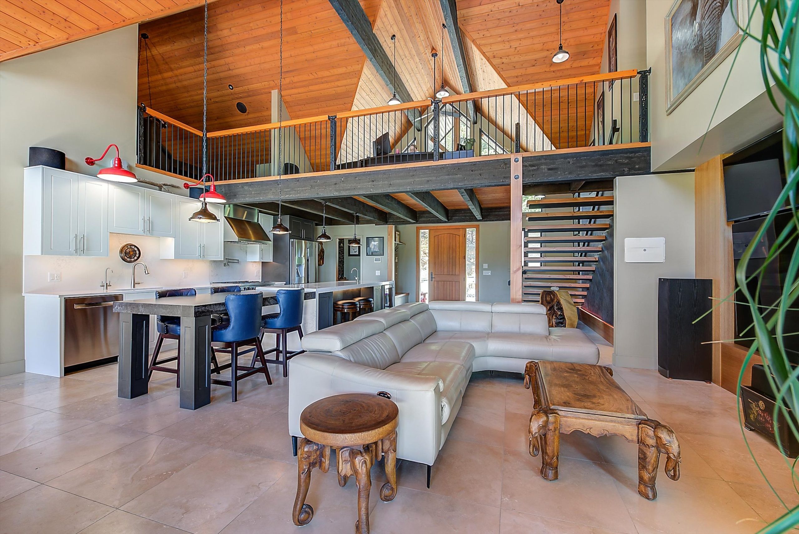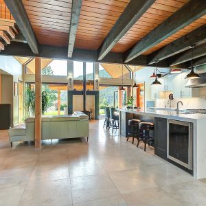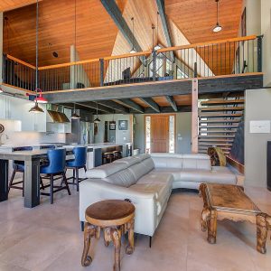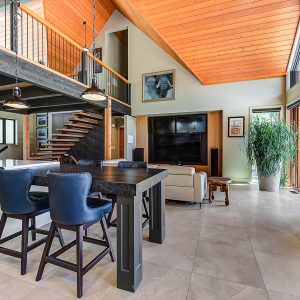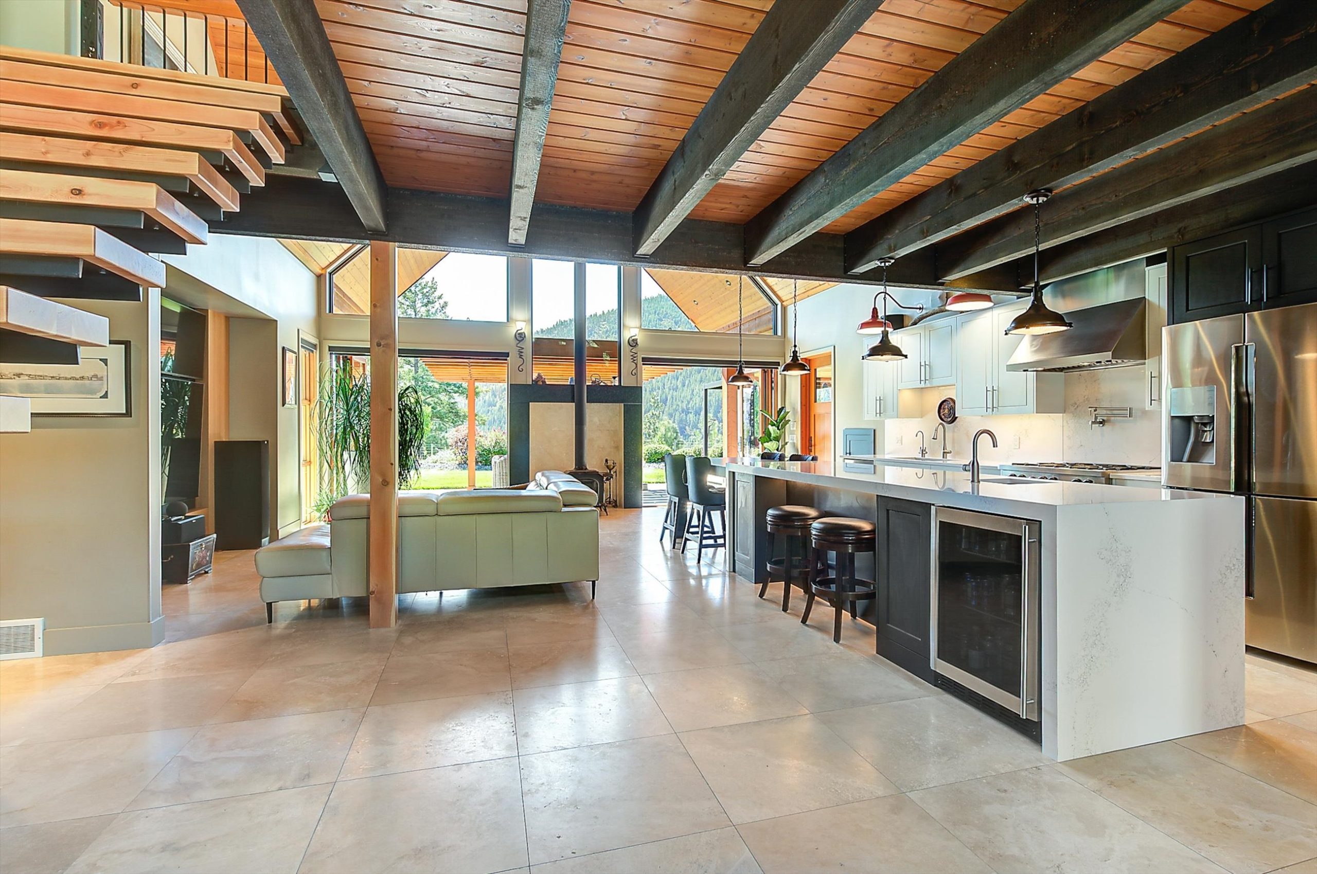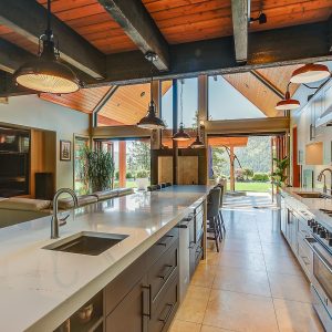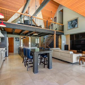 Inside, vaulted ceilings, rich wood detailing, and exposed beams create a warm yet elevated atmosphere. The open-concept main living area is anchored by a chef’s kitchen with quartz surfaces, premium appliances, and an oversized island, seamlessly connecting to the dining and living areas and extending to a covered outdoor space with serene views.