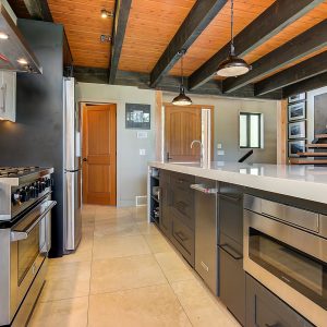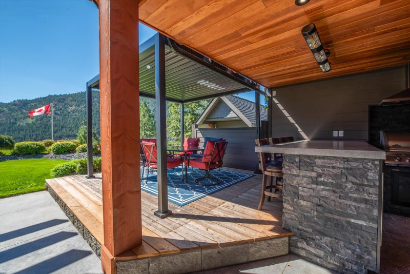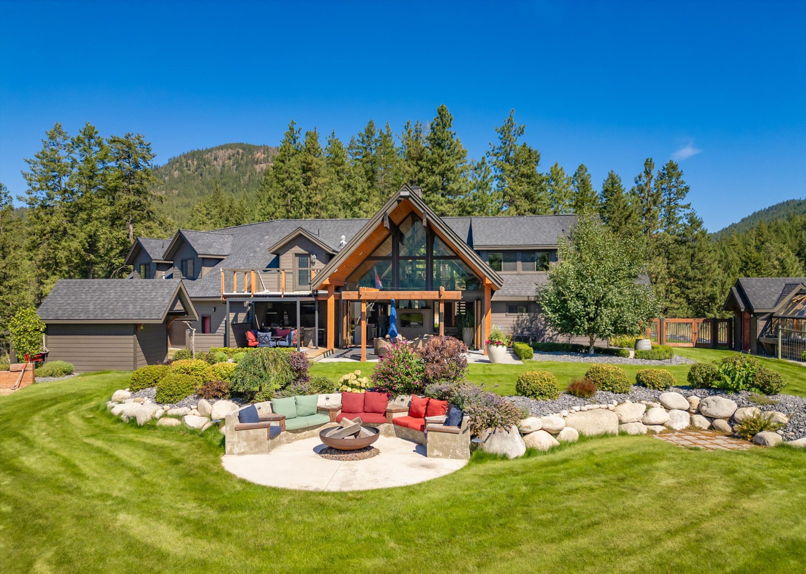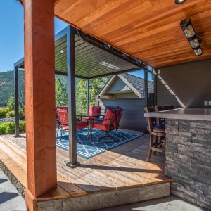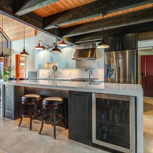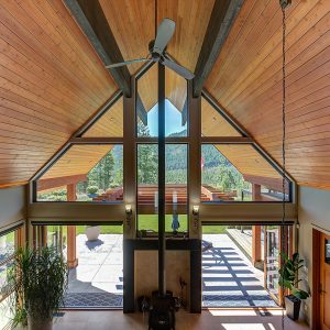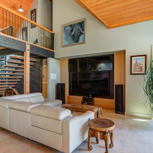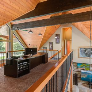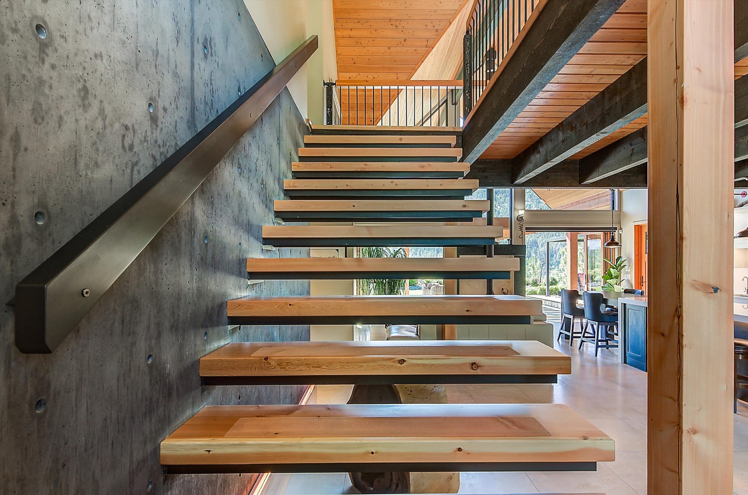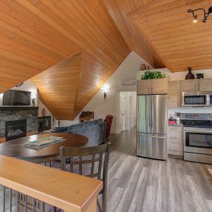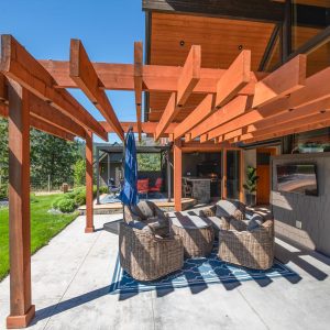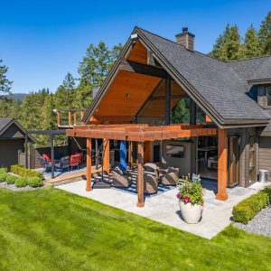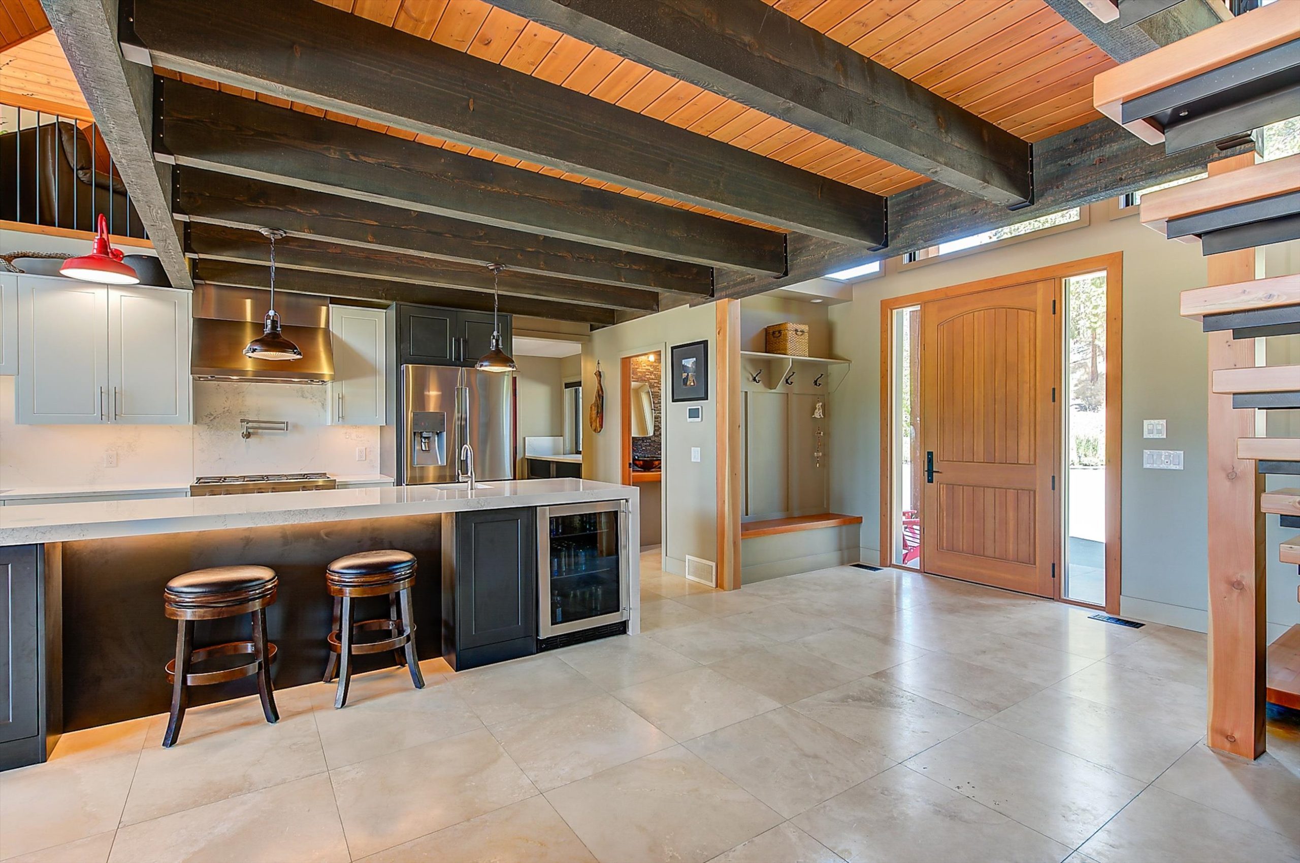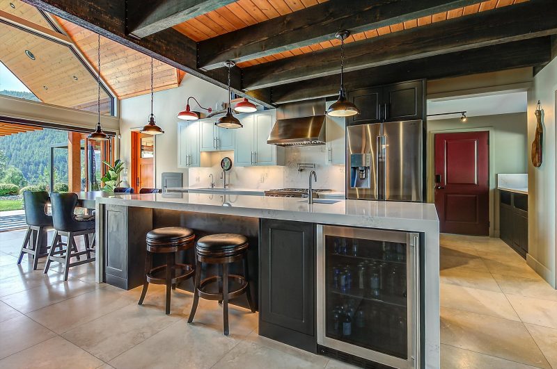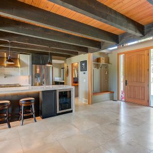 Inside, vaulted ceilings, rich wood detailing, and exposed beams create a warm yet elevated atmosphere. The open-concept main living area is anchored by a chef’s kitchen with quartz surfaces, premium appliances, and an oversized island, seamlessly connecting to the dining and living areas and extending to a covered outdoor space with serene views.