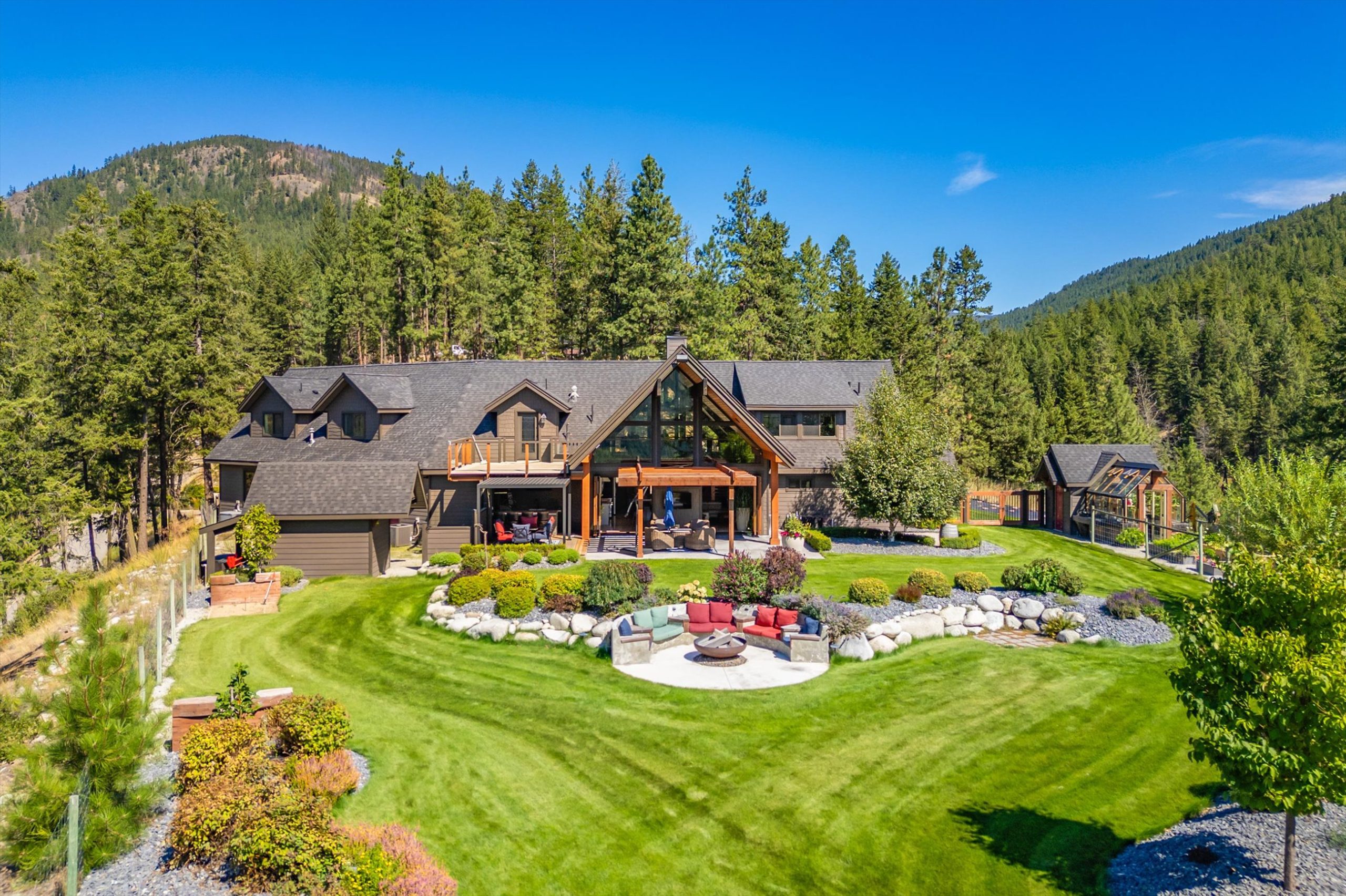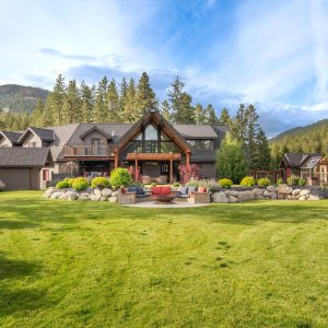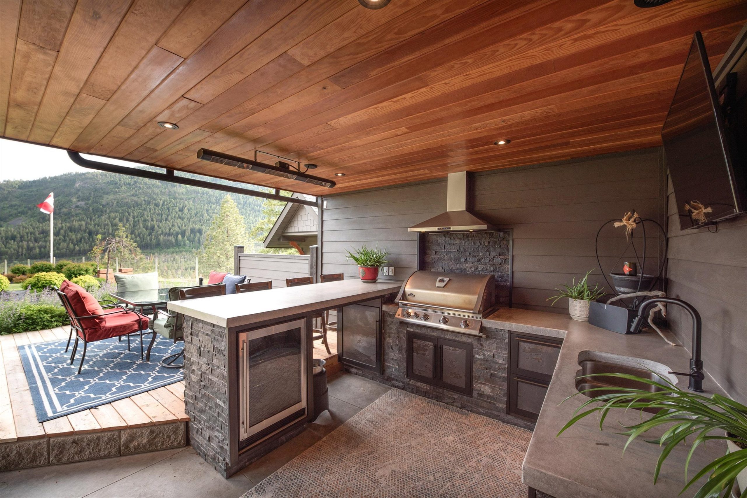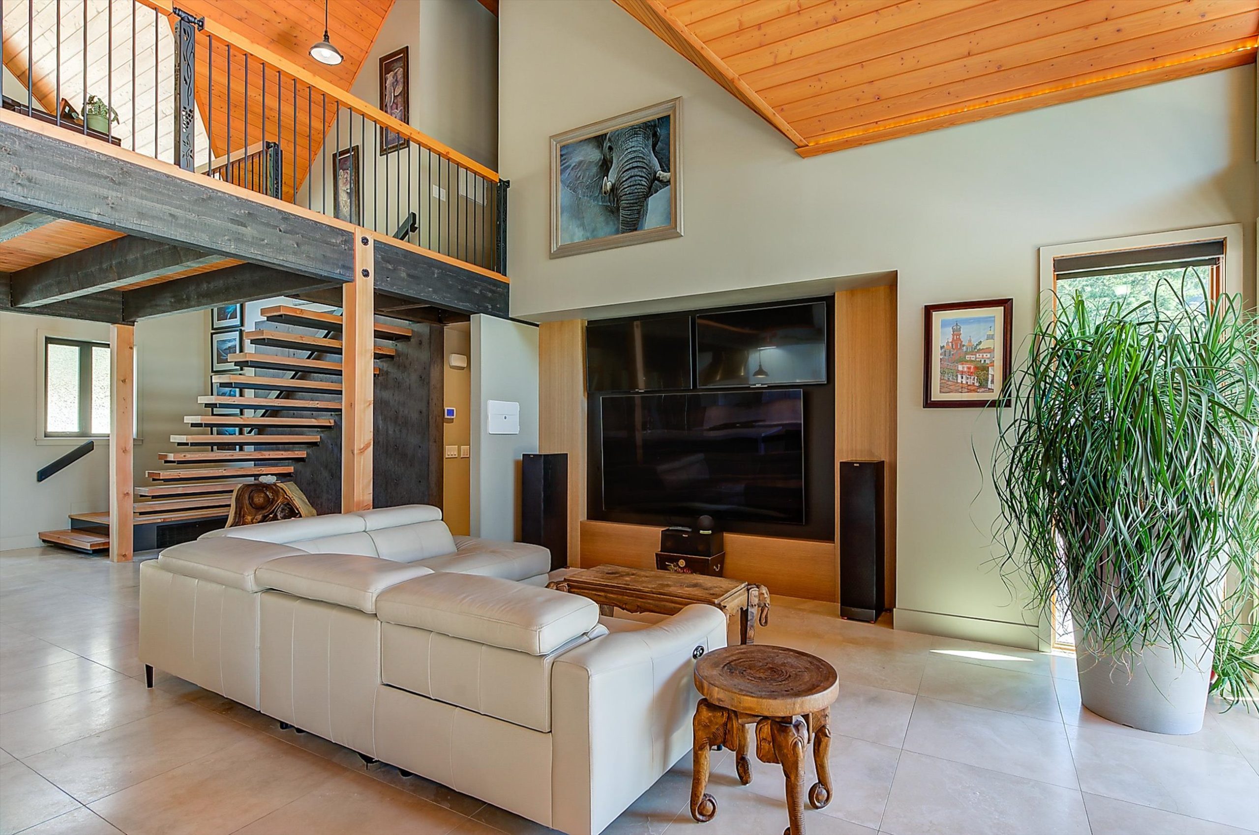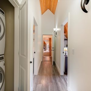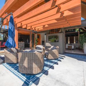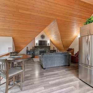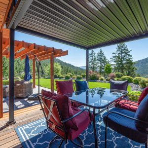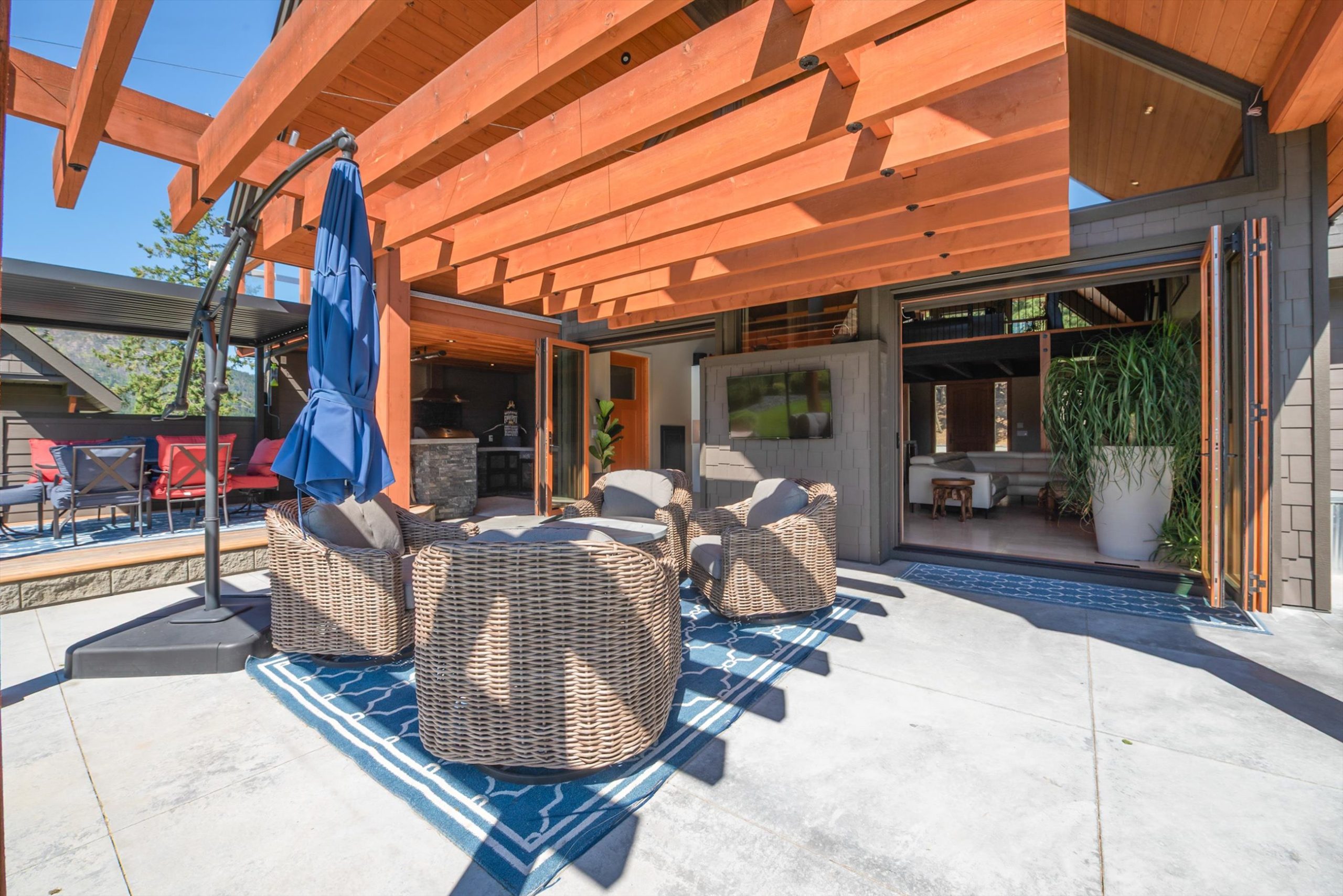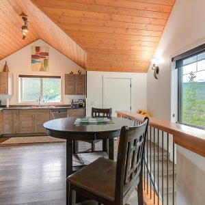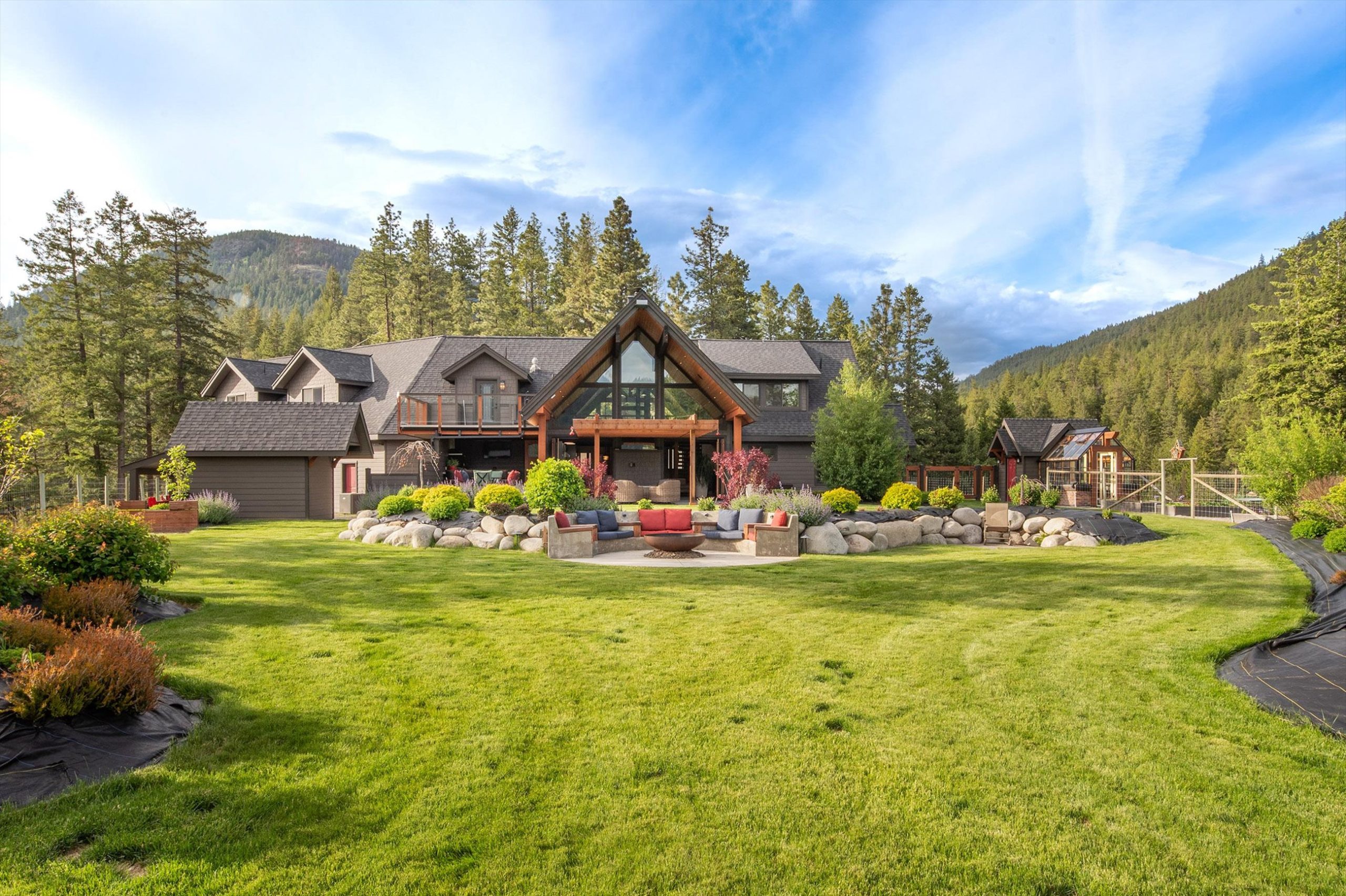 Inside, vaulted ceilings, rich wood detailing, and exposed beams create a warm yet elevated atmosphere. The open-concept main living area is anchored by a chef’s kitchen with quartz surfaces, premium appliances, and an oversized island, seamlessly connecting to the dining and living areas and extending to a covered outdoor space with serene views.