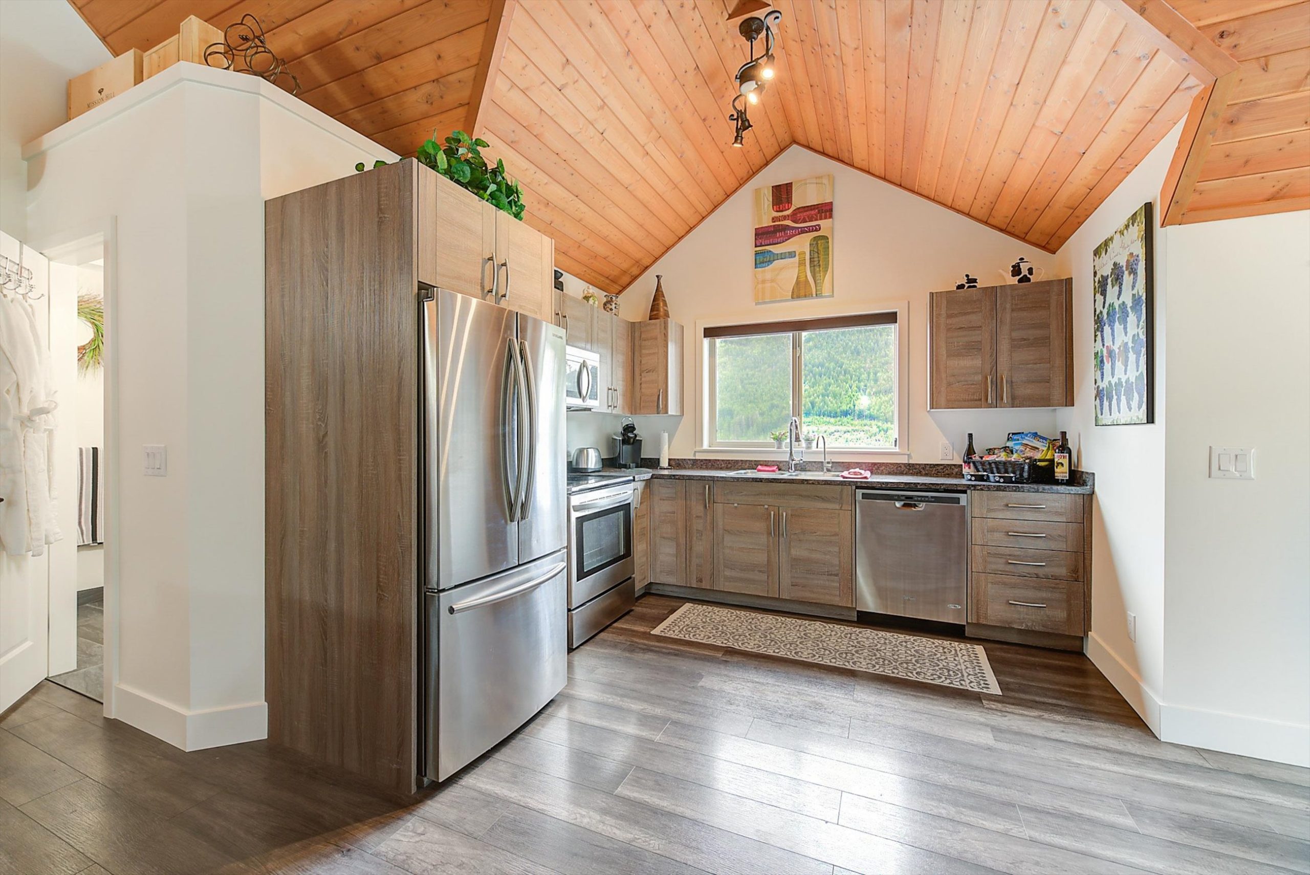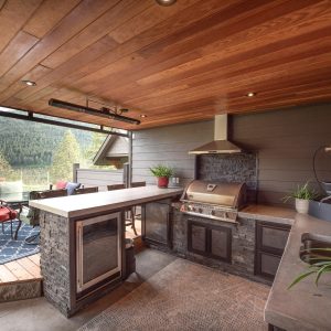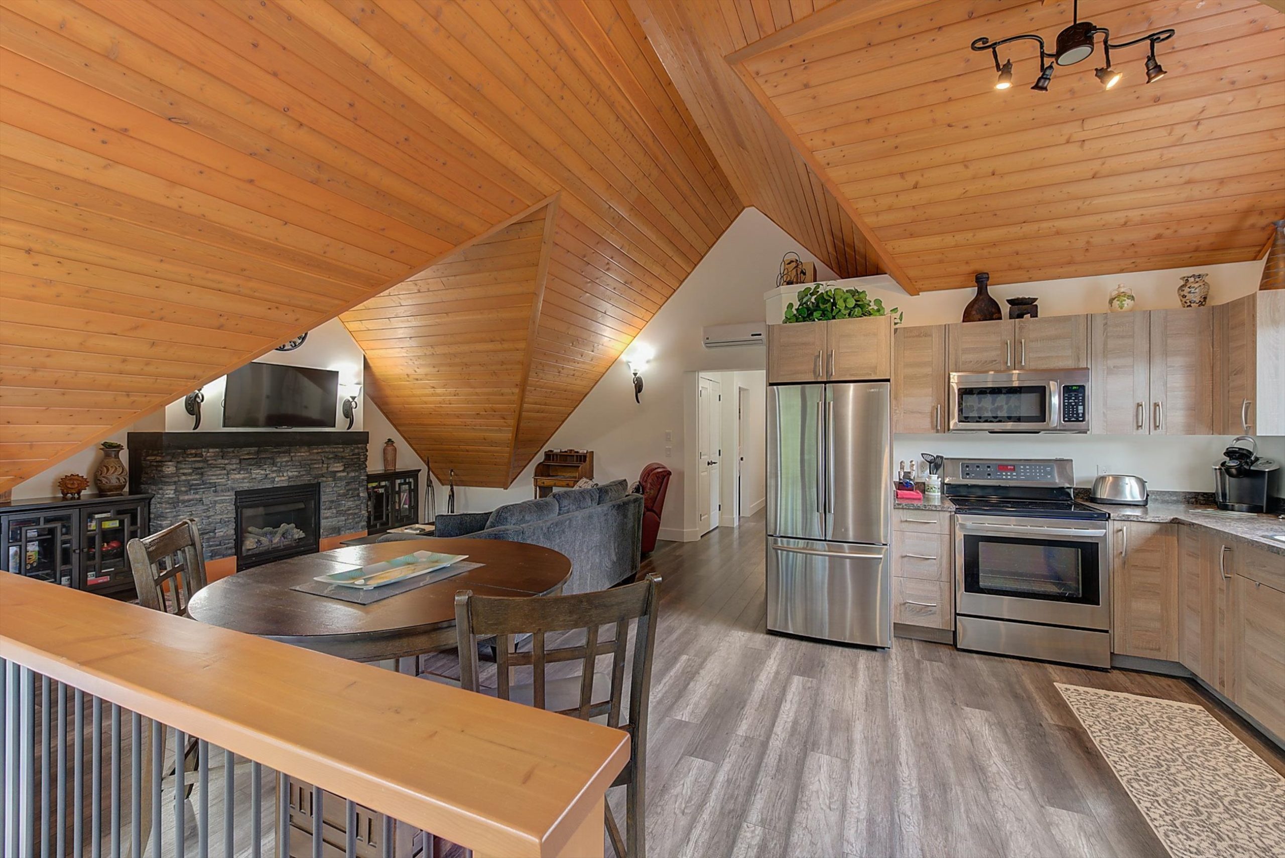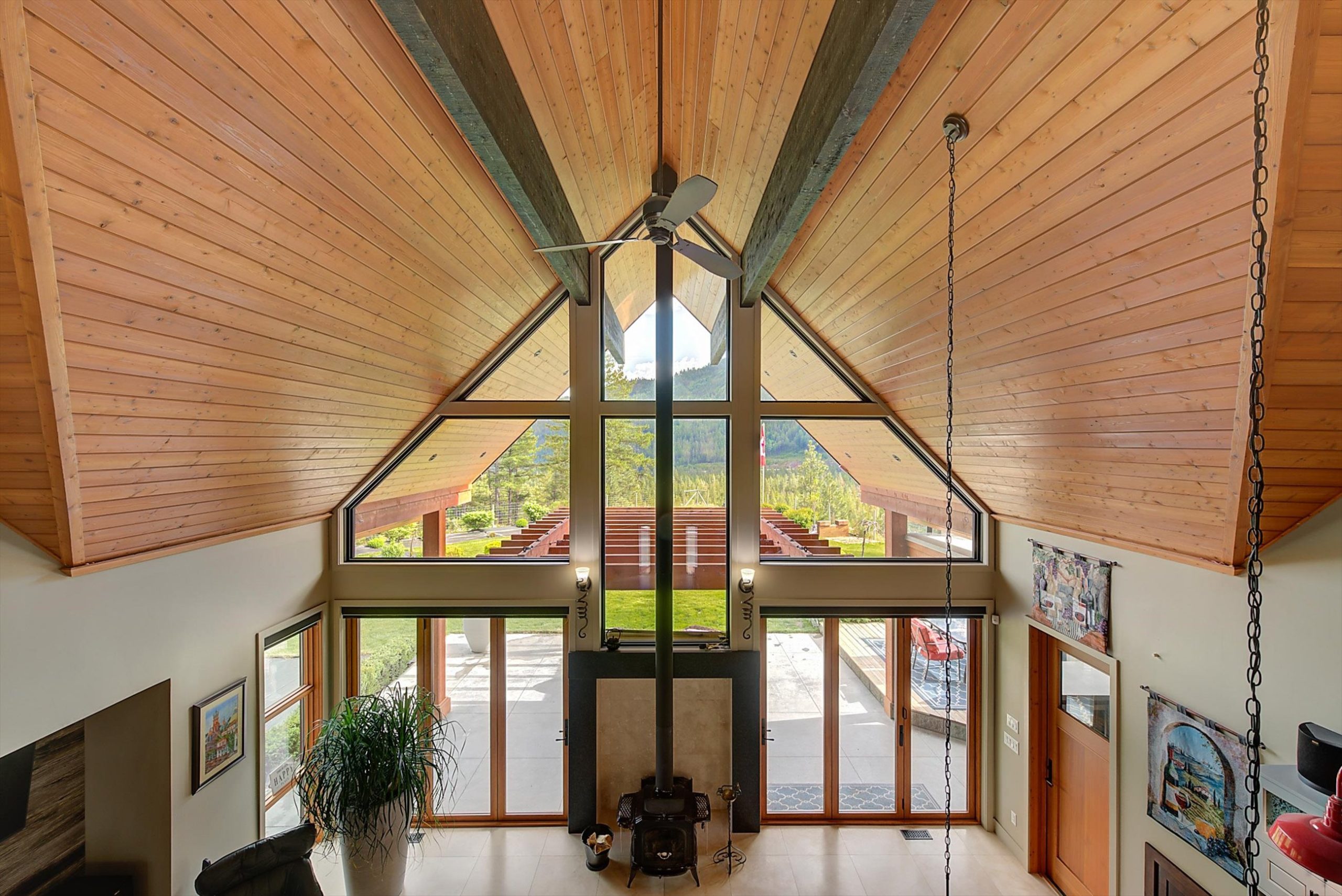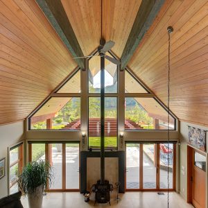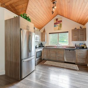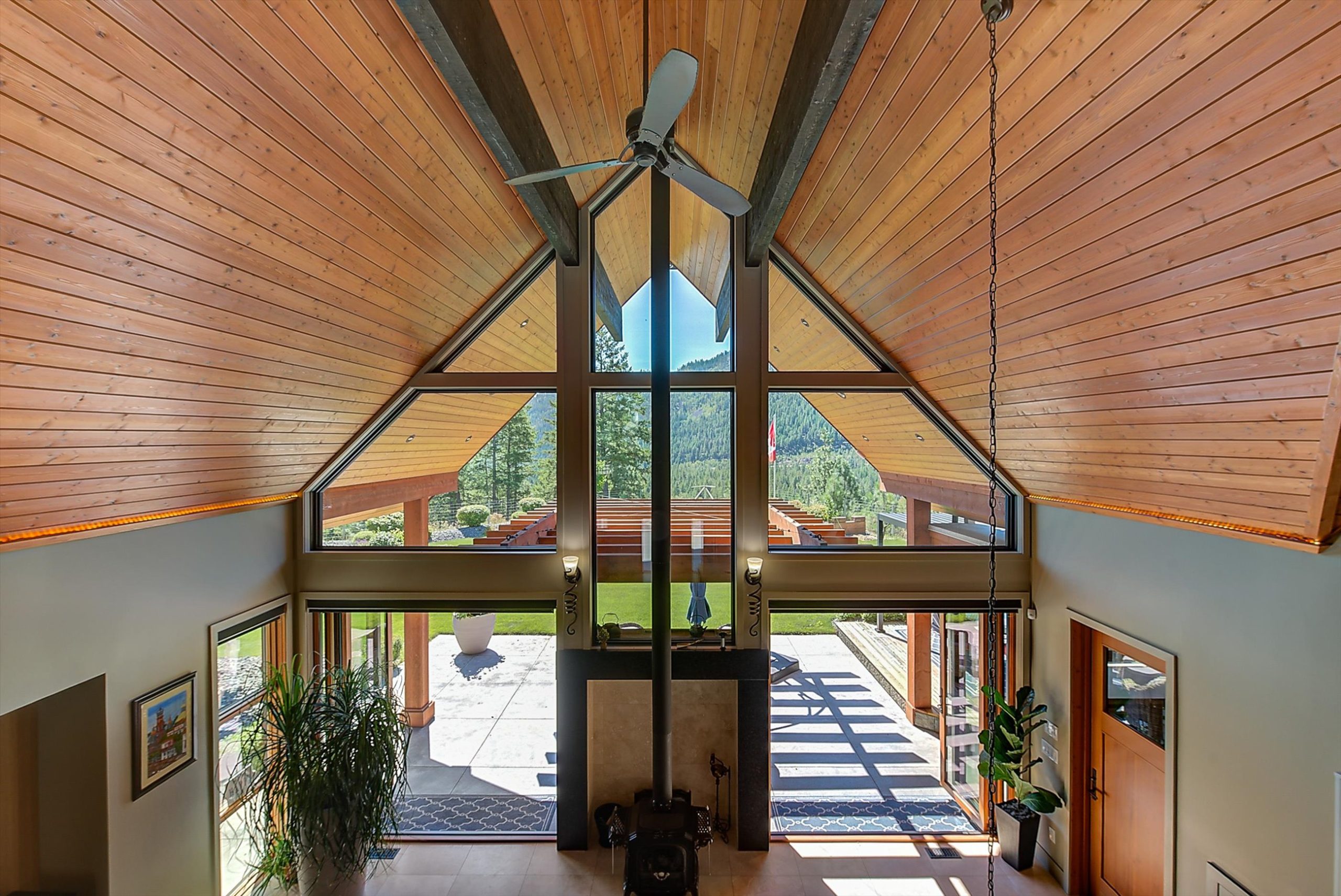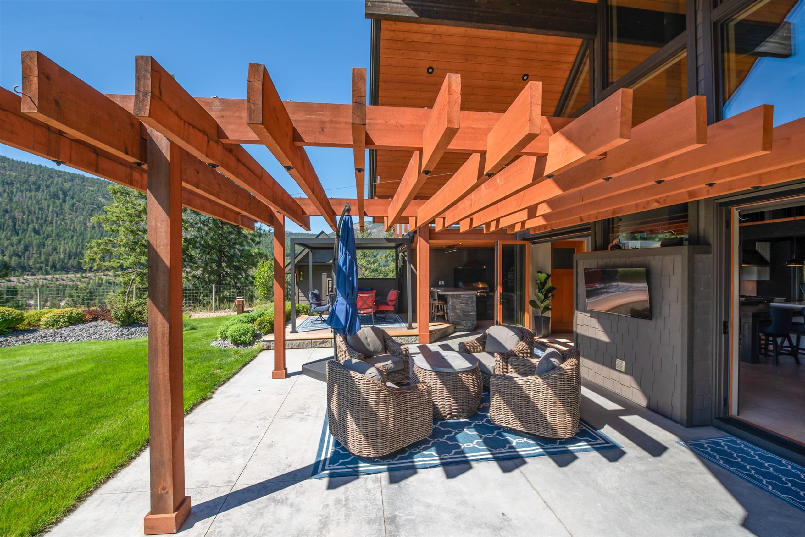 Inside, vaulted ceilings, rich wood detailing, and exposed beams create a warm yet elevated atmosphere. The open-concept main living area is anchored by a chef’s kitchen with quartz surfaces, premium appliances, and an oversized island, seamlessly connecting to the dining and living areas and extending to a covered outdoor space with serene views.