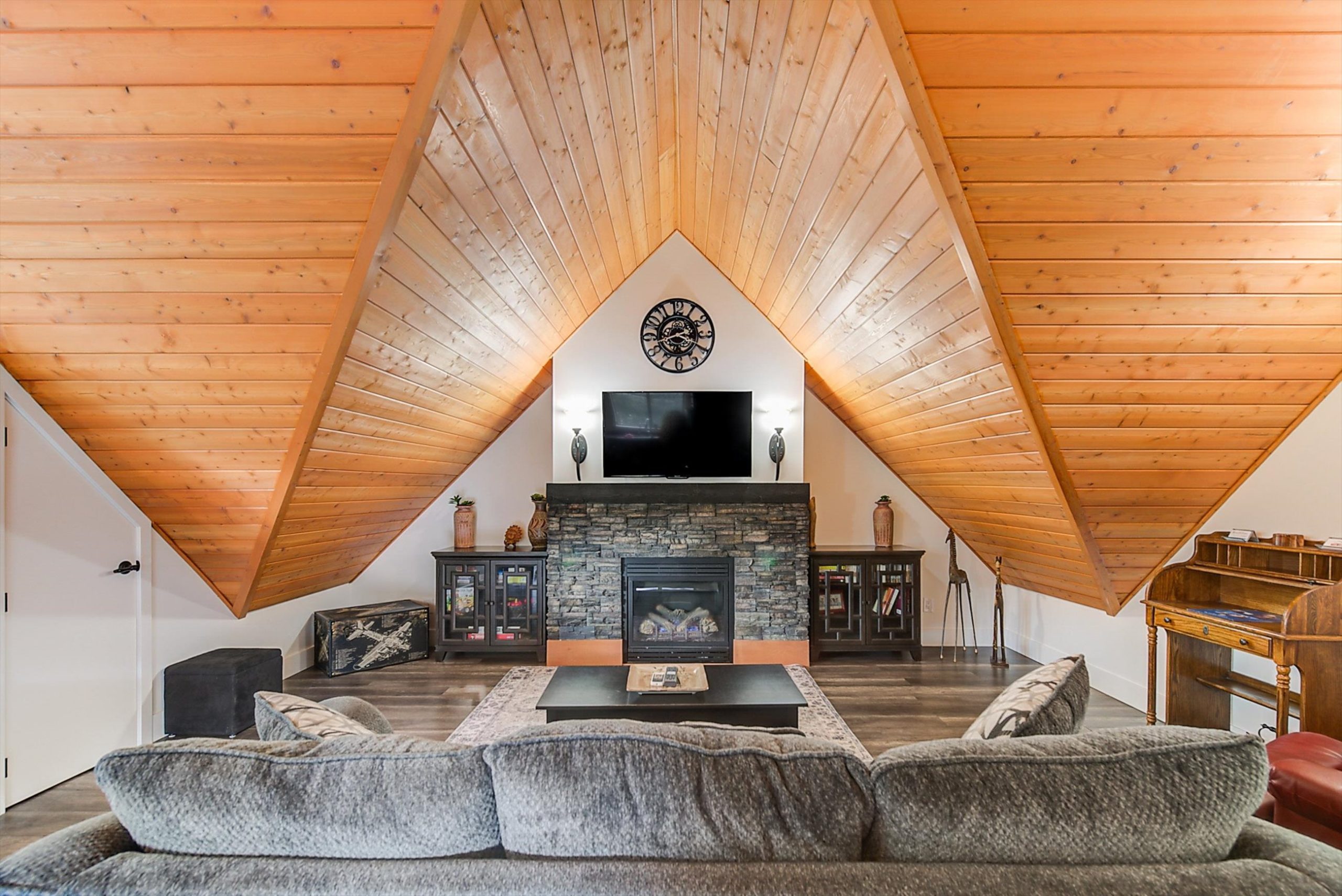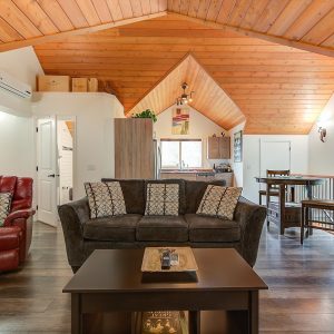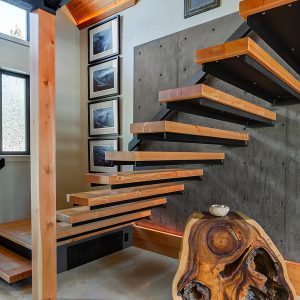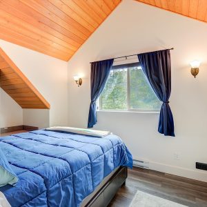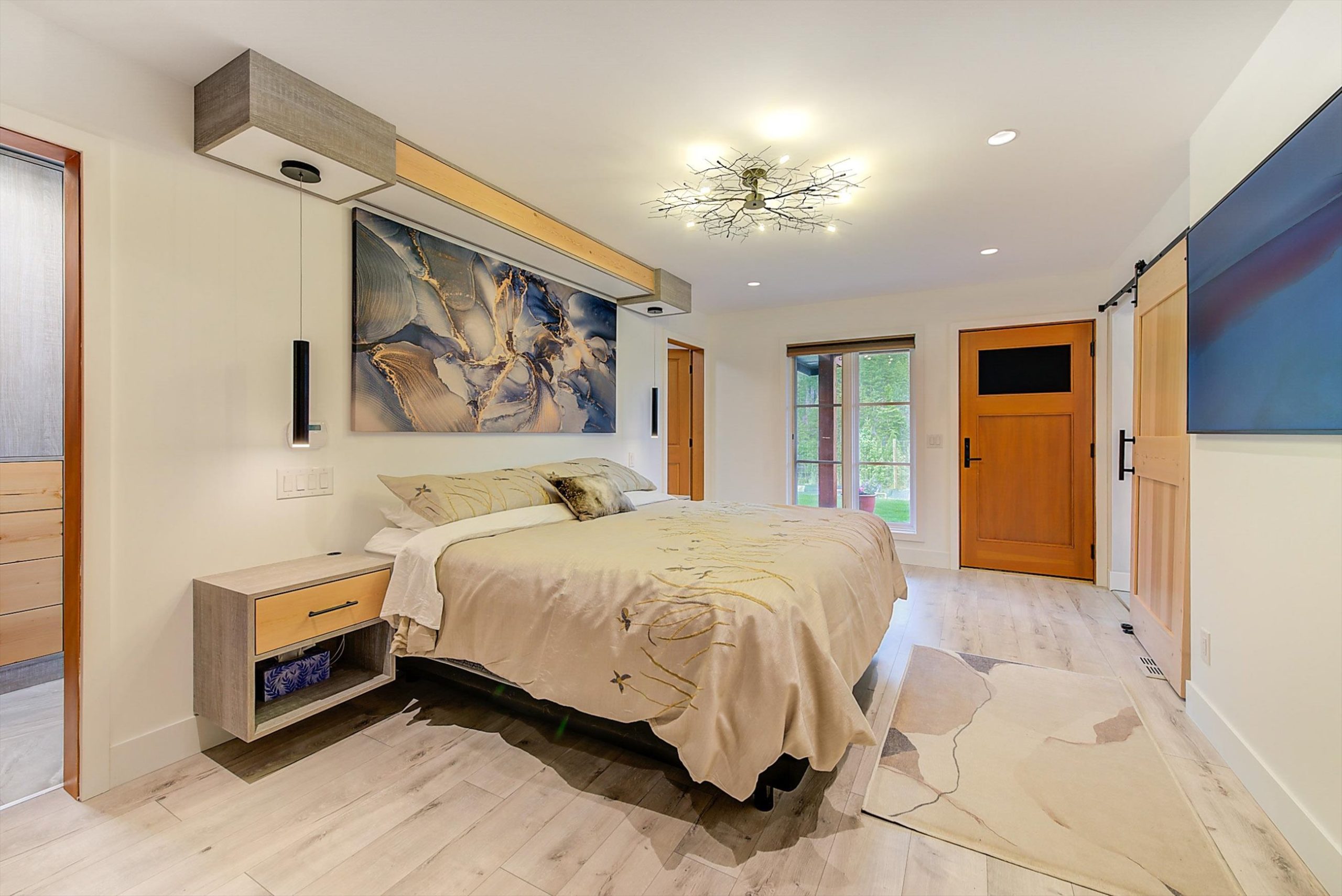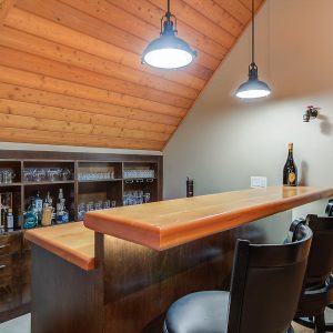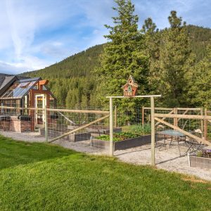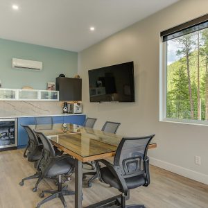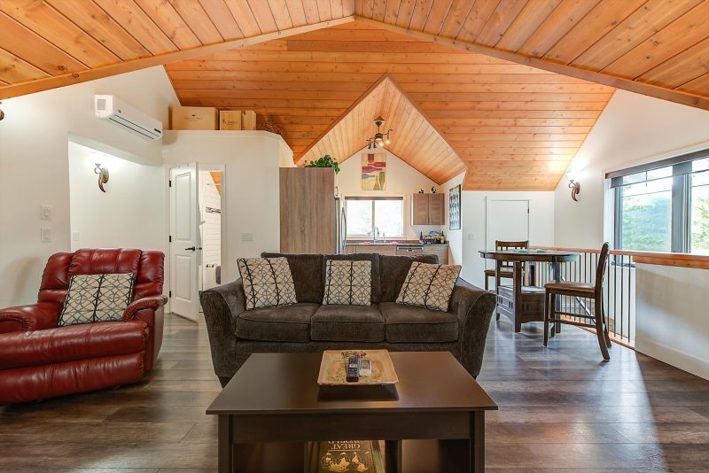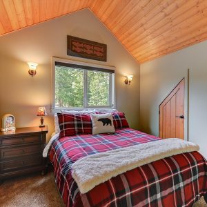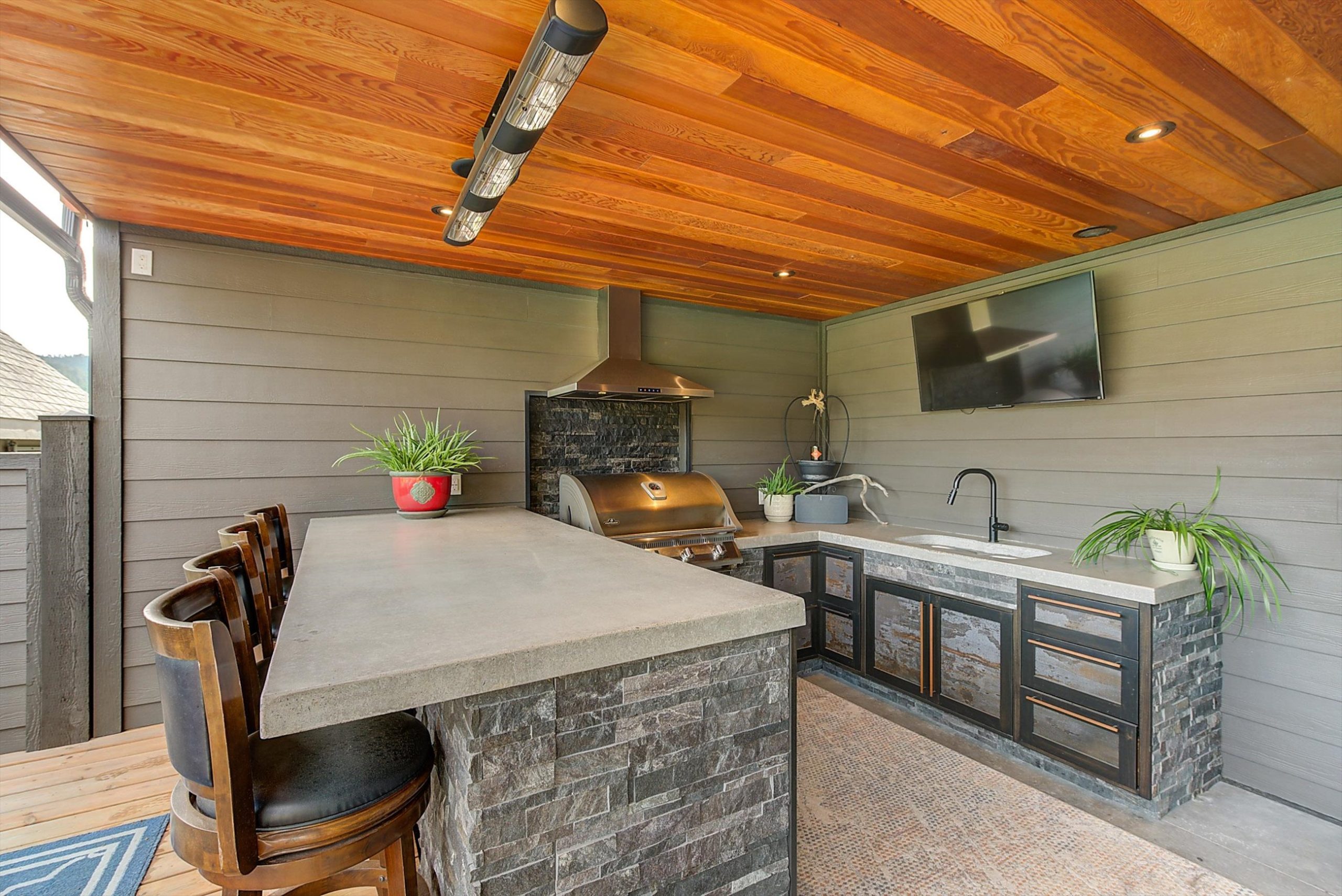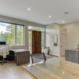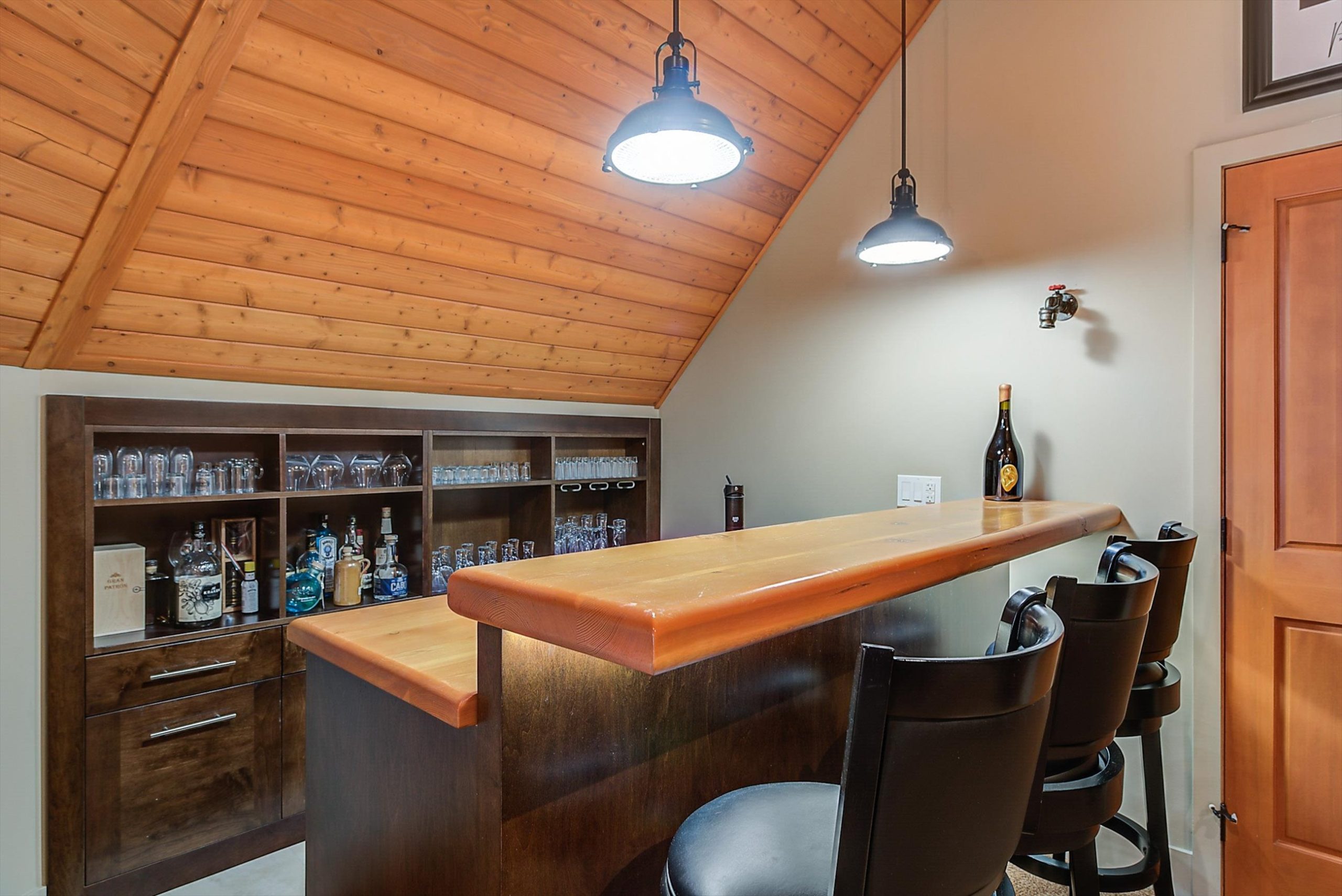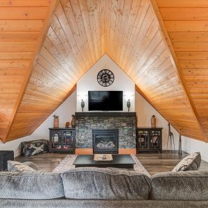 Inside, vaulted ceilings, rich wood detailing, and exposed beams create a warm yet elevated atmosphere. The open-concept main living area is anchored by a chef’s kitchen with quartz surfaces, premium appliances, and an oversized island, seamlessly connecting to the dining and living areas and extending to a covered outdoor space with serene views.