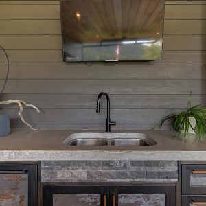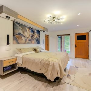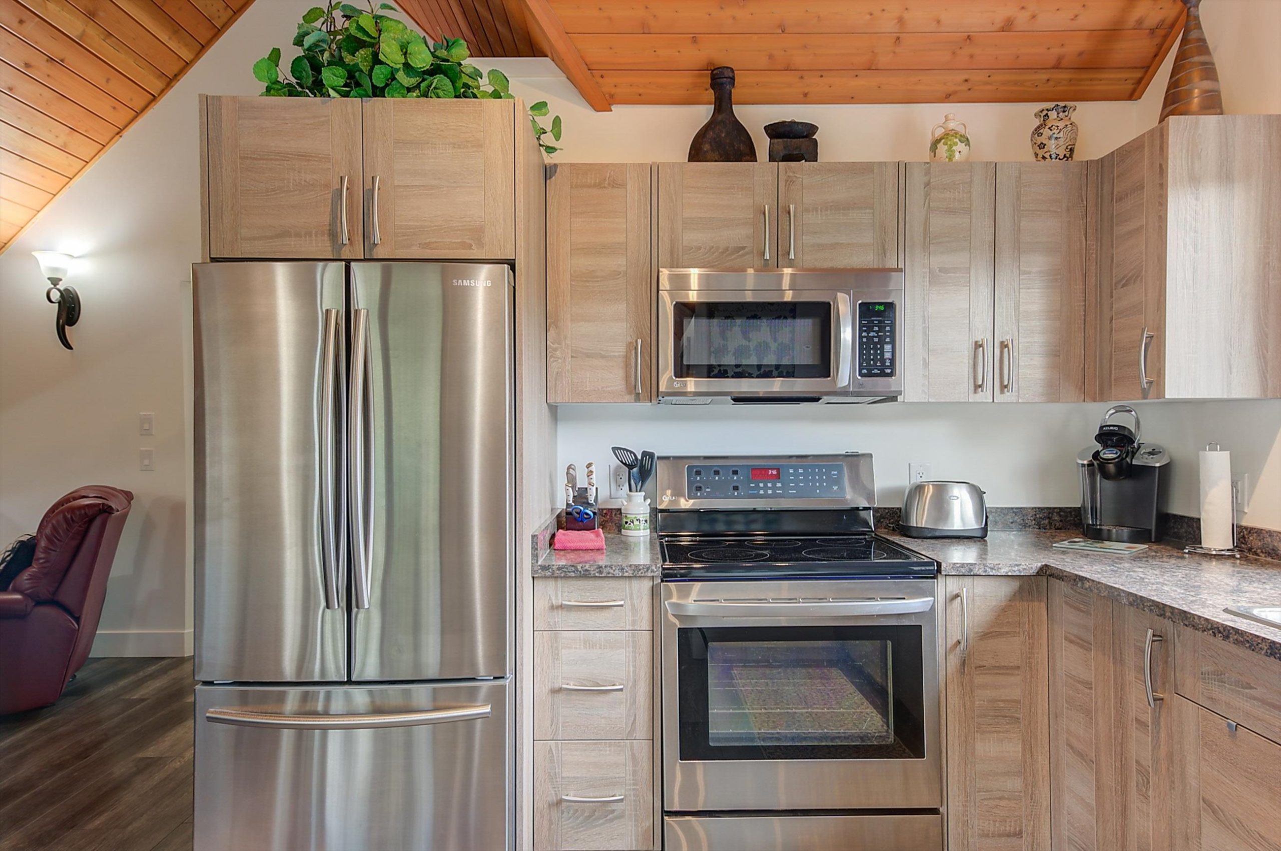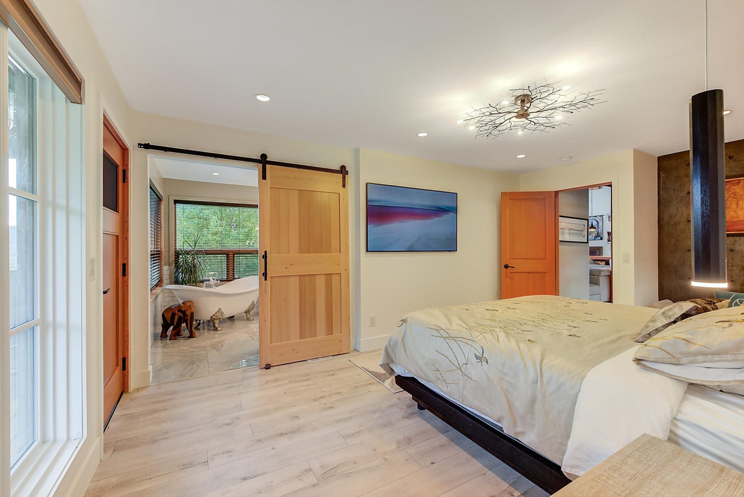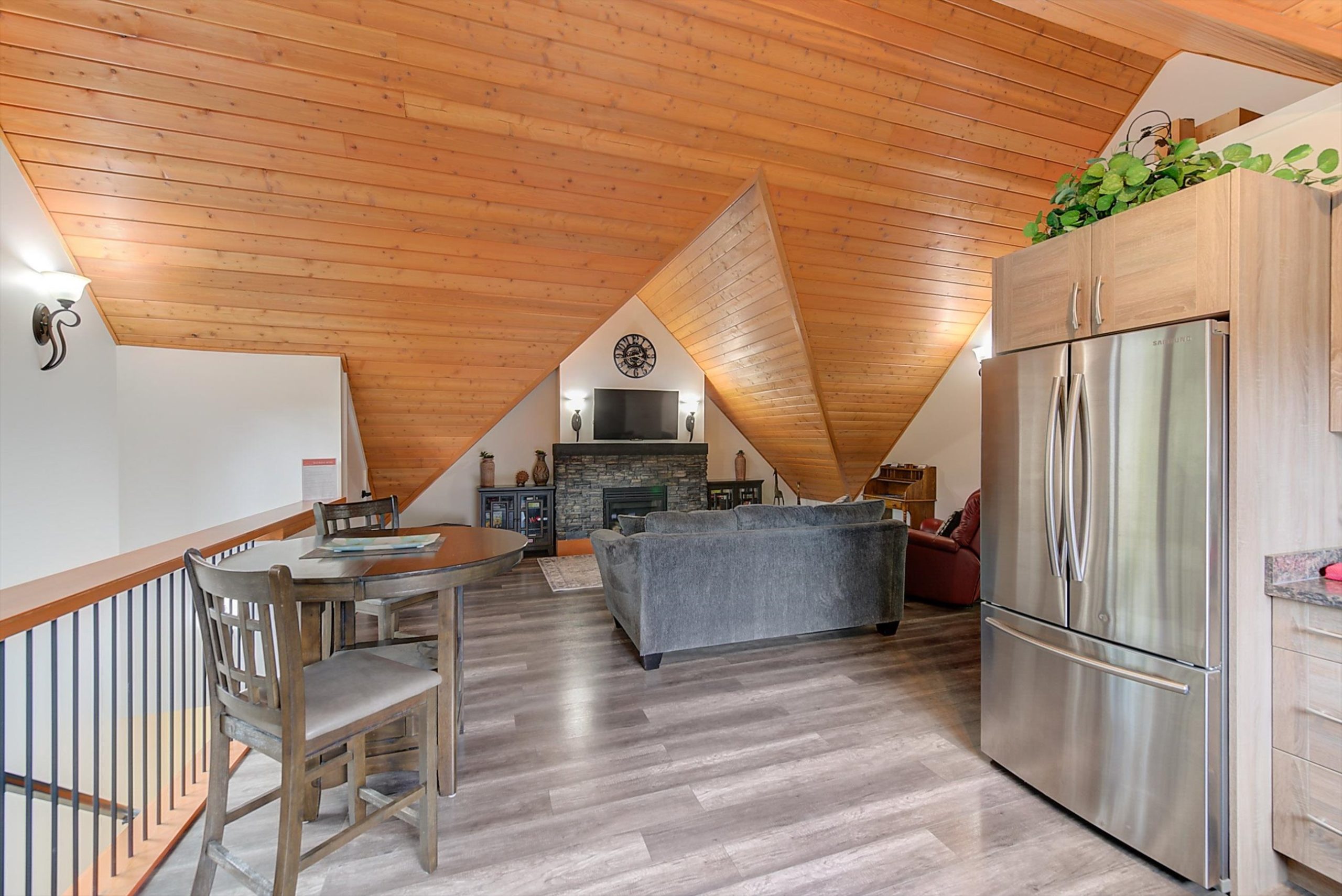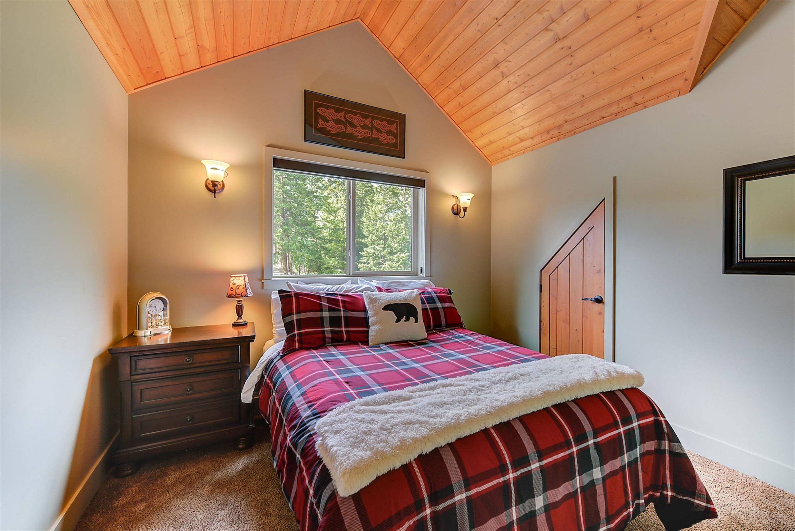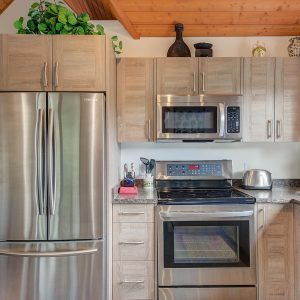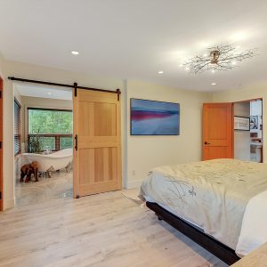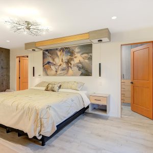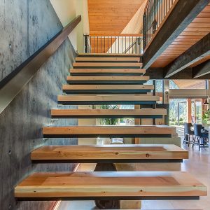 Inside, vaulted ceilings, rich wood detailing, and exposed beams create a warm yet elevated atmosphere. The open-concept main living area is anchored by a chef’s kitchen with quartz surfaces, premium appliances, and an oversized island, seamlessly connecting to the dining and living areas and extending to a covered outdoor space with serene views.