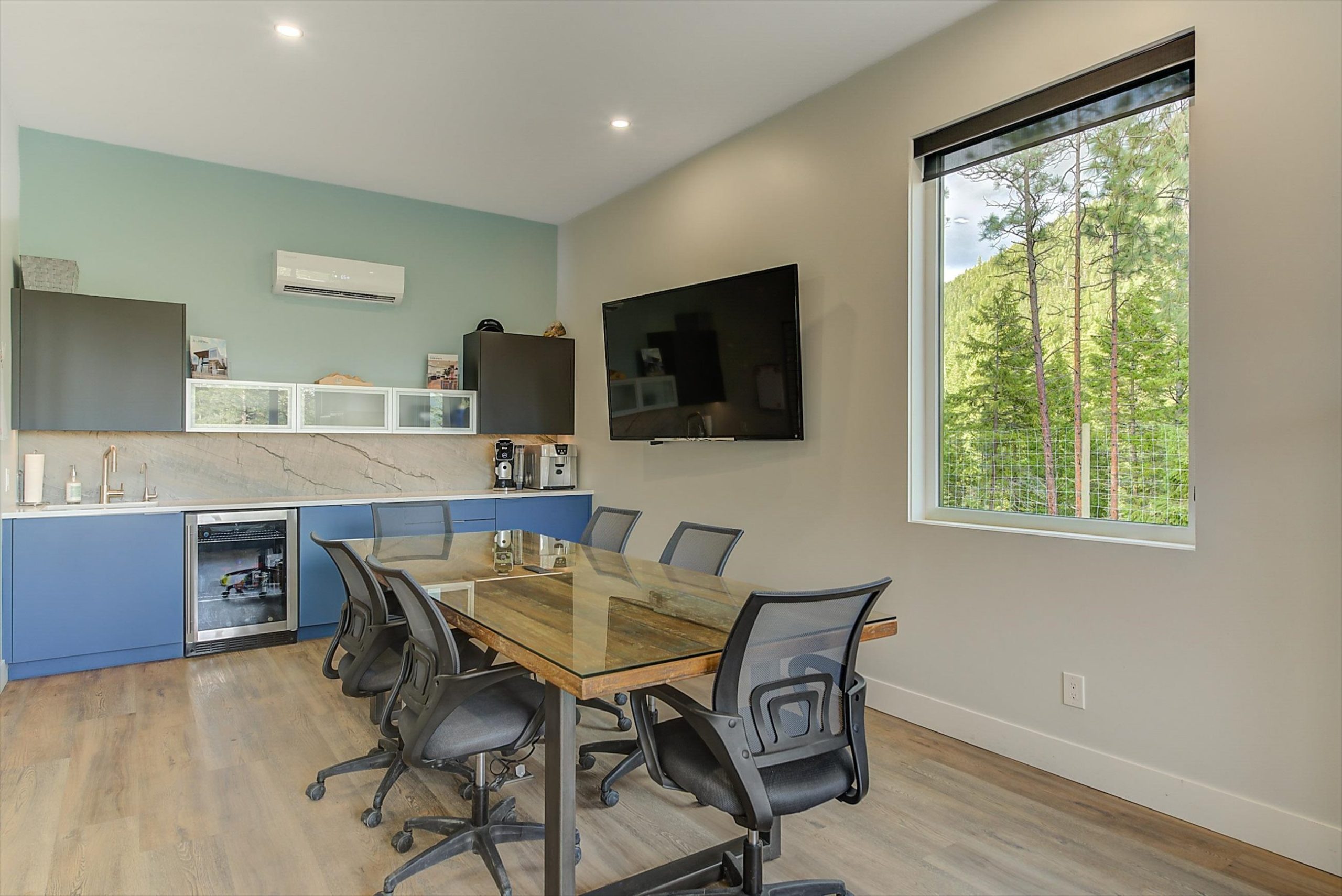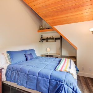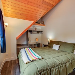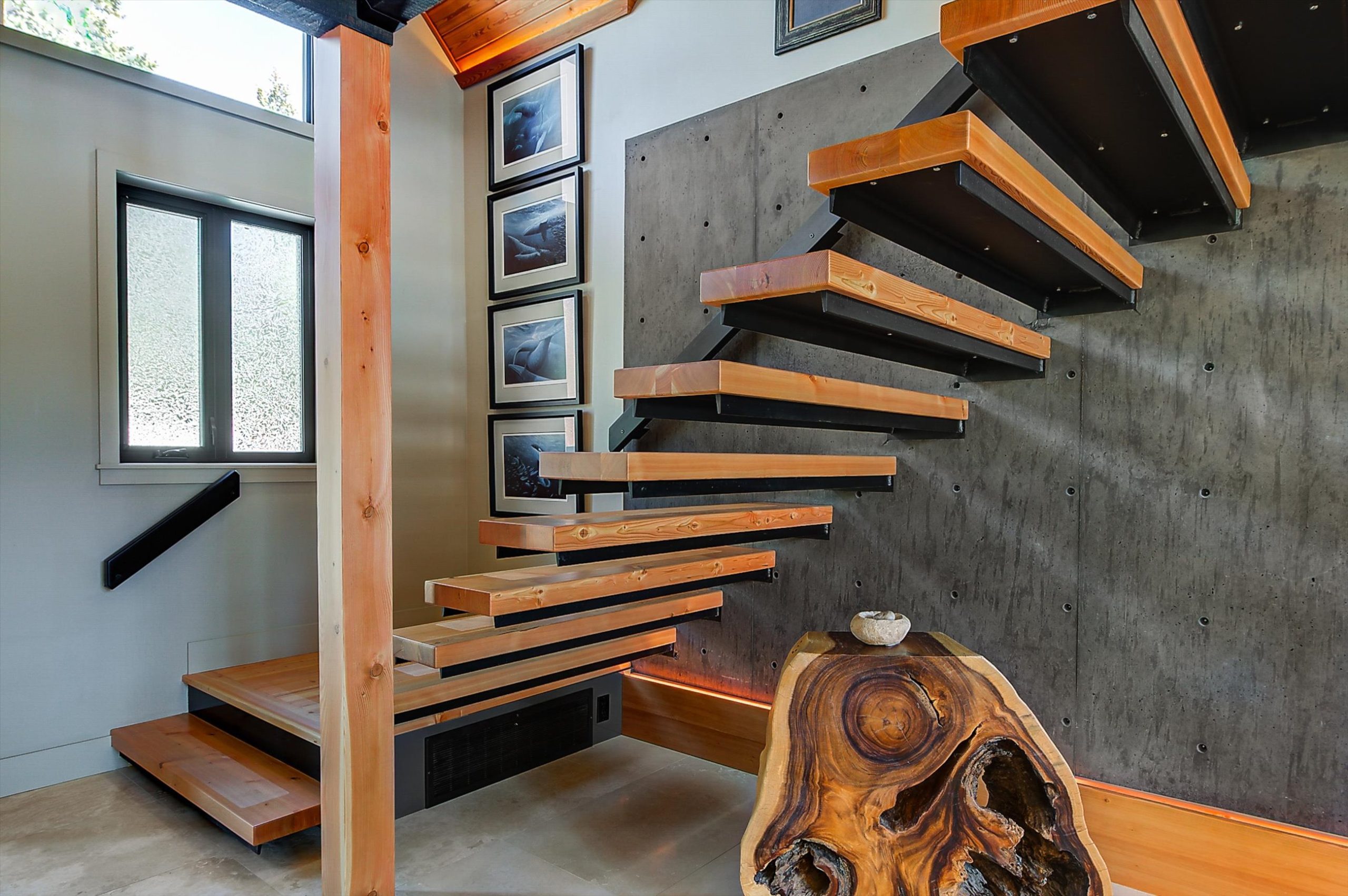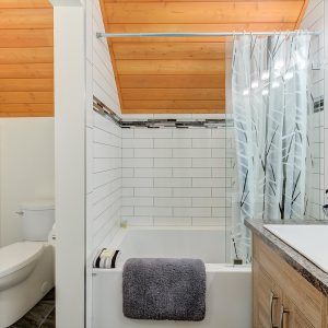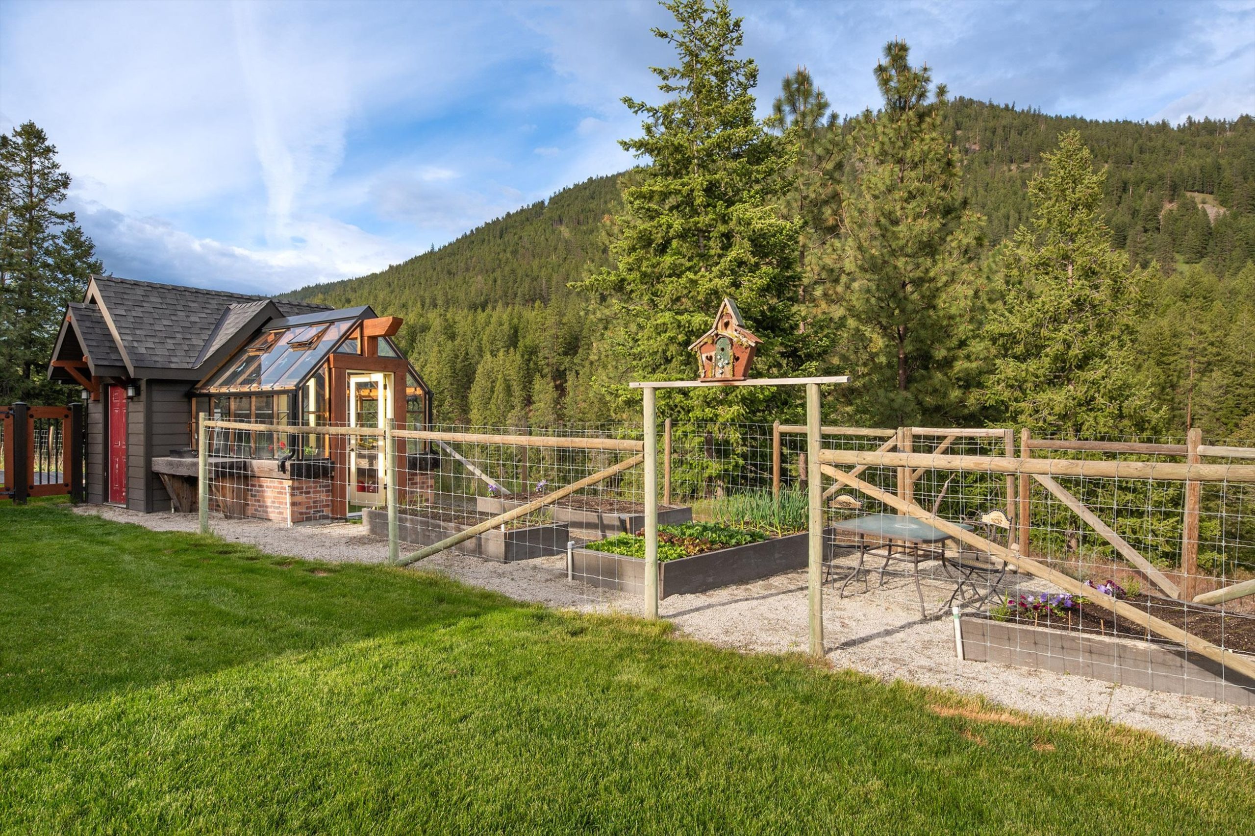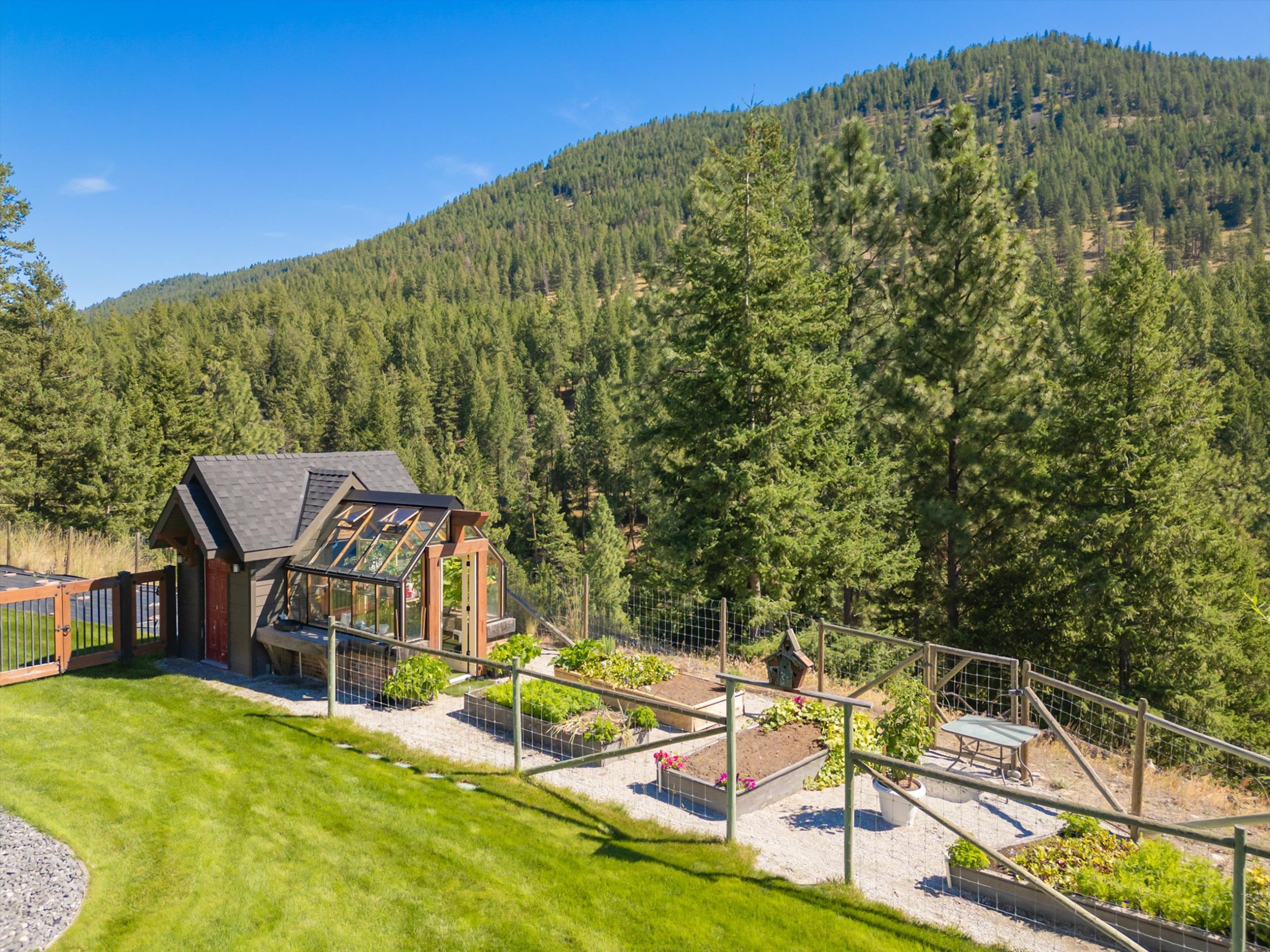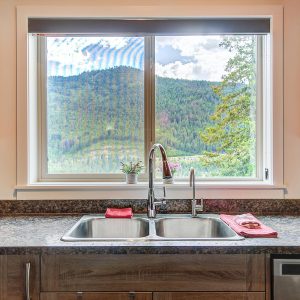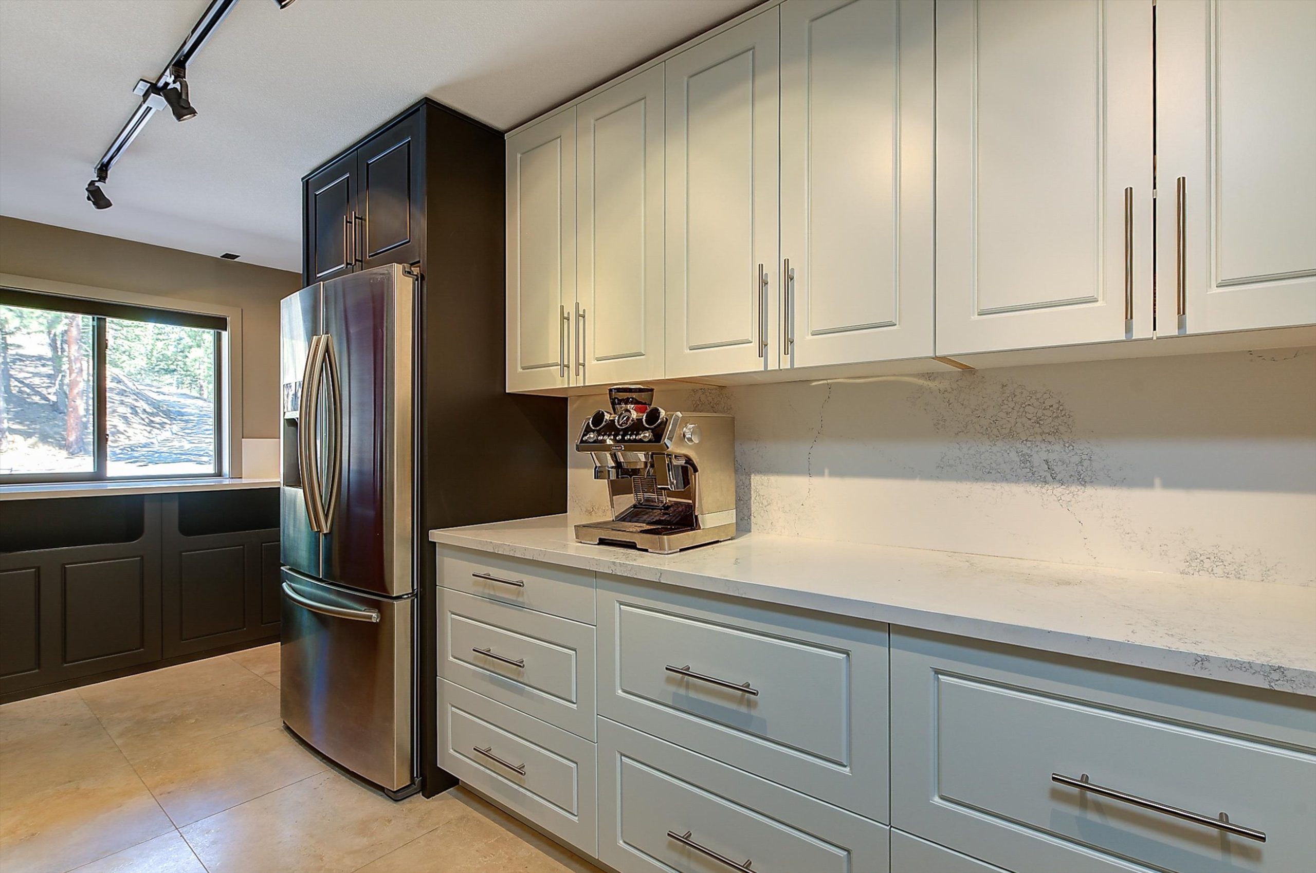 Inside, vaulted ceilings, rich wood detailing, and exposed beams create a warm yet elevated atmosphere. The open-concept main living area is anchored by a chef’s kitchen with quartz surfaces, premium appliances, and an oversized island, seamlessly connecting to the dining and living areas and extending to a covered outdoor space with serene views.
